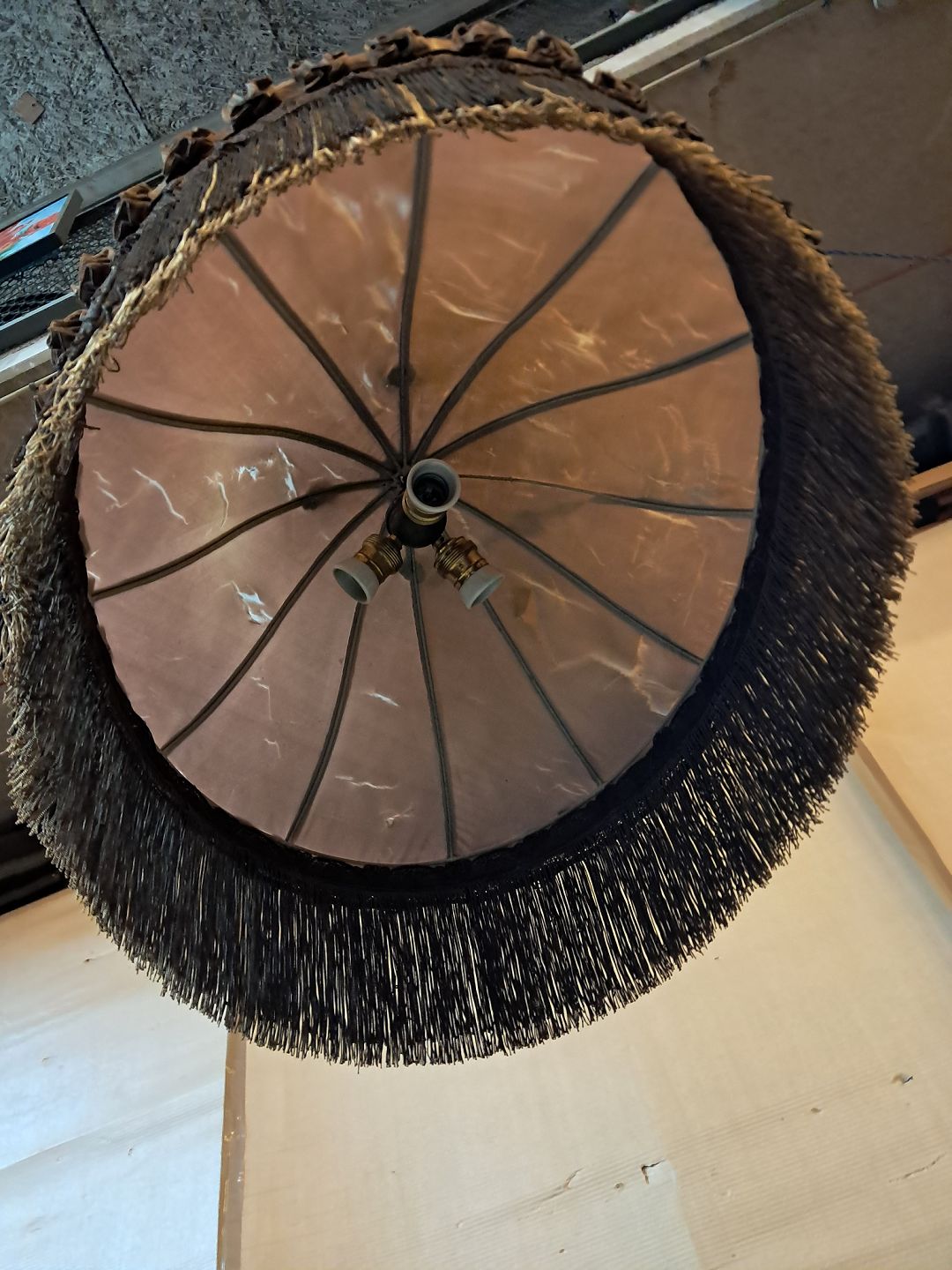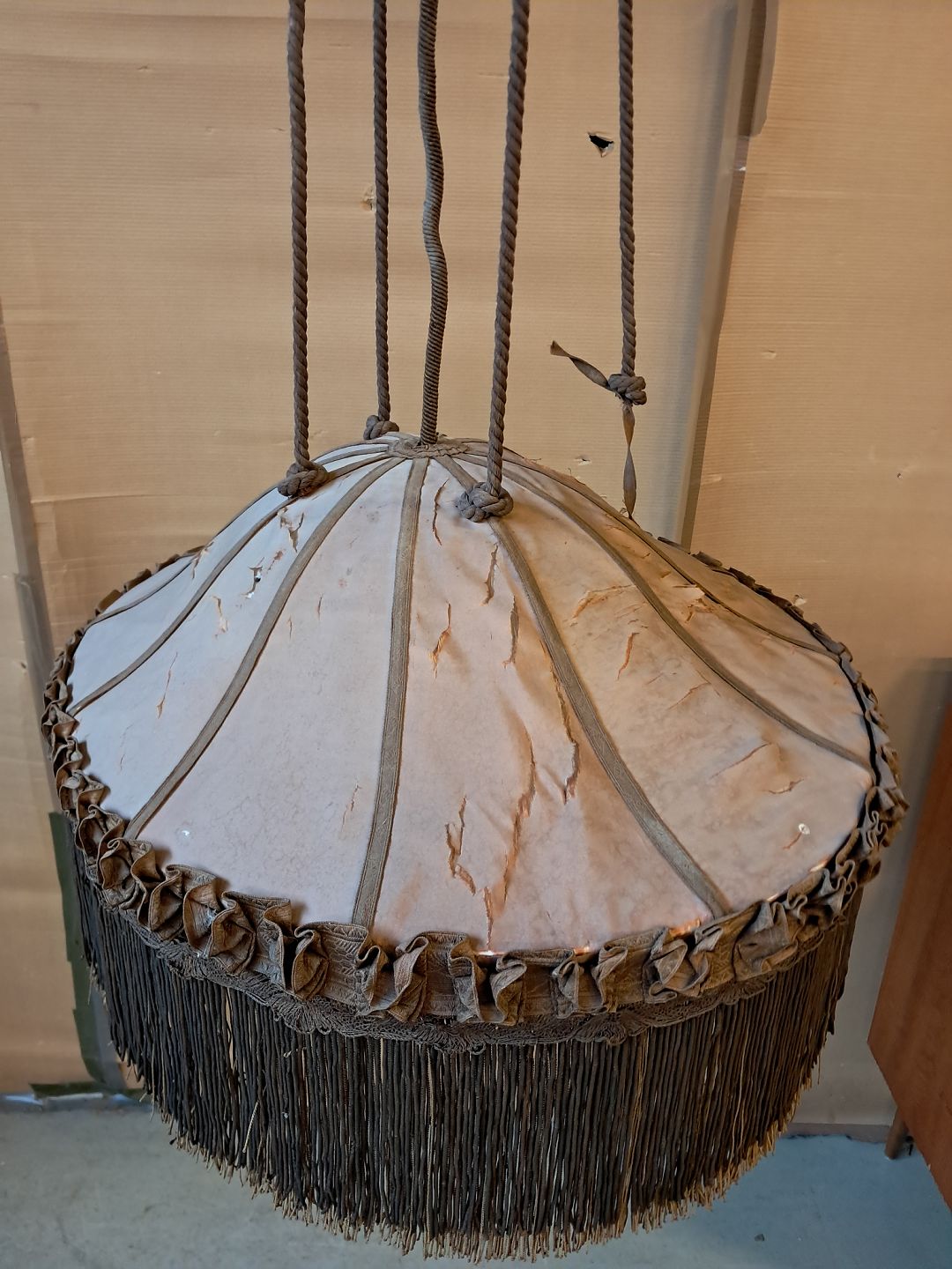 Loftlampe med snoreophæng, fra 1920erne. Den har defekter. Højde med snor 130cm Højde 35cm Bredde 60cm Længde 80cm Emne nummer: 76412