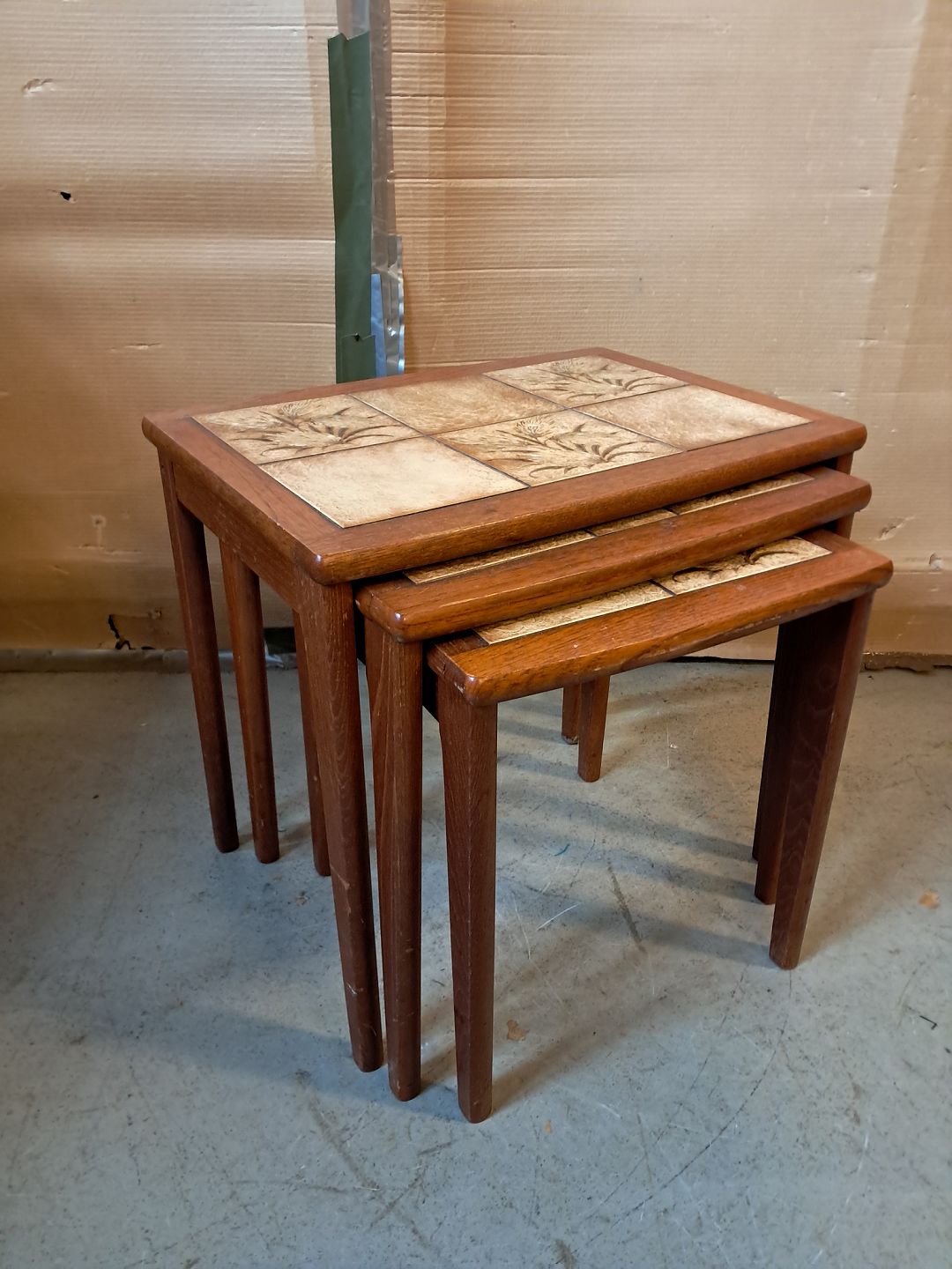3 Indskudsborde i massivt teaktræ med kakler, fra 1970erne. De har brugsspor. Højde 48cm Bredde 53cm Dybde 39cm Emne nummer: 76424
