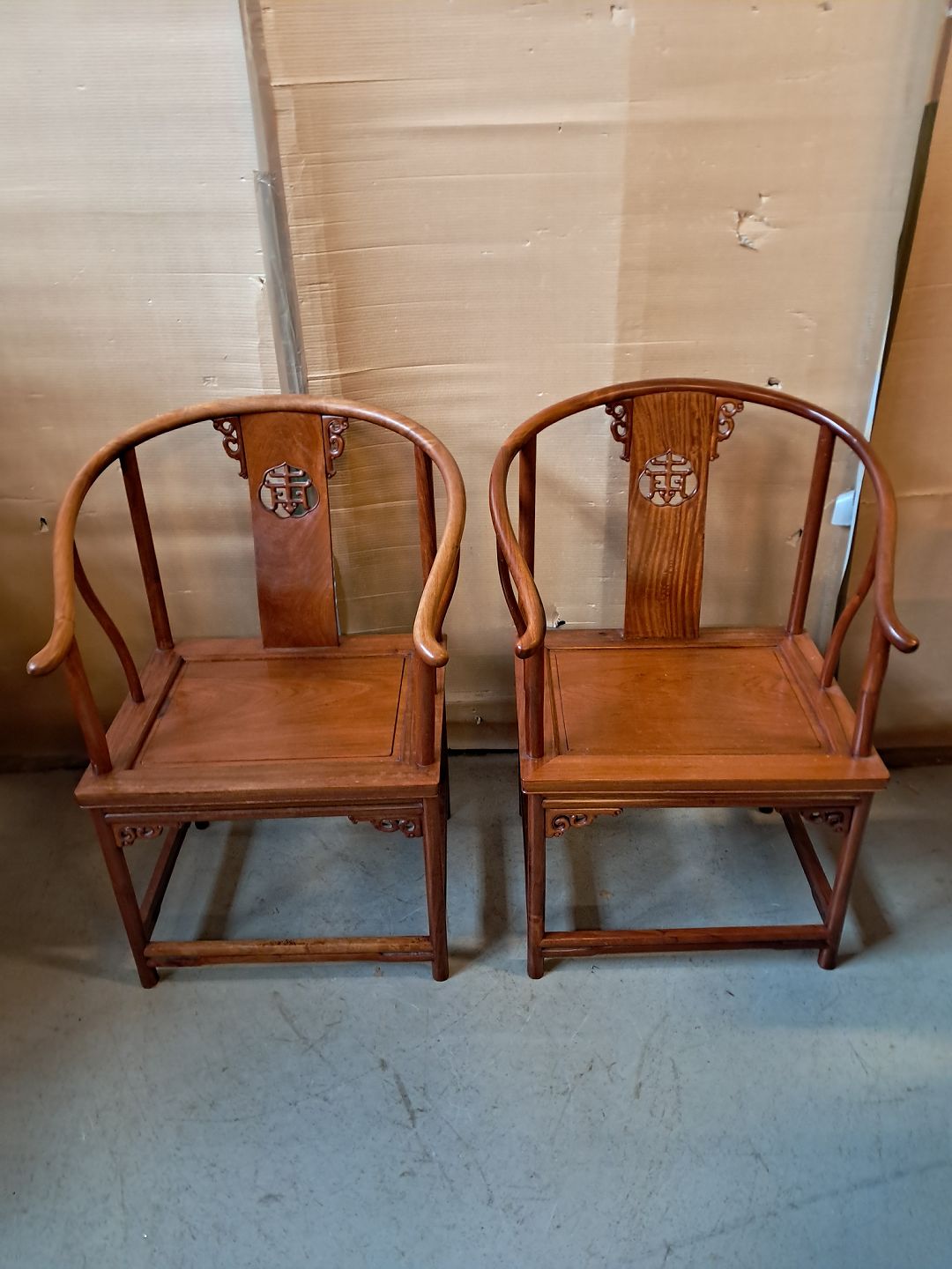 2 Kinesiske stole i massivt træ, fra 1990erne. De har brugsspor. Ryghøjde 93cm Sædehøjde 46cm Emne nummer: 76426