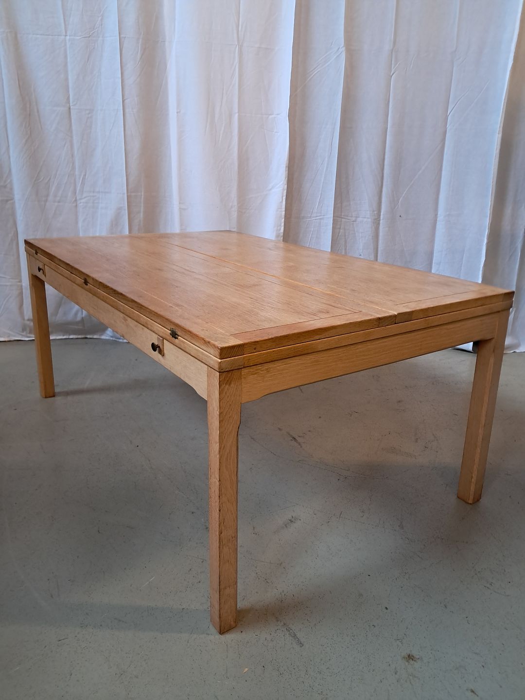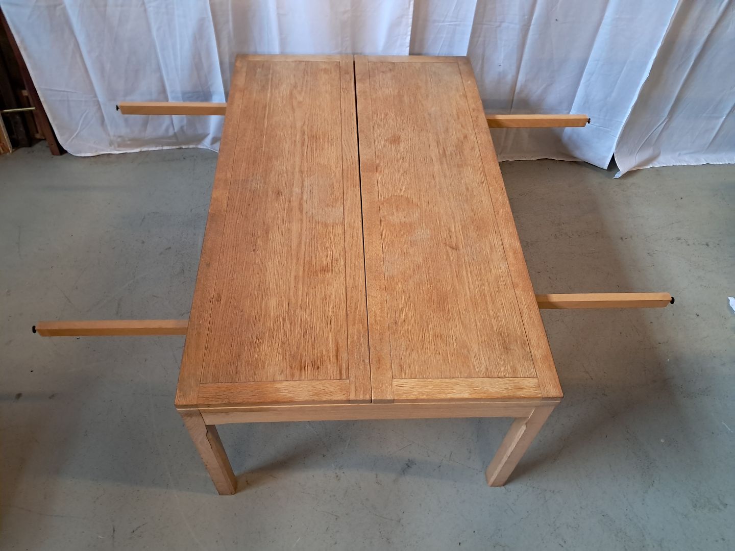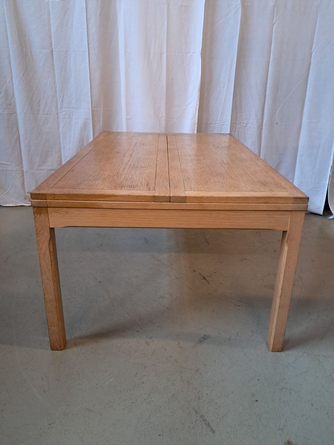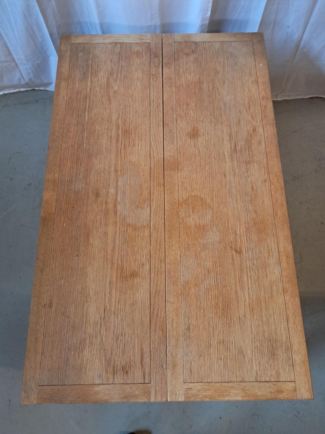 Sofabord i fineret egetræ, fra 1960erne. Det har brugsspor. Højde 54cm Længde 124cm Bredde 76cm Bredde med klapper 138cm Emne nummer: 76542