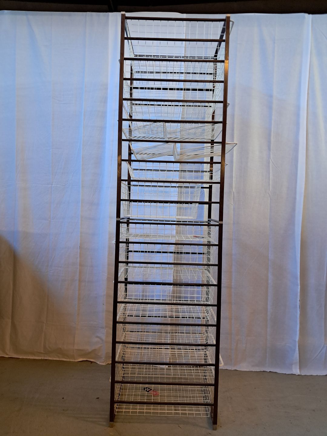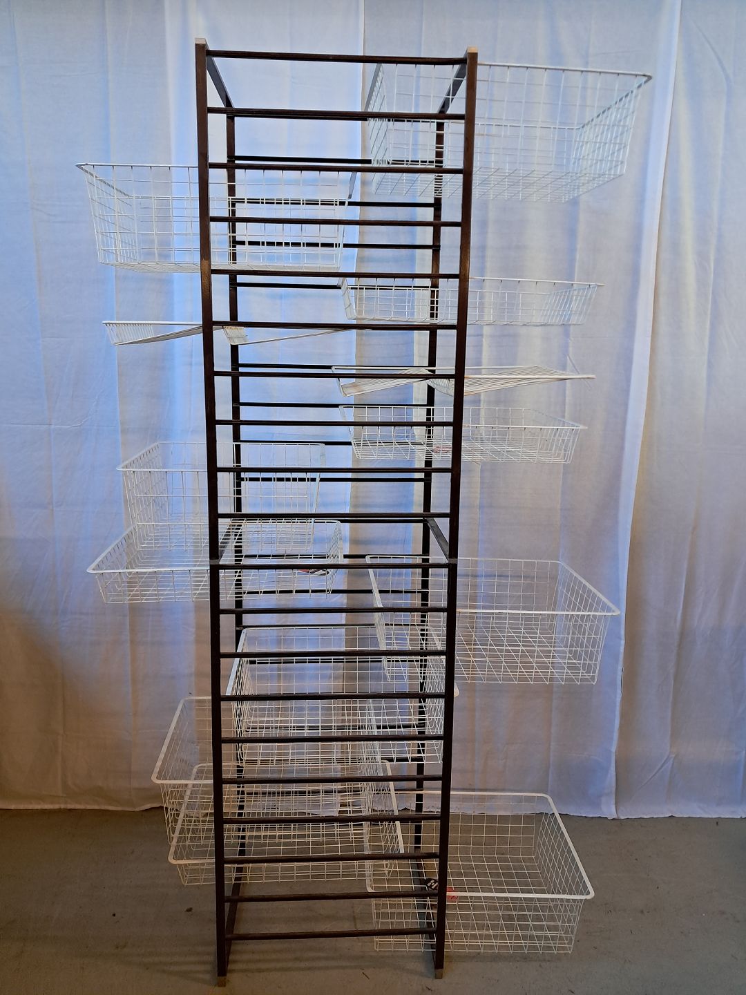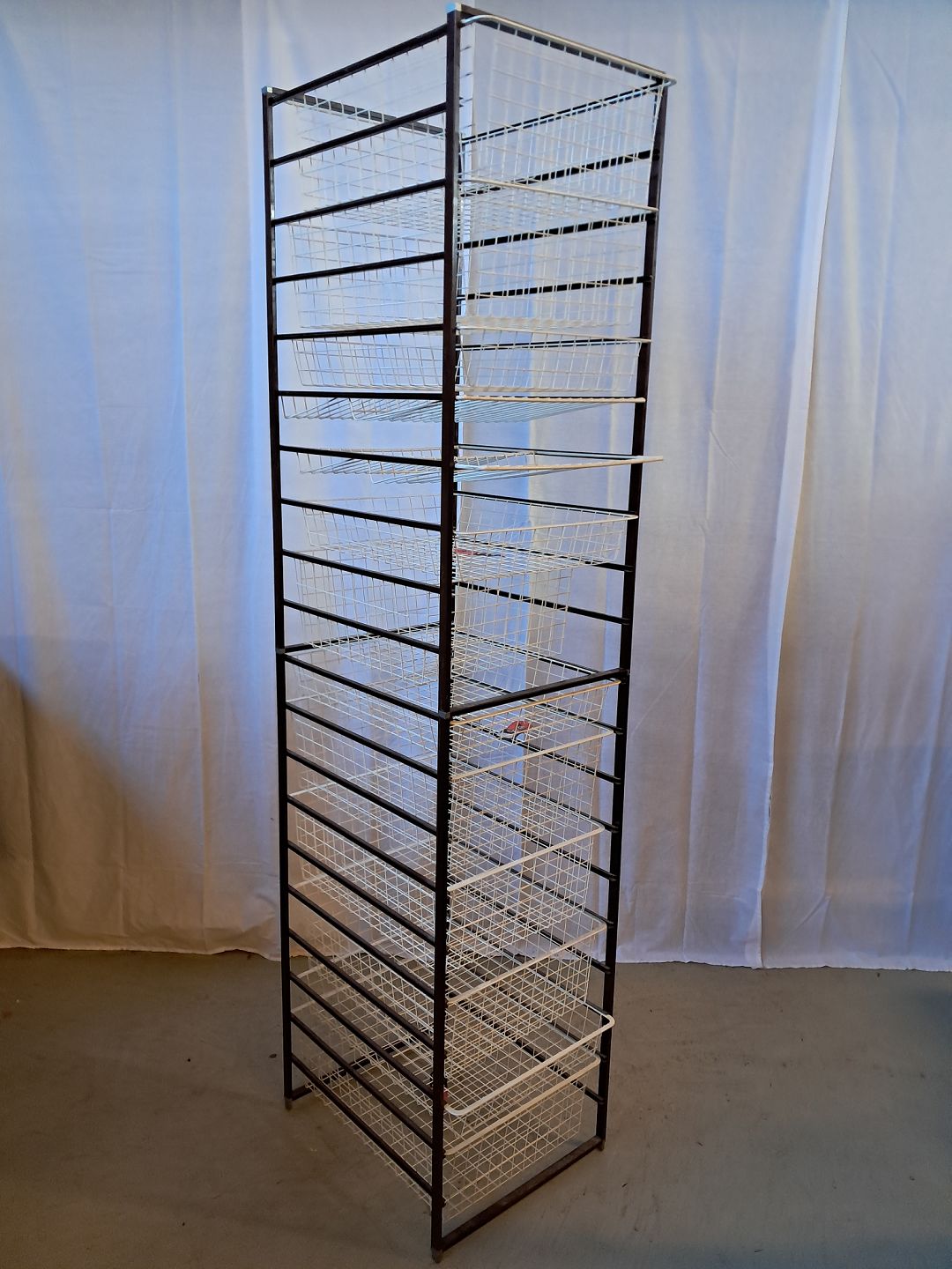 Elfa opbevaringsmøbel i metal med 13 metalkurve, fra 1980erne. Det har brugsspor. Højde 205cm Bredde 45cm Dybde 55cm Emne nummer: 76585
