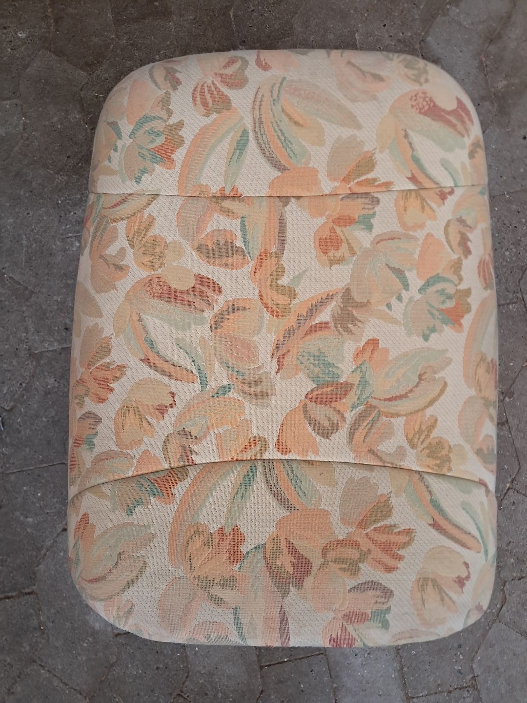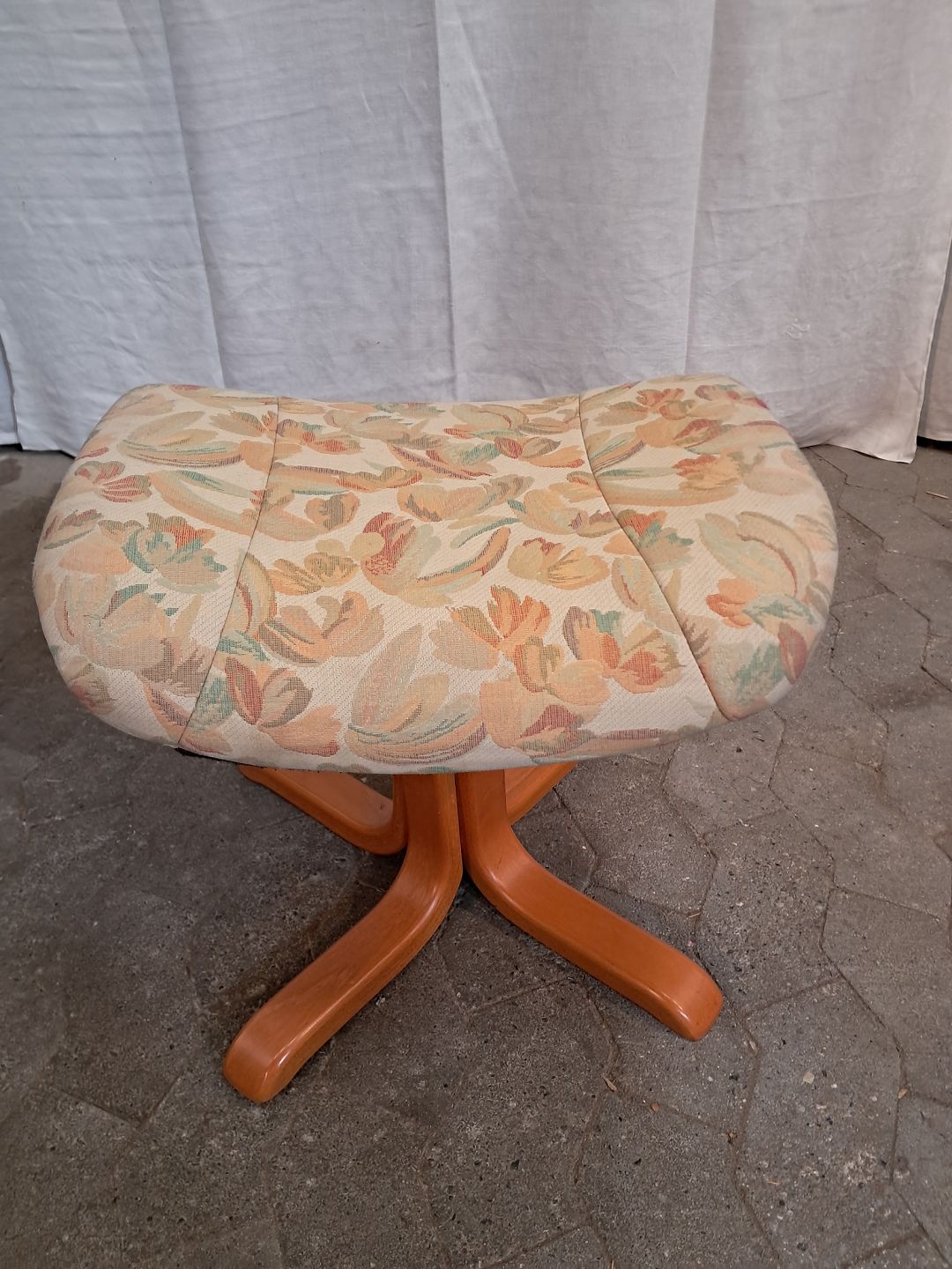 Fodskammel i uldstof og bøg. Kr. 1.800,-