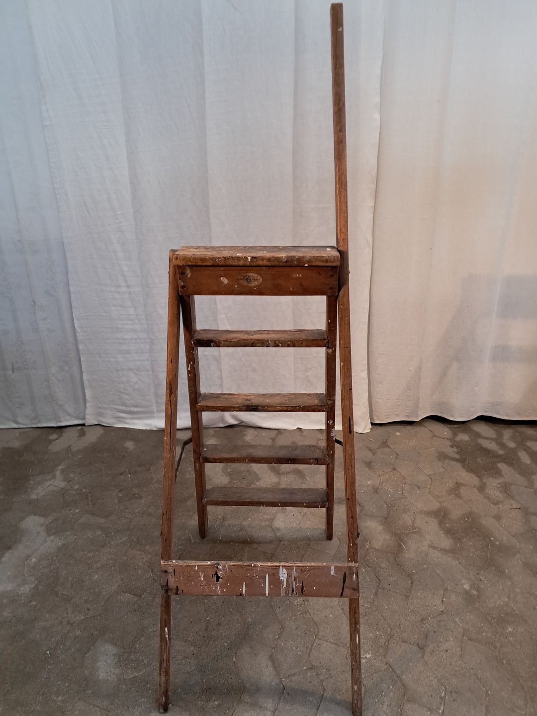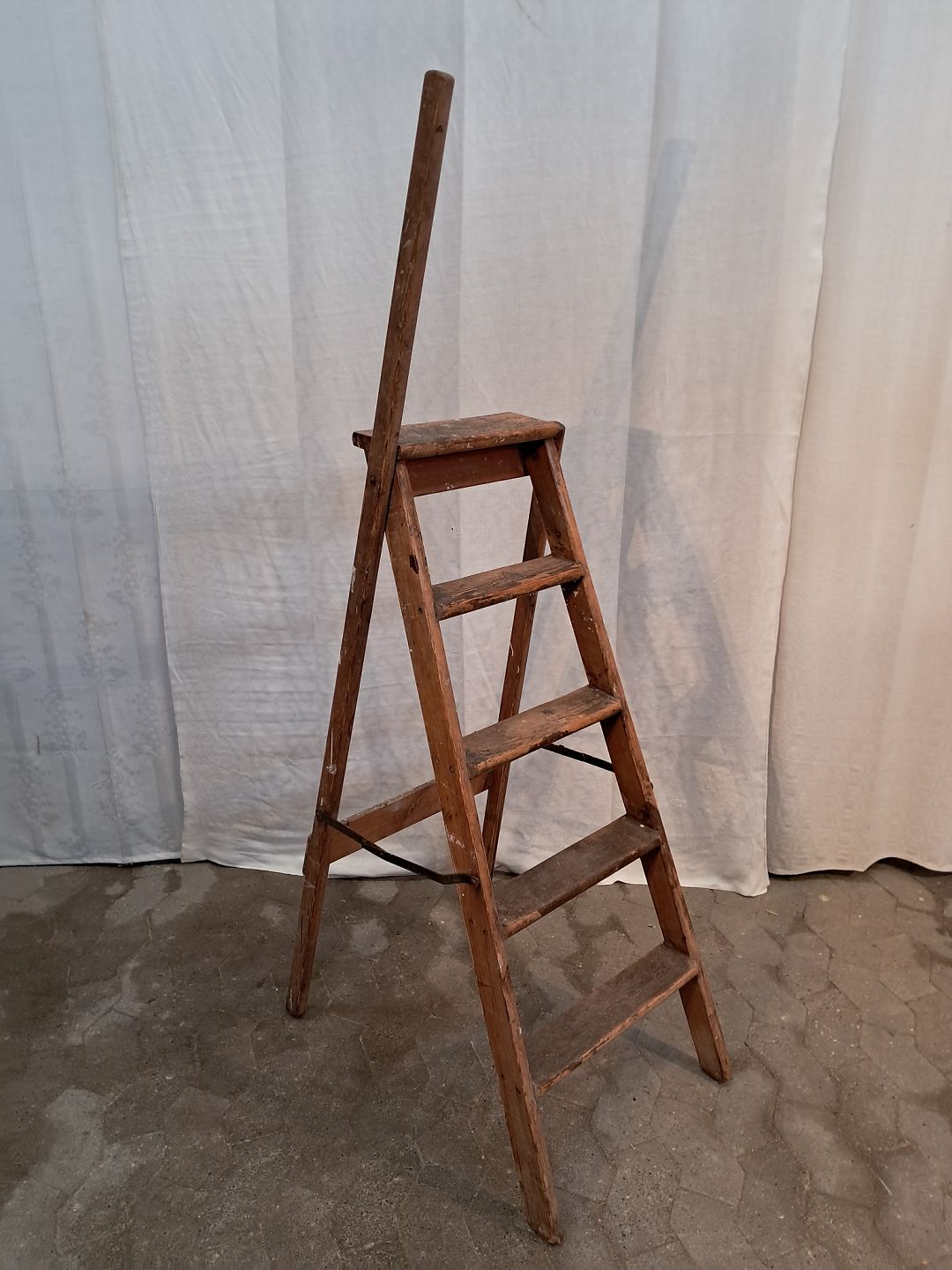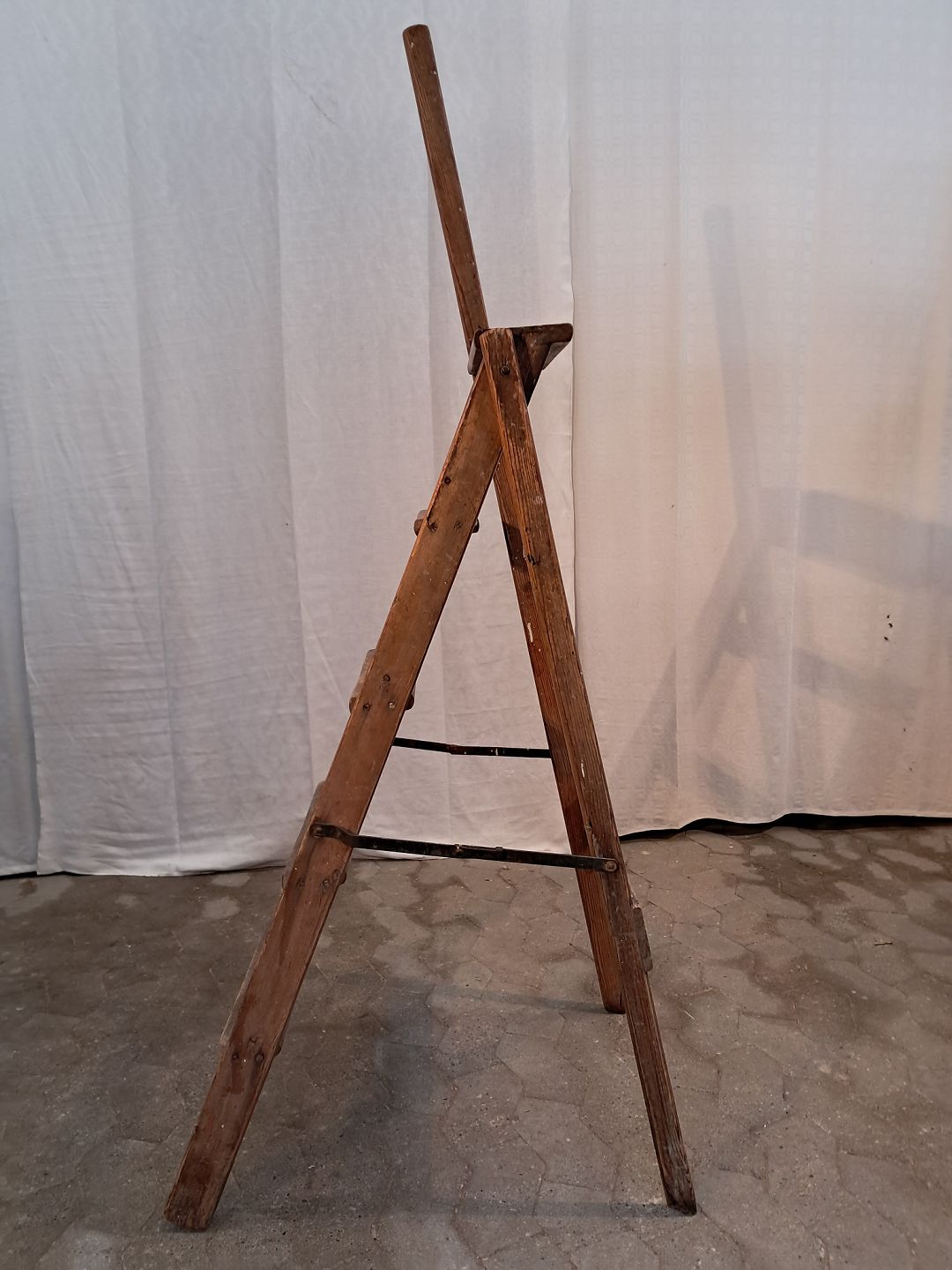 Stige i massivt fyrretræ, fra 1930erne. Den har brugsspor. Højde 167cm Højde på øverste trin 119cm Emne nummer: 91473