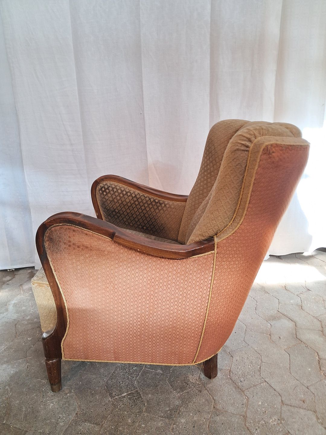 Lænestol i bøgetræ, fra 1950erne. Den har defekt betræk. Ryghøjde 83cm Sædehøjde 40cm Emne nummer: 91486