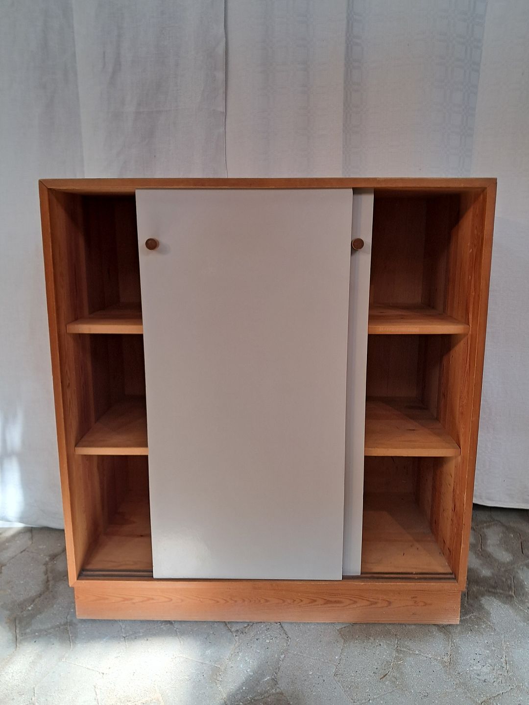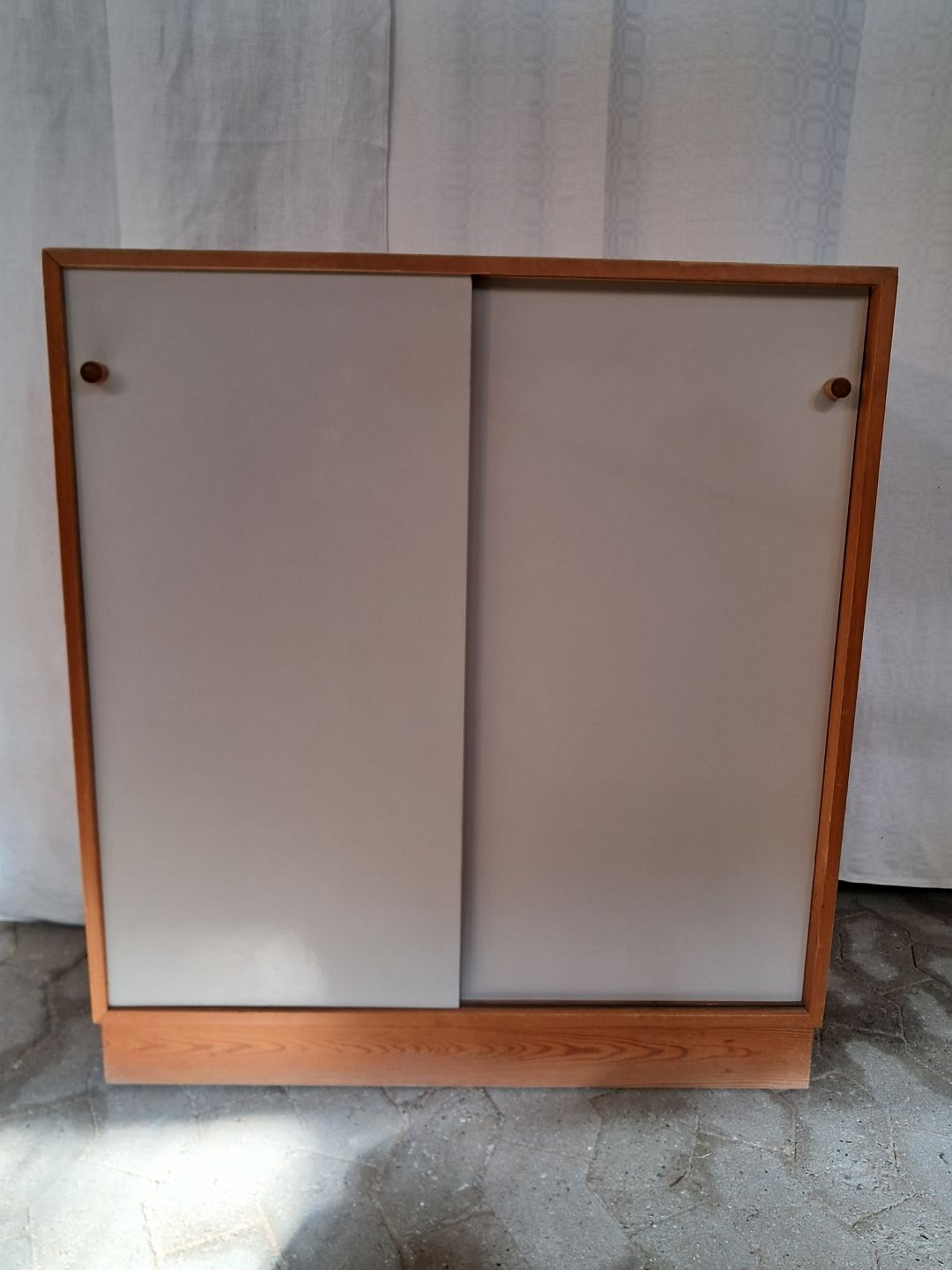 Skab i massivt fyrretræ med malede låger, fra 1970erne. Det har brugsspor. Højde 89cm Bredde 80cm Dybde 41cm Emne nummer: 91495