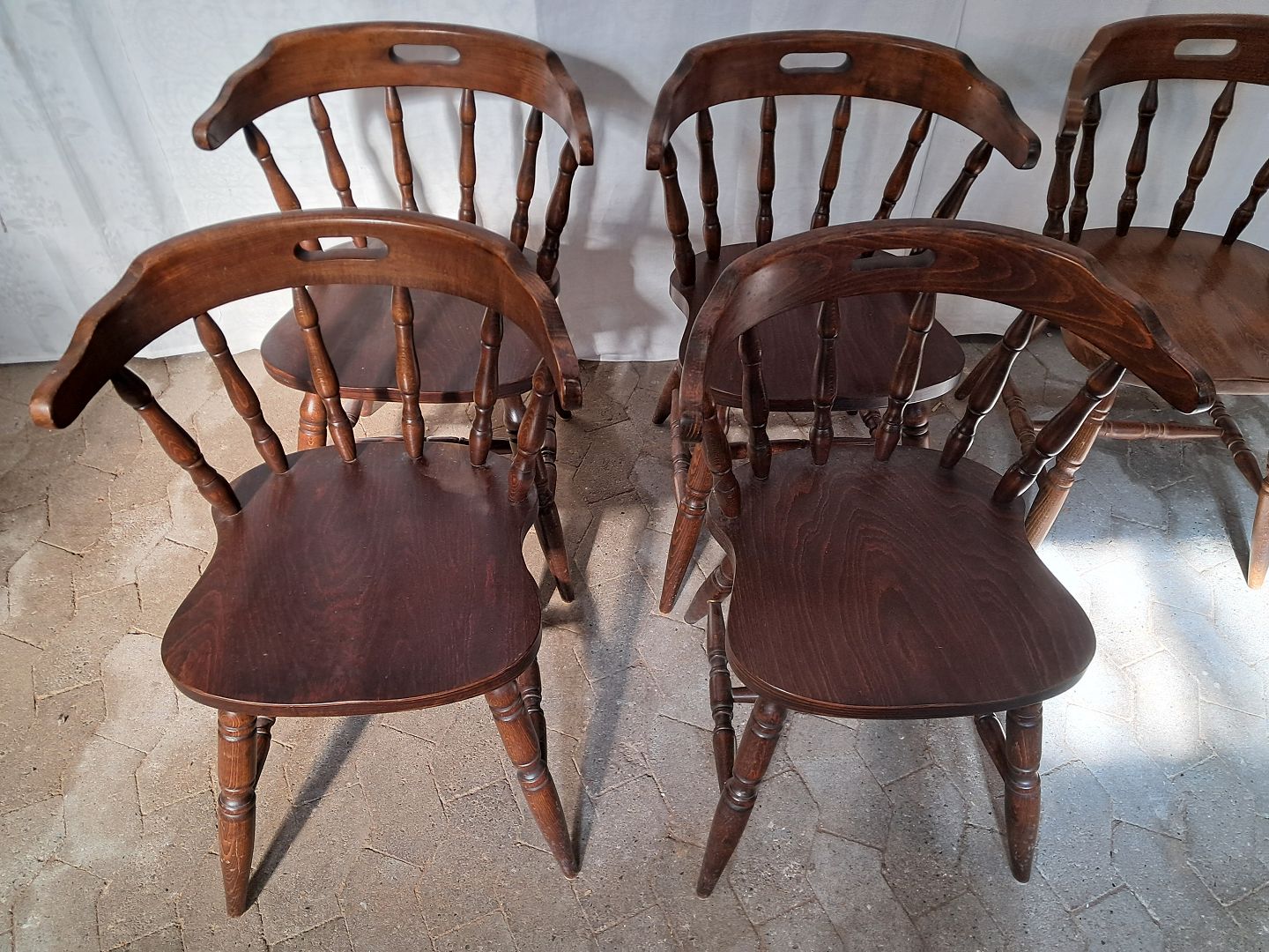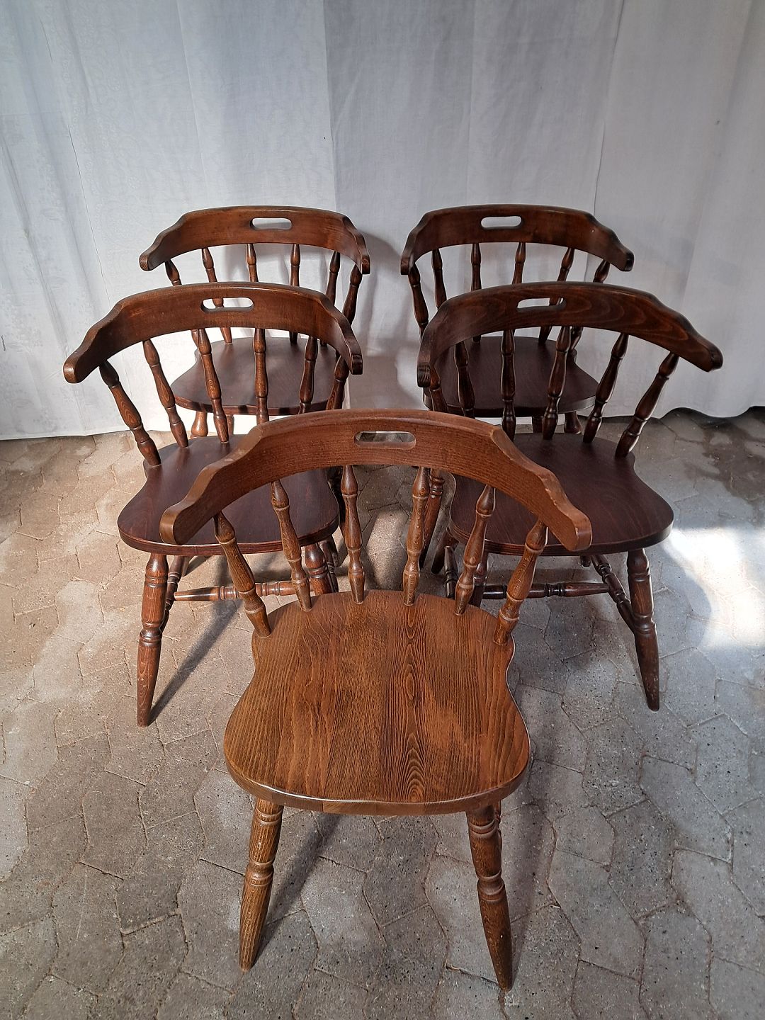 5 Stole i massivt og fineret egetræ, fra 1990erne. De har brugsspor. Ryghøjde 76cm Sædehøjde 45cm Emne nummer: 91500