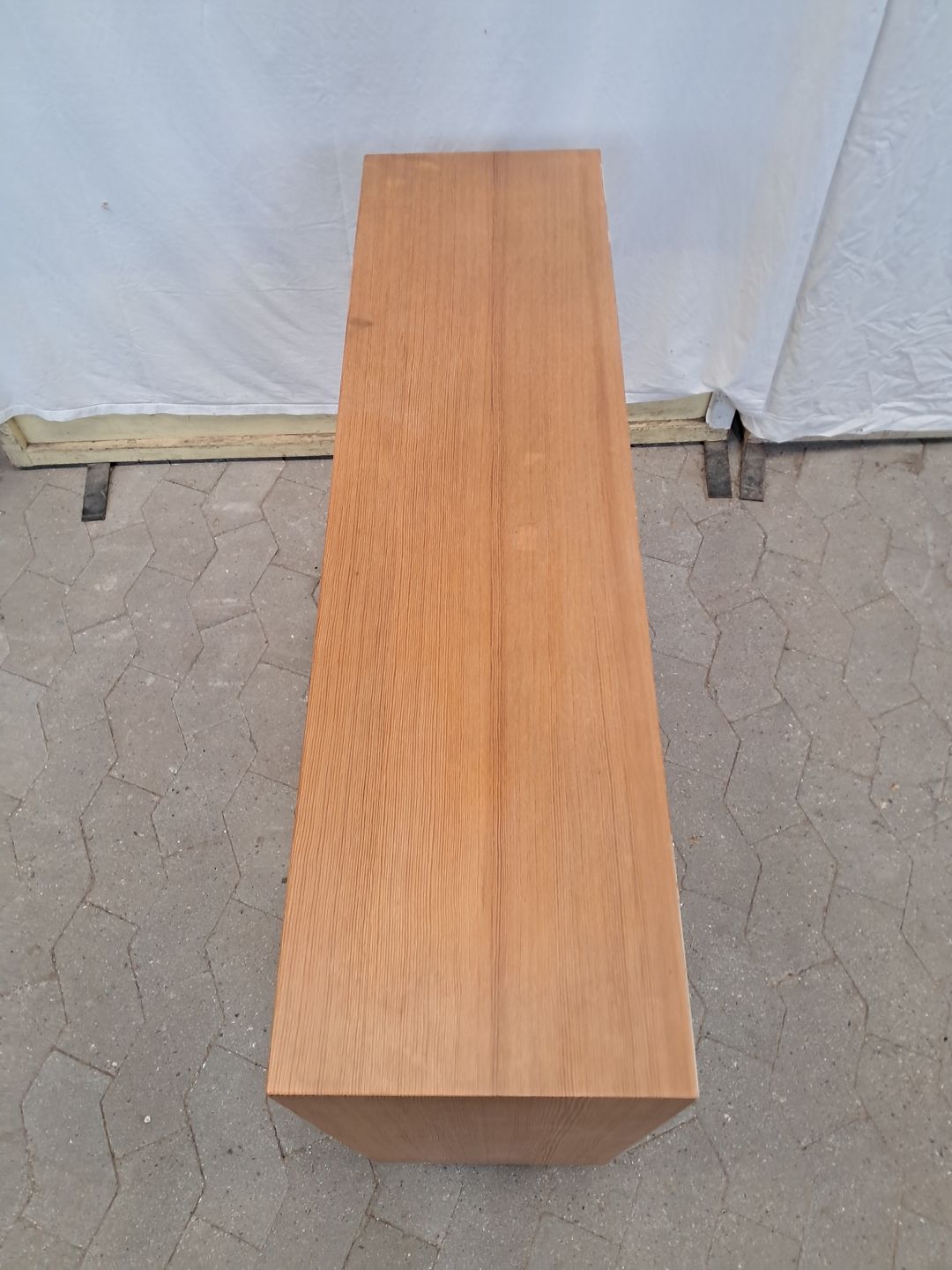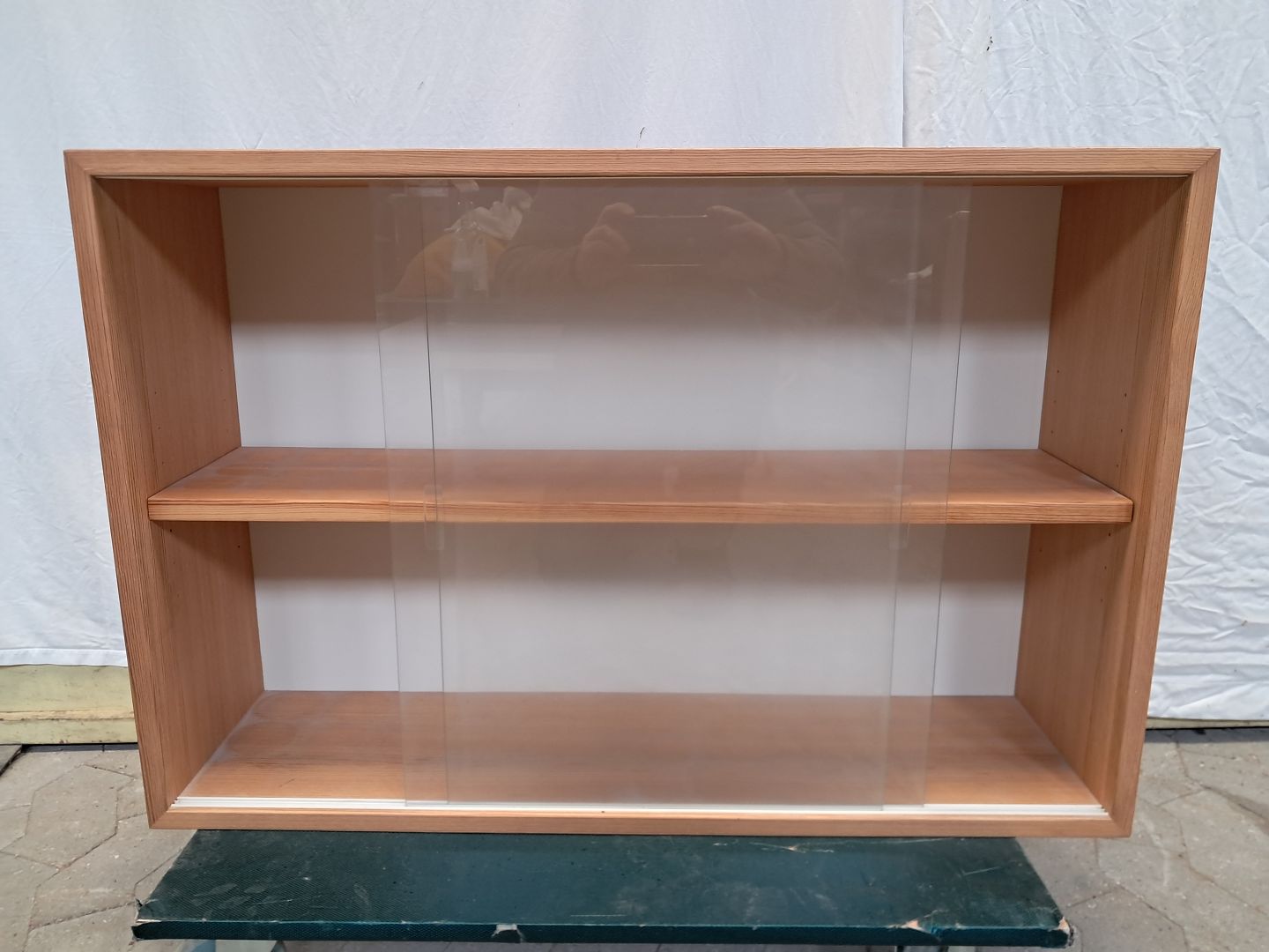Vitrineskab i fineret fyrretræ, fra 1980erne. Det har brugsspor. Højde 60cm Bredde 90cm Dybde 25cm Emne nummer: 91531