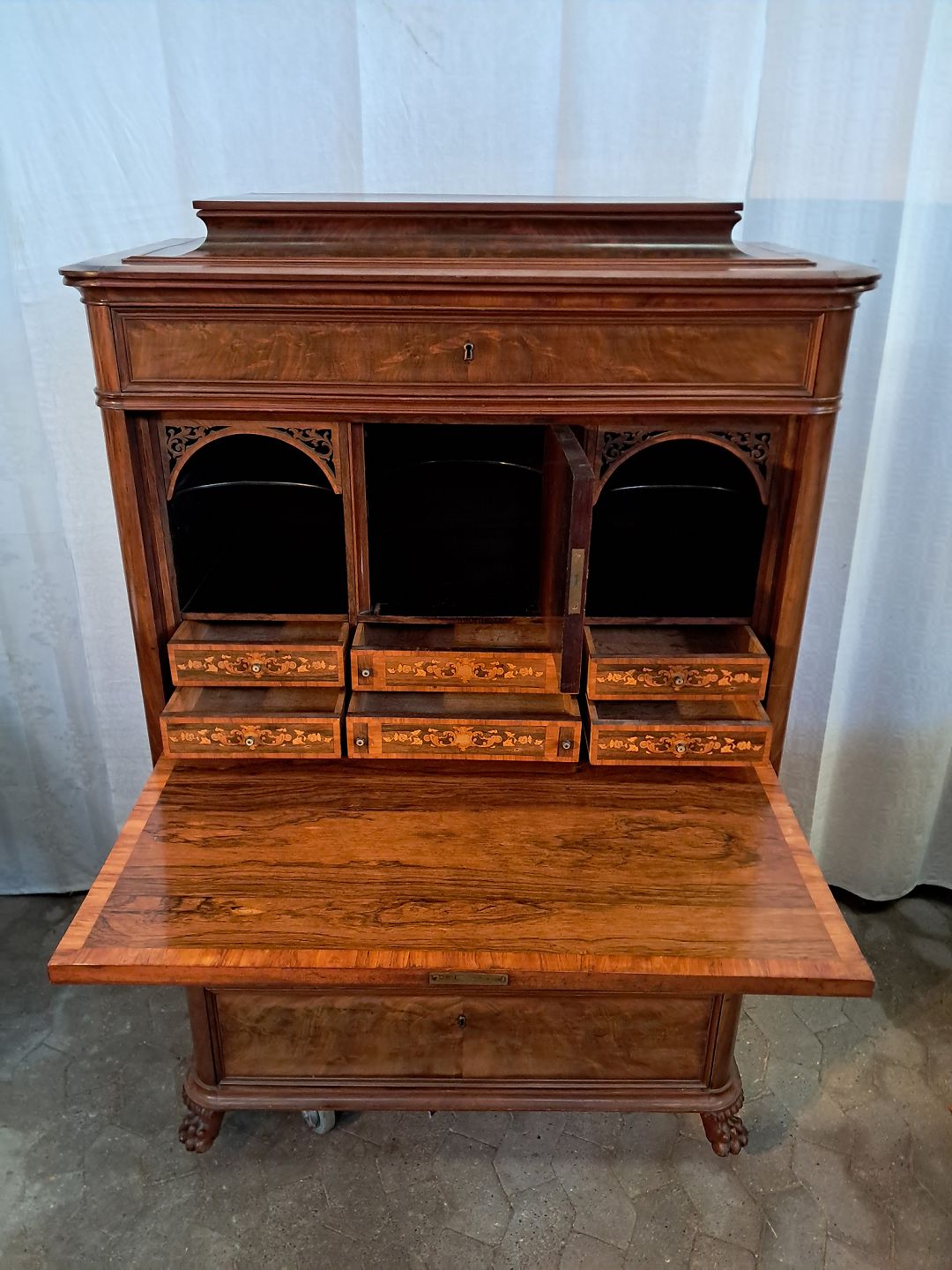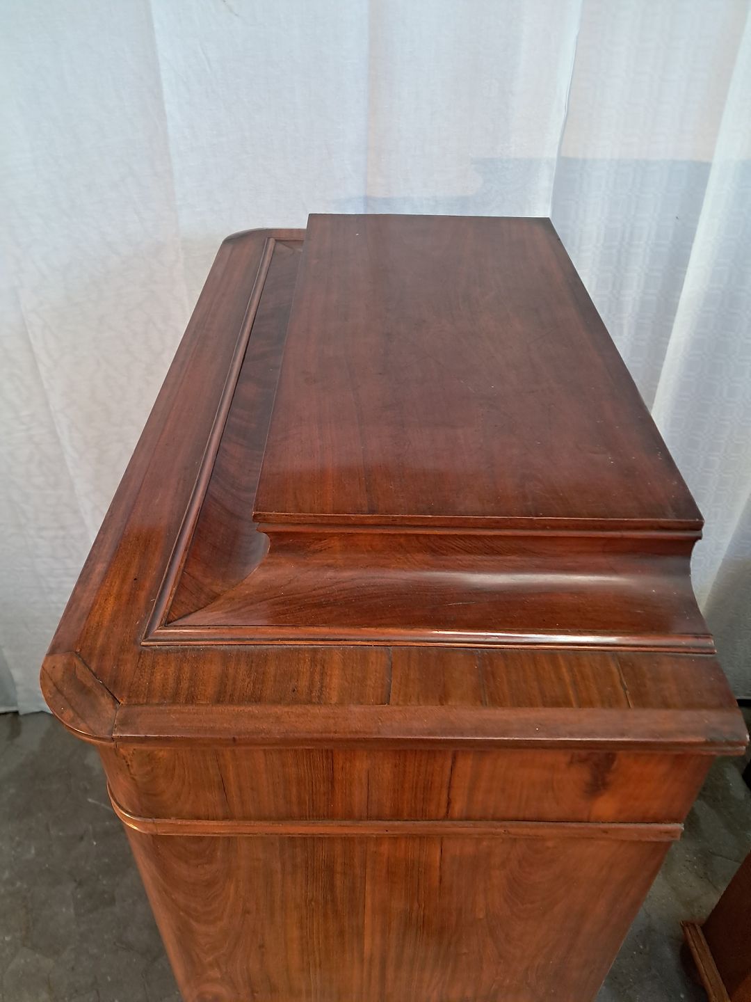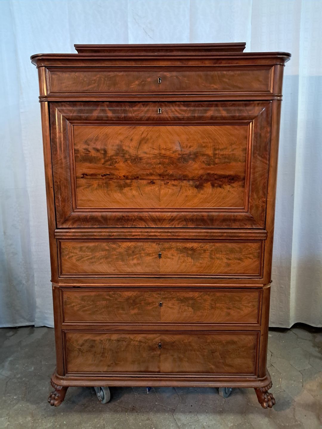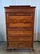 Sekretær i fineret mahogni, fra 1890erne. Den har brugsspor, løst bagben og mangler en hjørneliste. Højde 157cm Bredde 102cm Dybde 51cm Emne nummer: 91537
