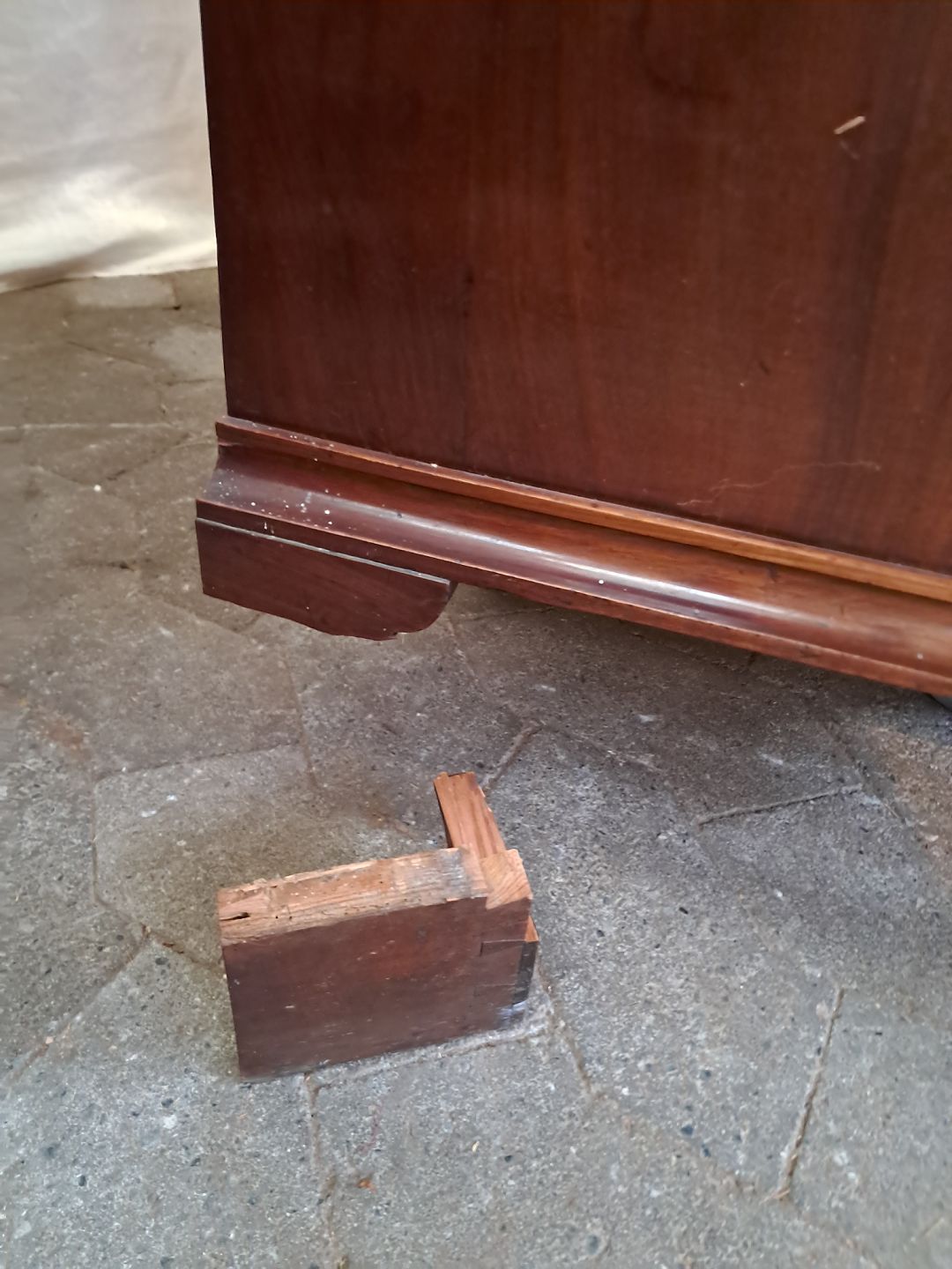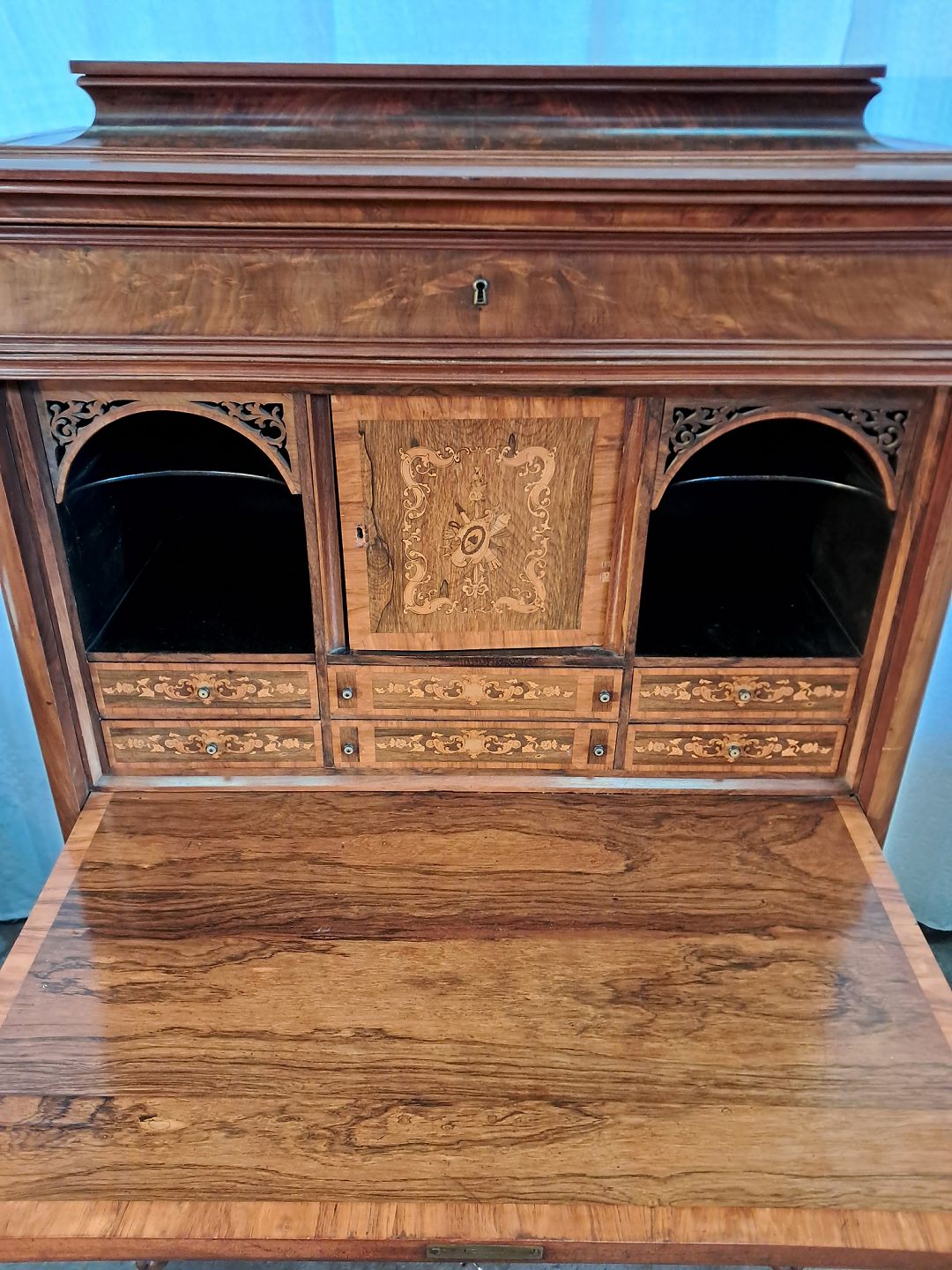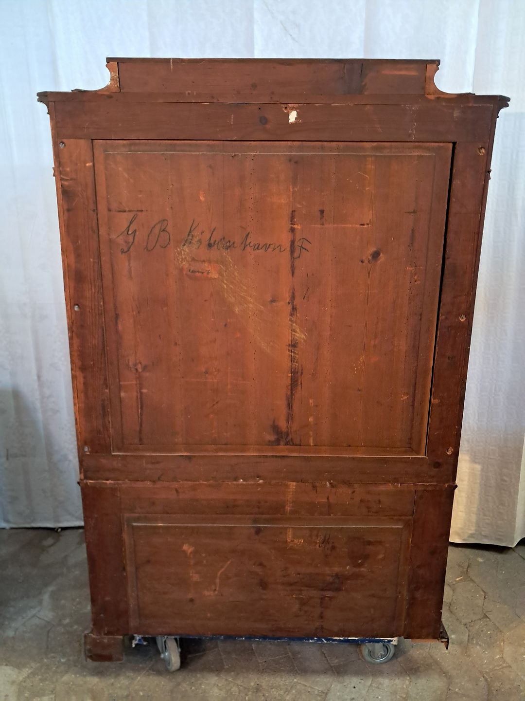 Sekretær i fineret mahogni, fra 1890erne. Den har brugsspor, løst bagben og mangler en hjørneliste. Højde 157cm Bredde 102cm Dybde 51cm Emne nummer: 91537