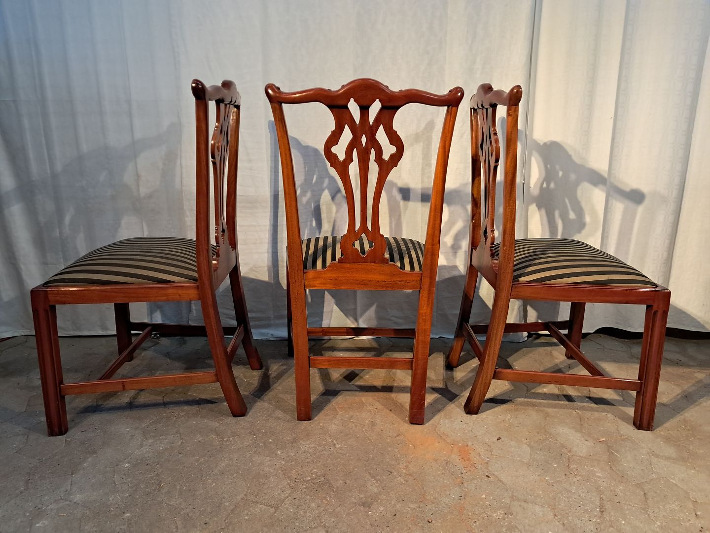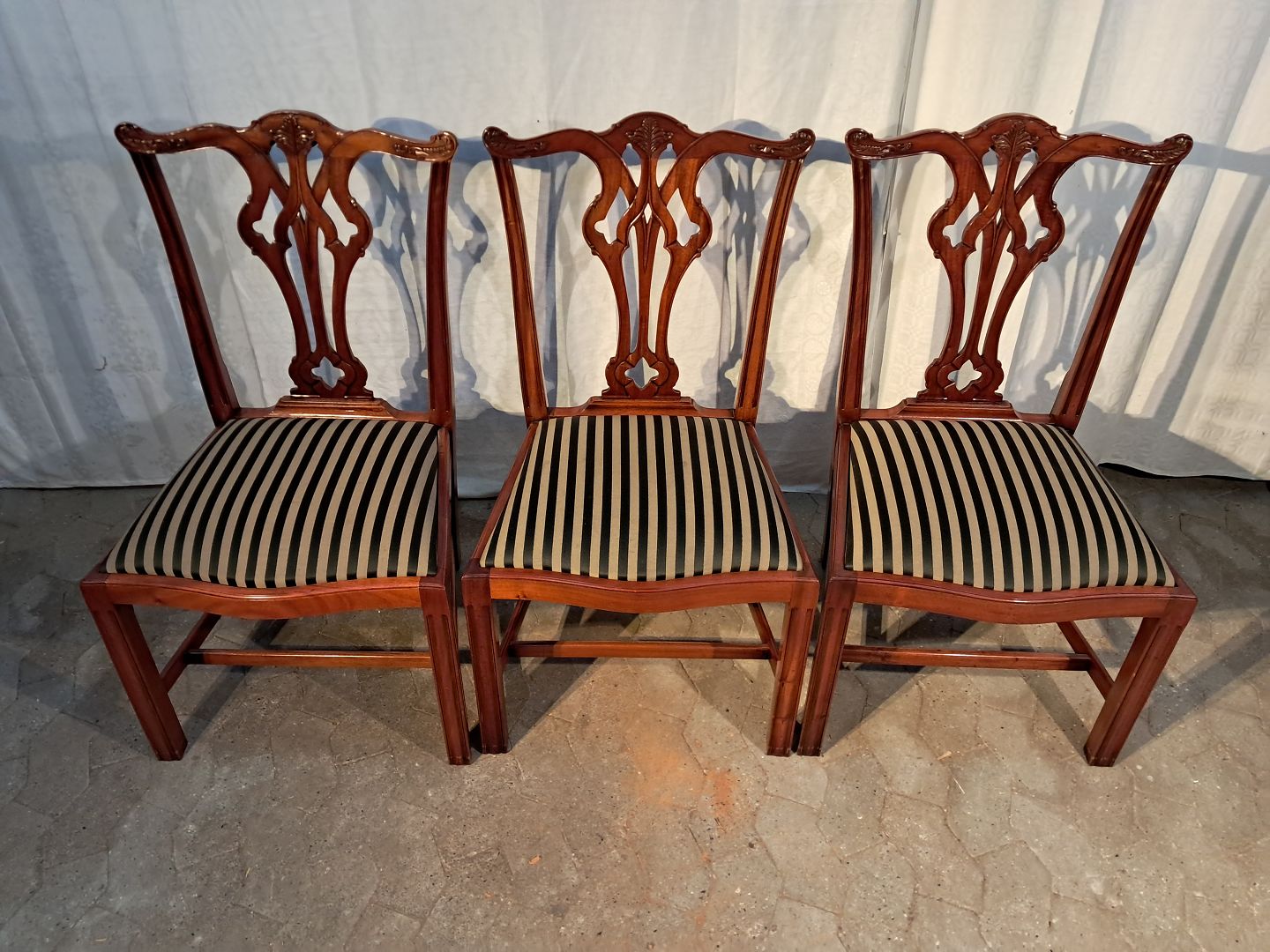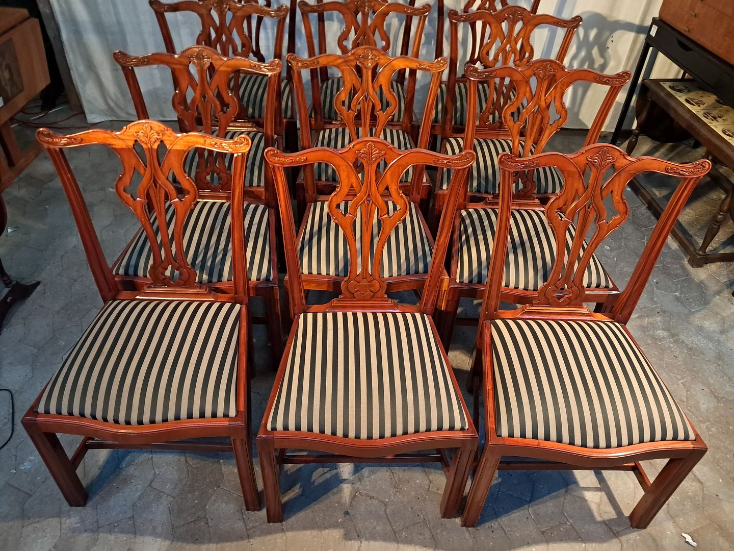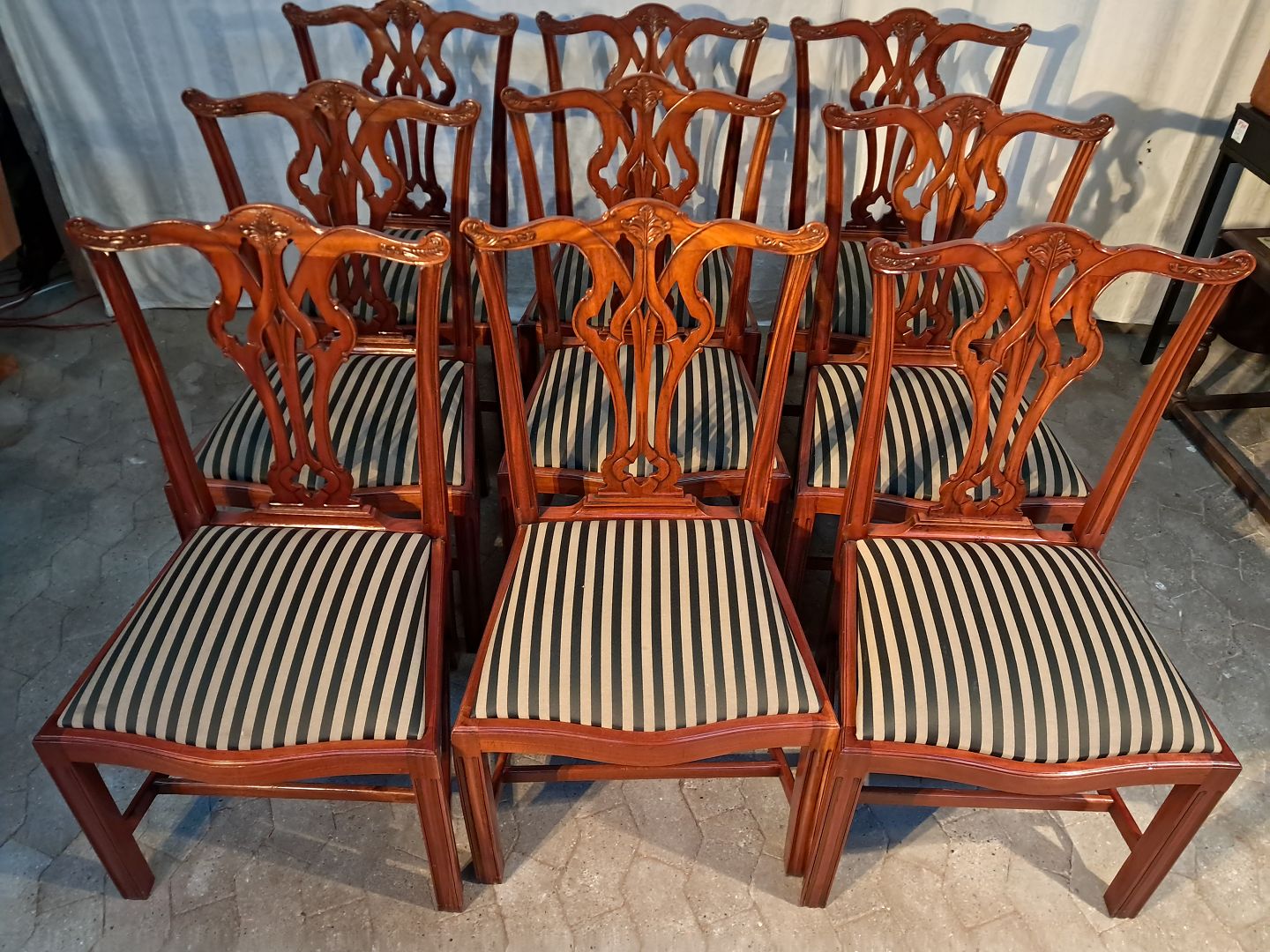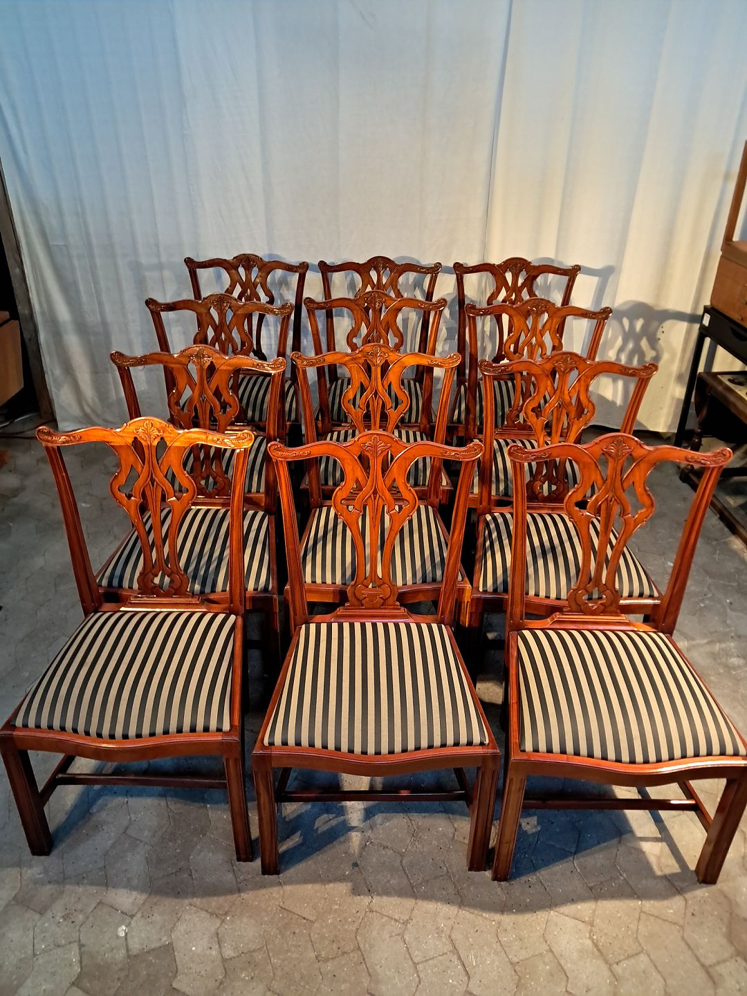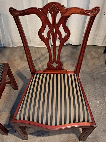 12 stole i massivt mahogni, fra 2000erne. Det har brugsspor. Ryghøjde 99cm Sædehøjde 45cm Emne nummer: 91567