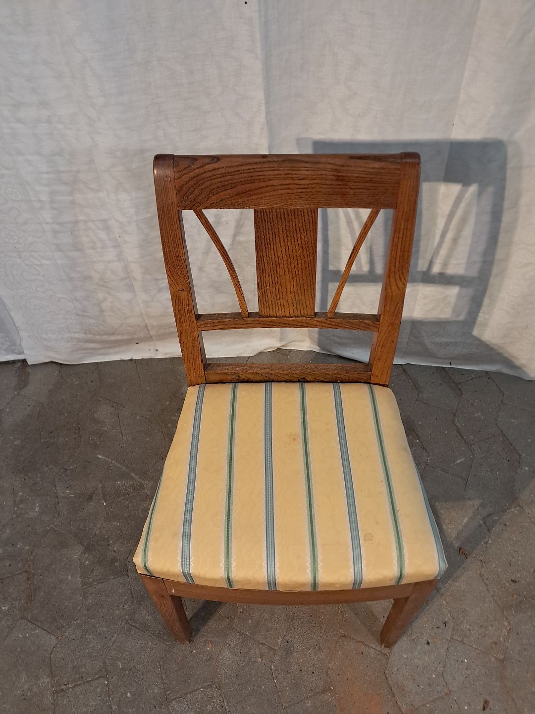 Stol i massivt egetræ, fra 1900erne. Den har brugsspor. Ryghøjde 81cm Sædehøjde 43cm Emne nummer: 91569