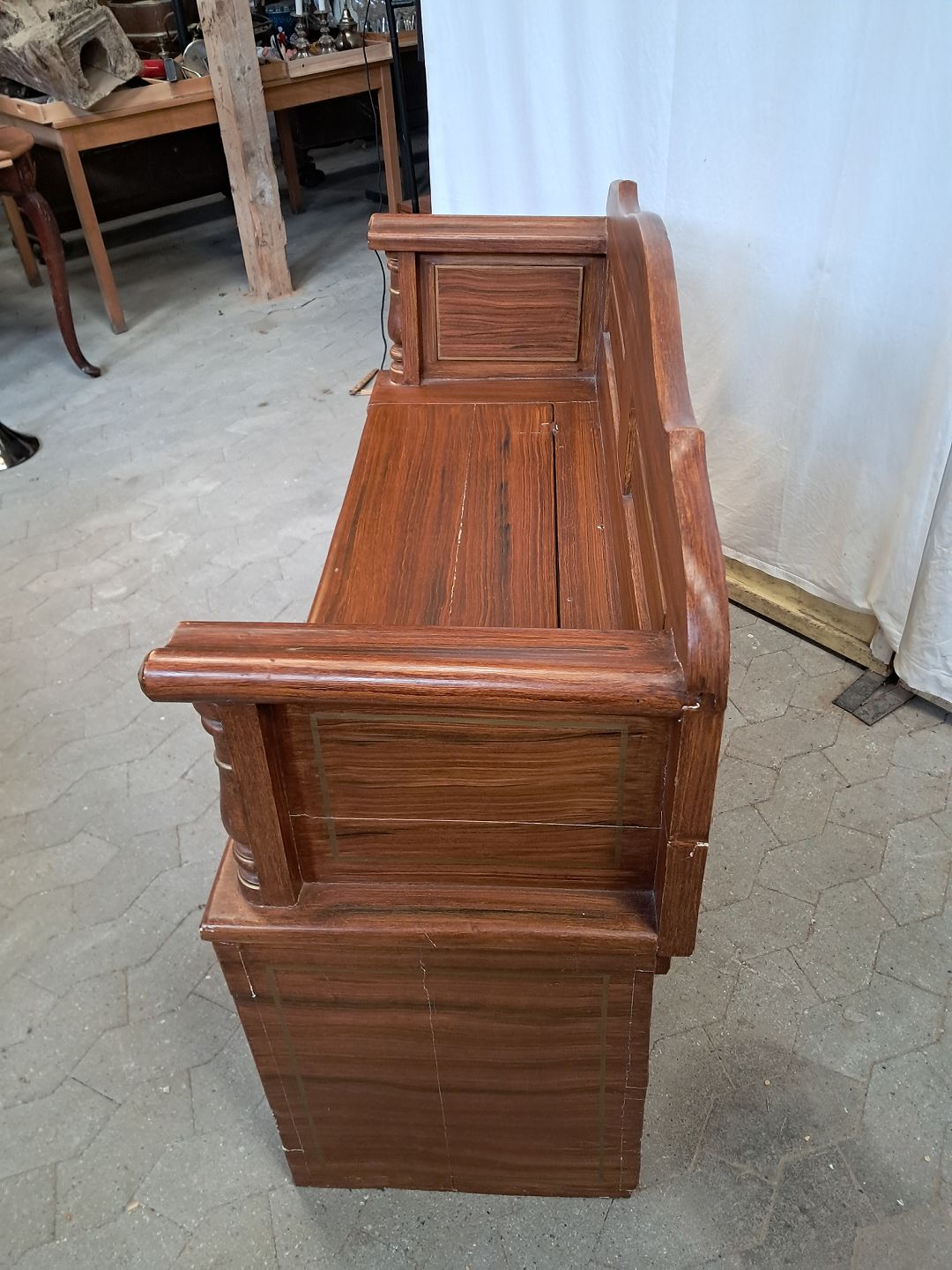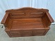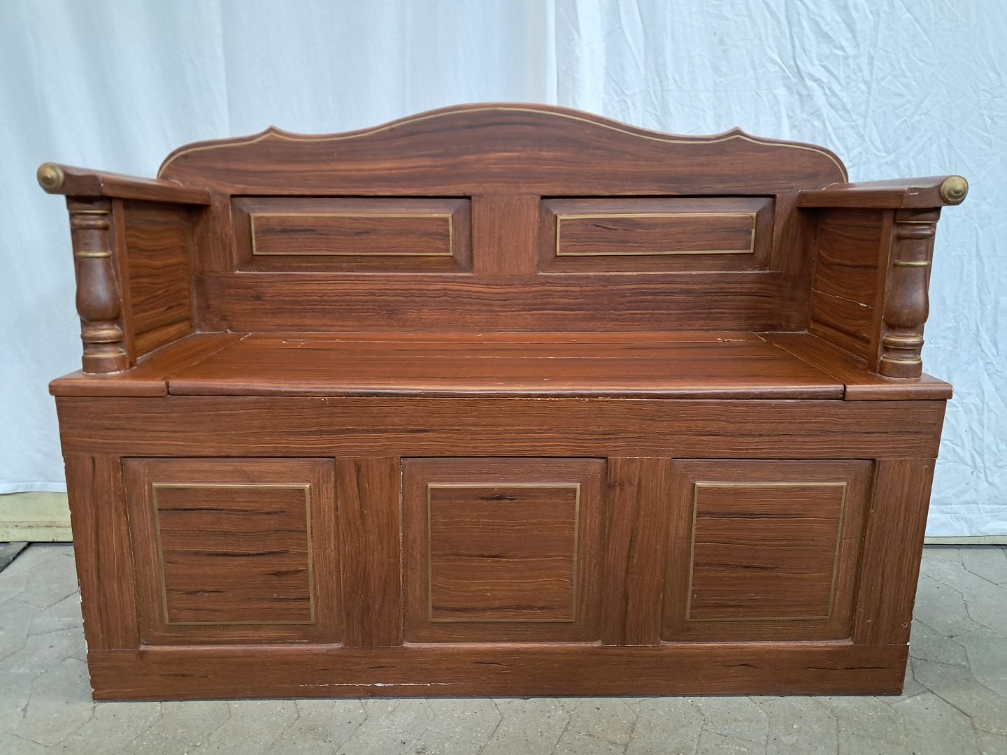 Bænk i malet massivt fyrretræ, fra 1900erne. Den har brugsspor og der medfølger en hynde. Ryghøjde 95cm Sædehøjde 52cm Bredde 132cm Dybde 46cm Emne nummer: 91586