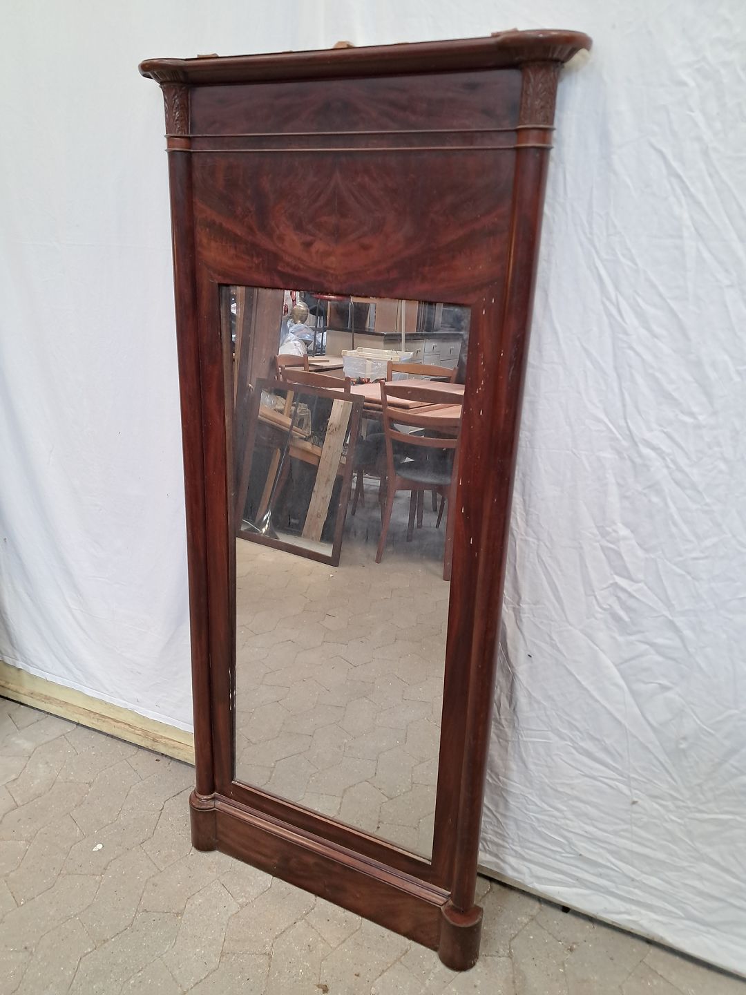 Spejl i fineret mahogni, fra 1910erne. Det har brugsspor og forringet spejlbillede. Højde 155cm Bredde 72cm Emne nummer: 91595