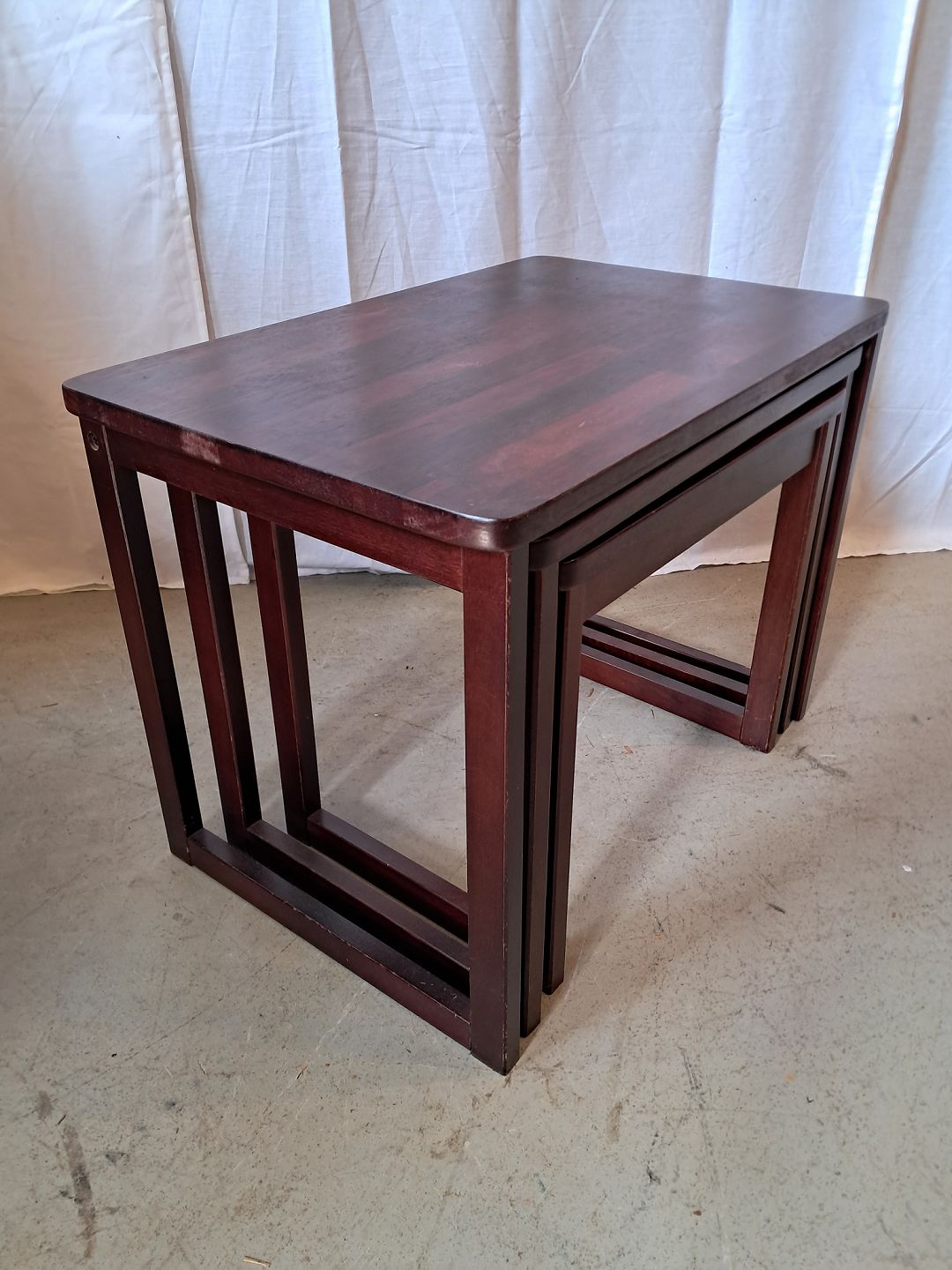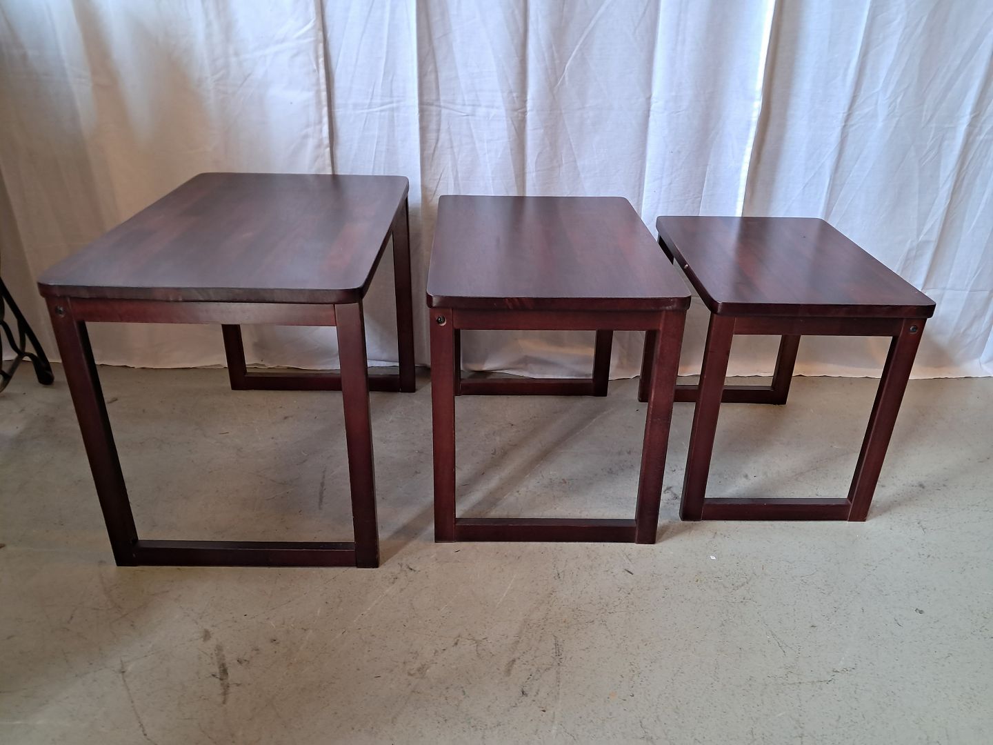 3 Inskudsborde i fineret mahogni, af nyere dato. De har brugsspor. Højde 46cm Bredde 62cm Dybde 41cm Emne nummer: 76644