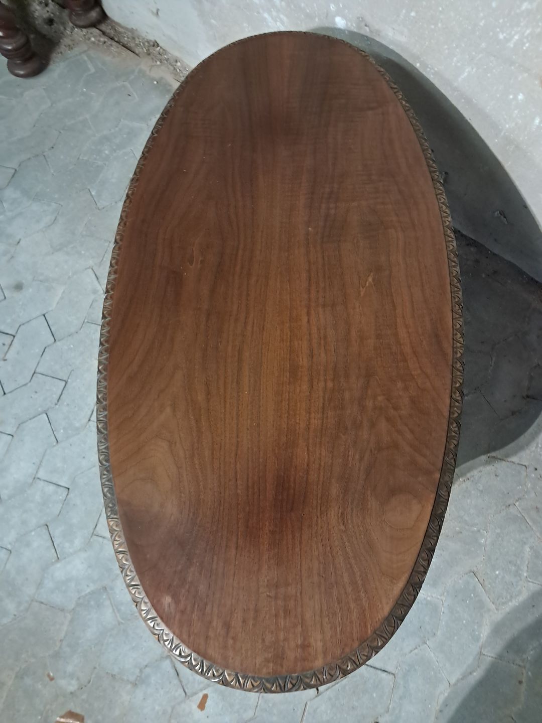 Sofabord i fineret nøddetræ, fra 1950erne. Det har brugsspor. Højde 53cm Bredde 64cm Længde 126cm Emne nummer: 91618