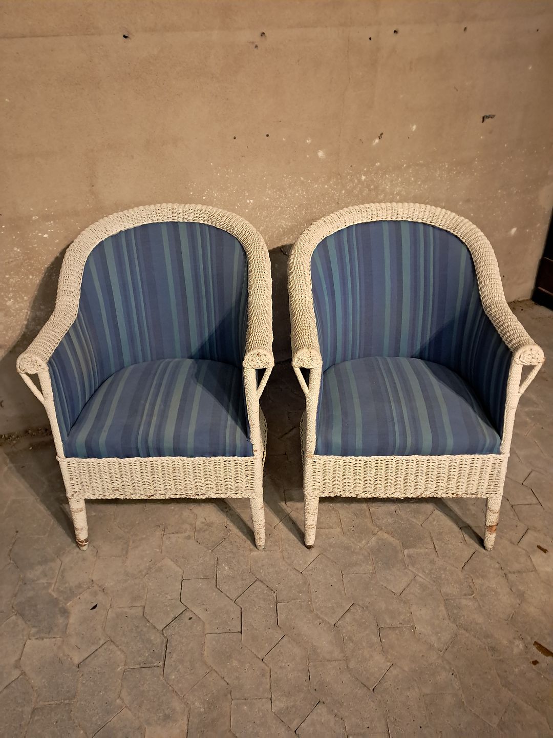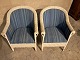 2 Malede kurvestole, fra 1980erne. Betrækket er slidt/solbleget, men intakt. Ryghøjde 85cm Sædehøjde 43cm Emne nummer: 91627