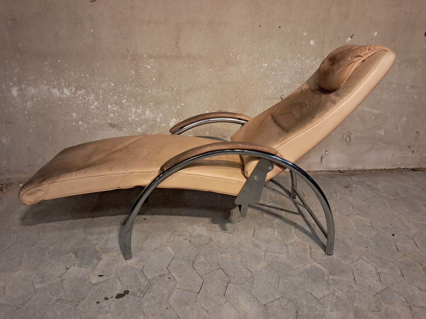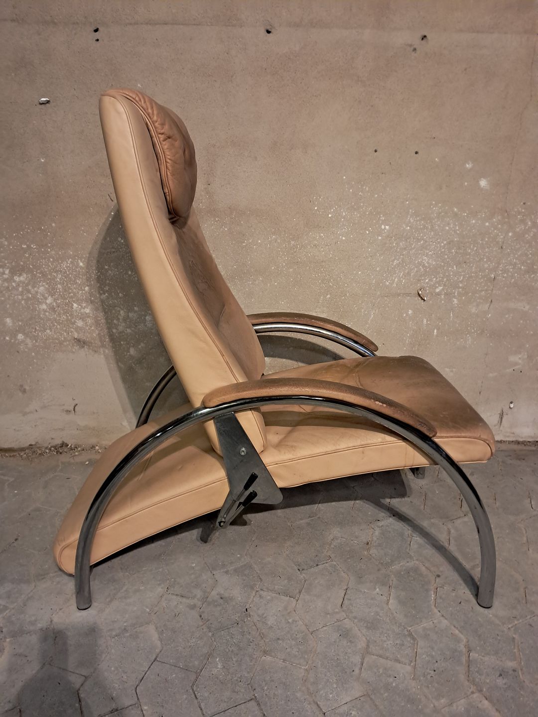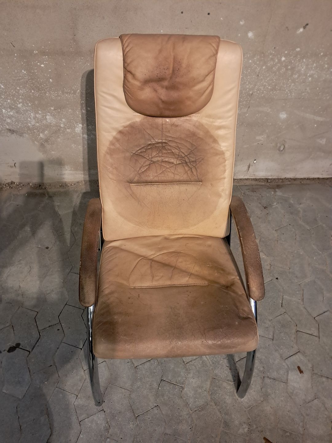 Lænestol i metal og læder, fra 1980erne. Den er designet af Ingmar Relling. Den har brugsspor og læderet er godt brugt. Rughøjde 109cm Sædehøjde 42cm Emne nummer: 91631