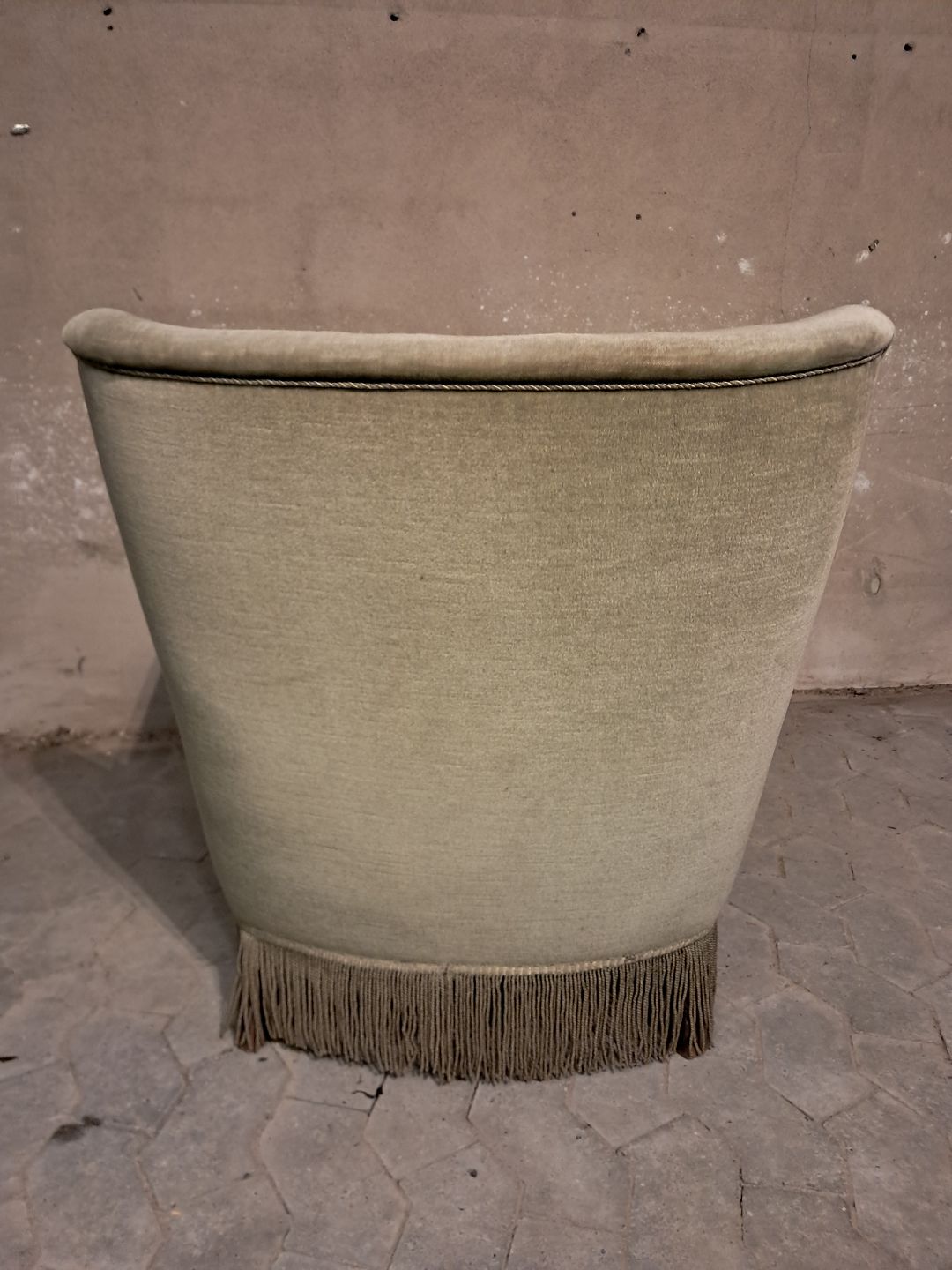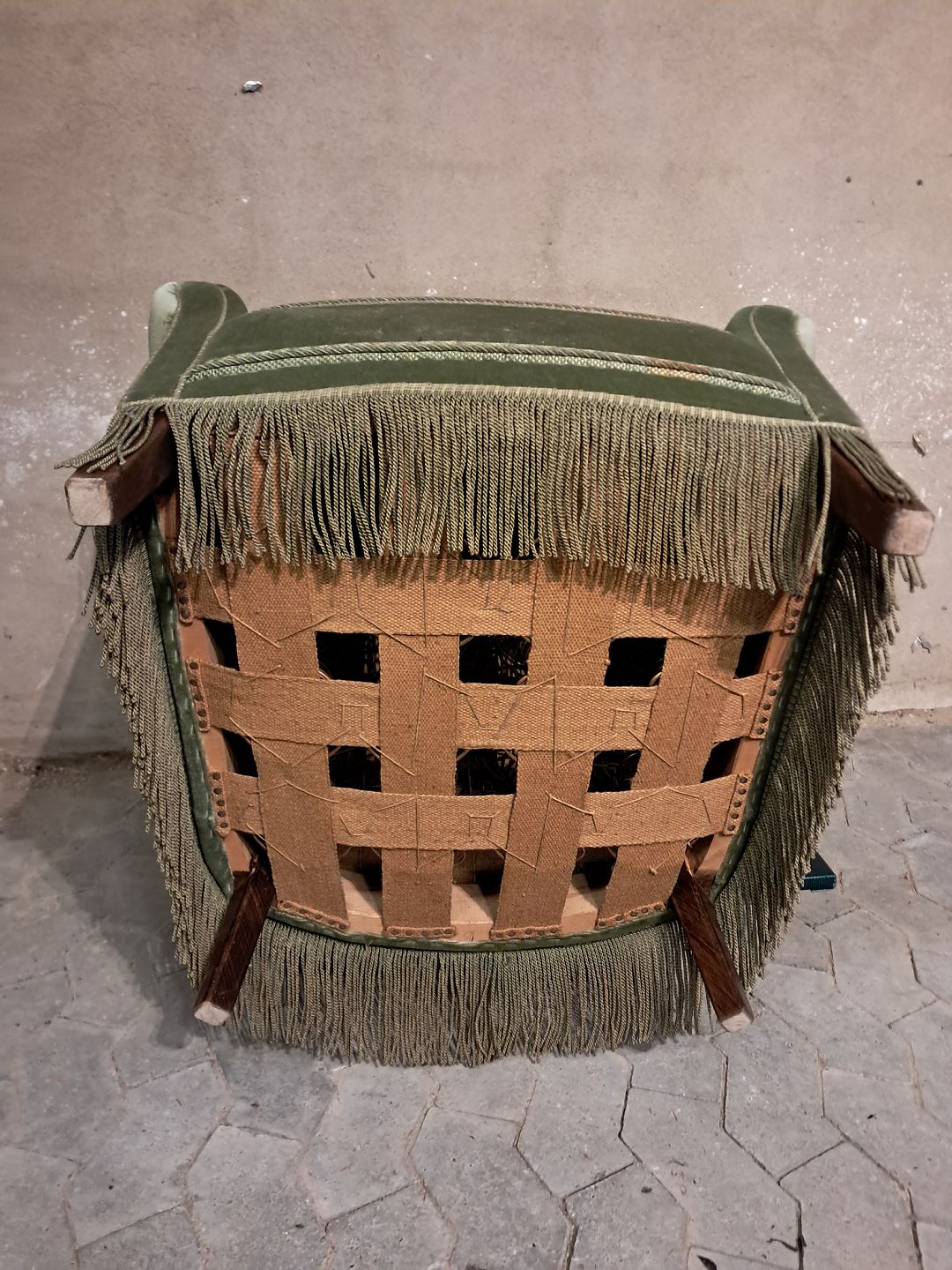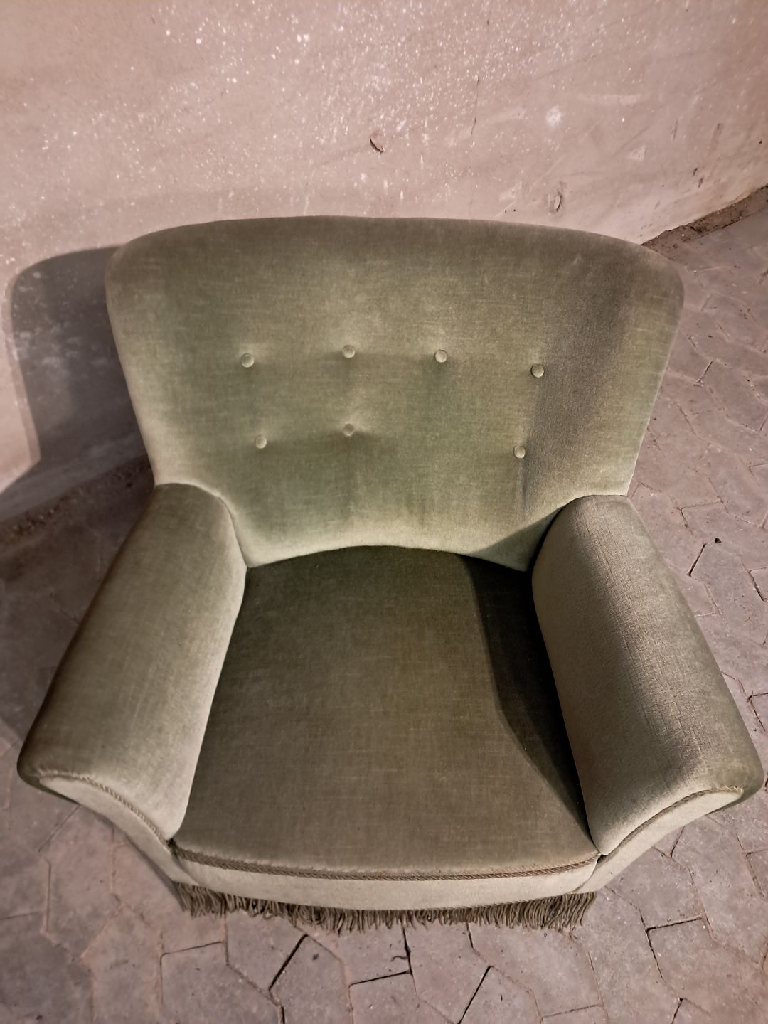 Lænestol i velour med skåneærmer, fra 1950erne. Den har brugsspor og mangler 2 knapper. Ryghøjde 77cm Sædehøjden 38cm Emne nummer: 91633