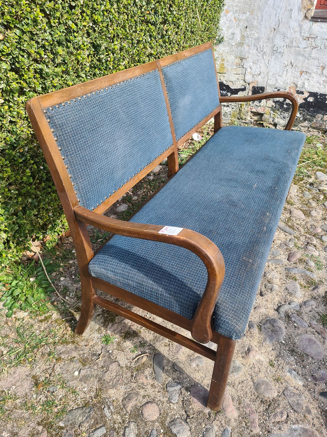 Dansk snedkermester bænk udført i bejdset egetræ betrukket med uld stof. Fremstillet ca. 1940'erne. Fremstår med brugsspor betræk med slidtage. Mål: H. 87 cm. L. 152 cm. D. 62 cm. SH. 42 cm. Emne nummer: 80850