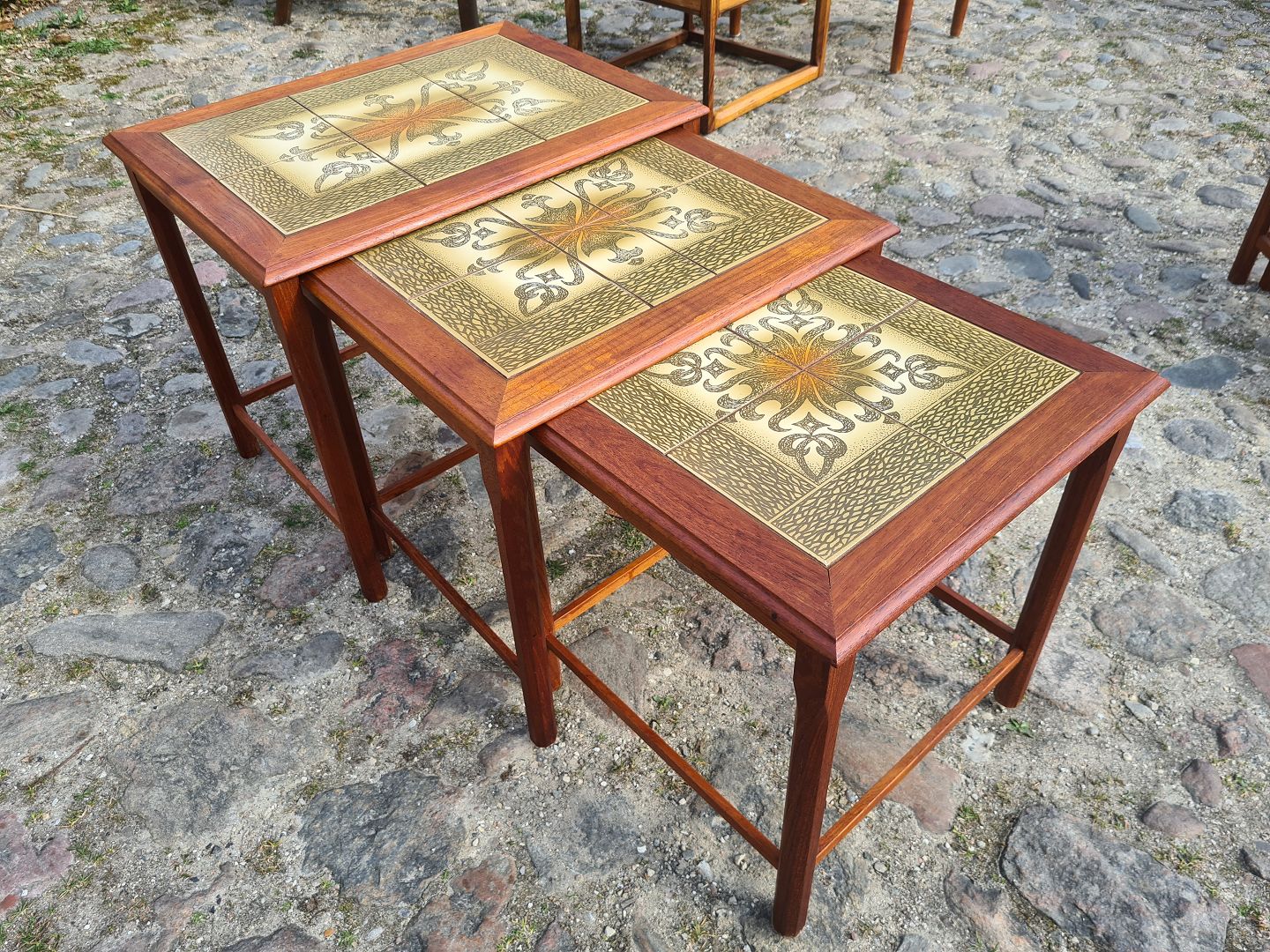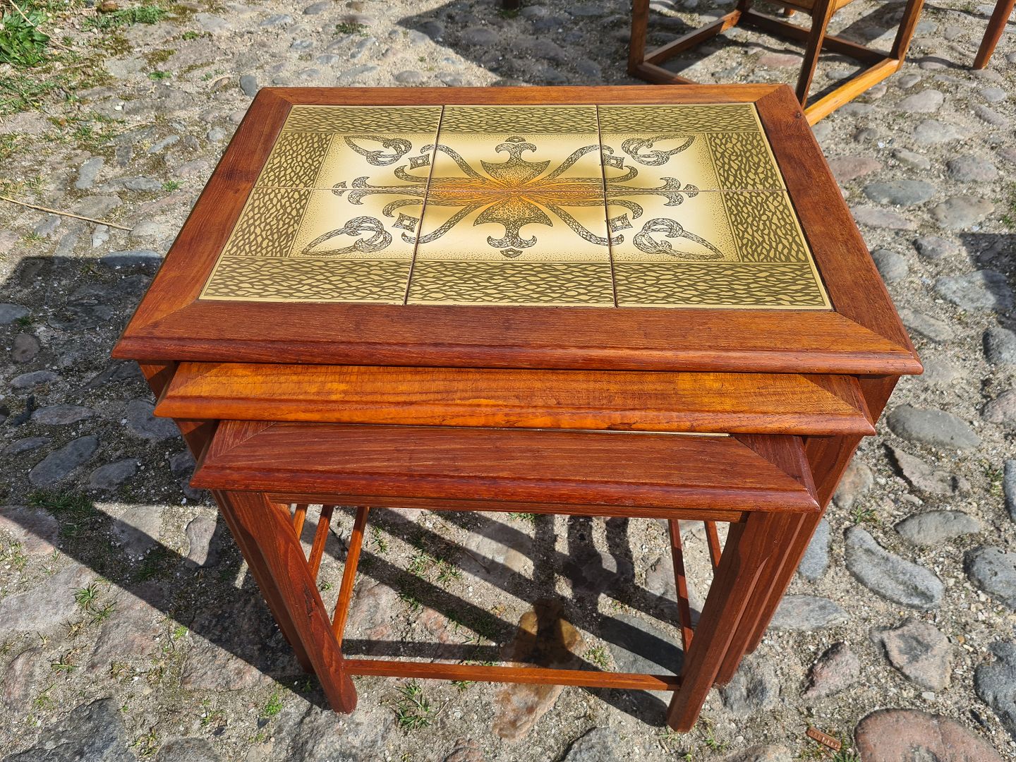 Dansk møbelproducent indskudsborde i teak med kakler. Produceret ca. 1970'erne. Fremstår i pæn brugt stand. Mål: H. 47 cm. B. 56 cm. D. 47 cm. Emne nummer: 80853