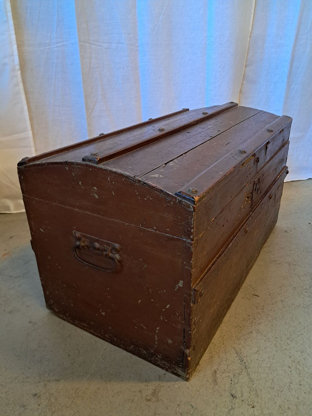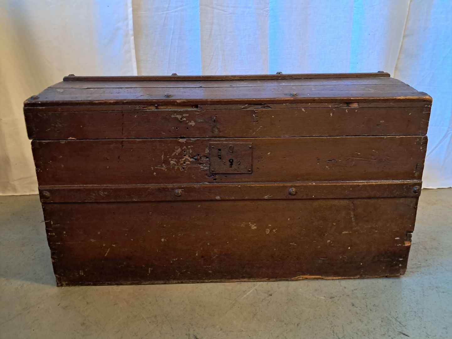 Malet kiste fra 1920erne. Den har brugsspor, revner i træet og der med følger ikke nøgle. Højde 40cm Bredde 71cm Dybde 38cm Emne nummer: 76653