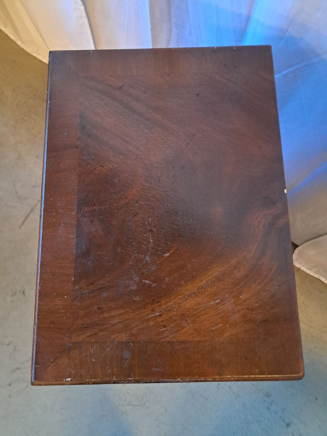 Kommode i fineret mahogni, fra 1980erne. Den har brugsspor i form af ridser. Højde 80cm Bredde 42cm Dybde 30cm Emne nummer: 76660