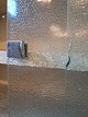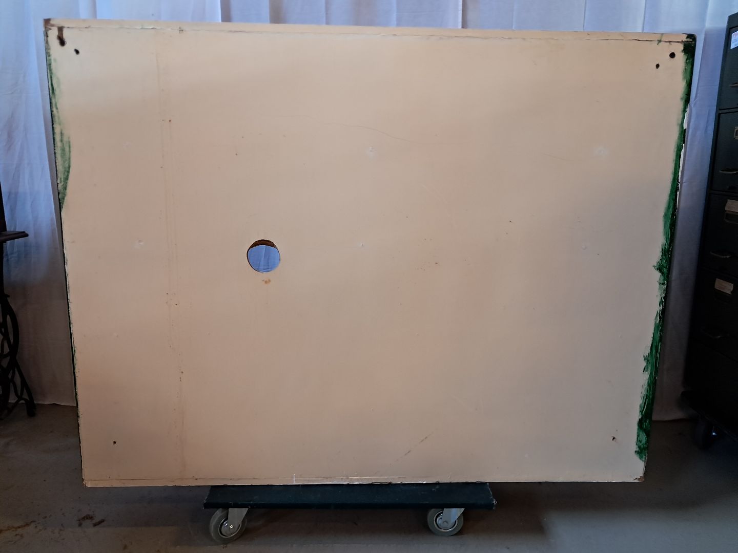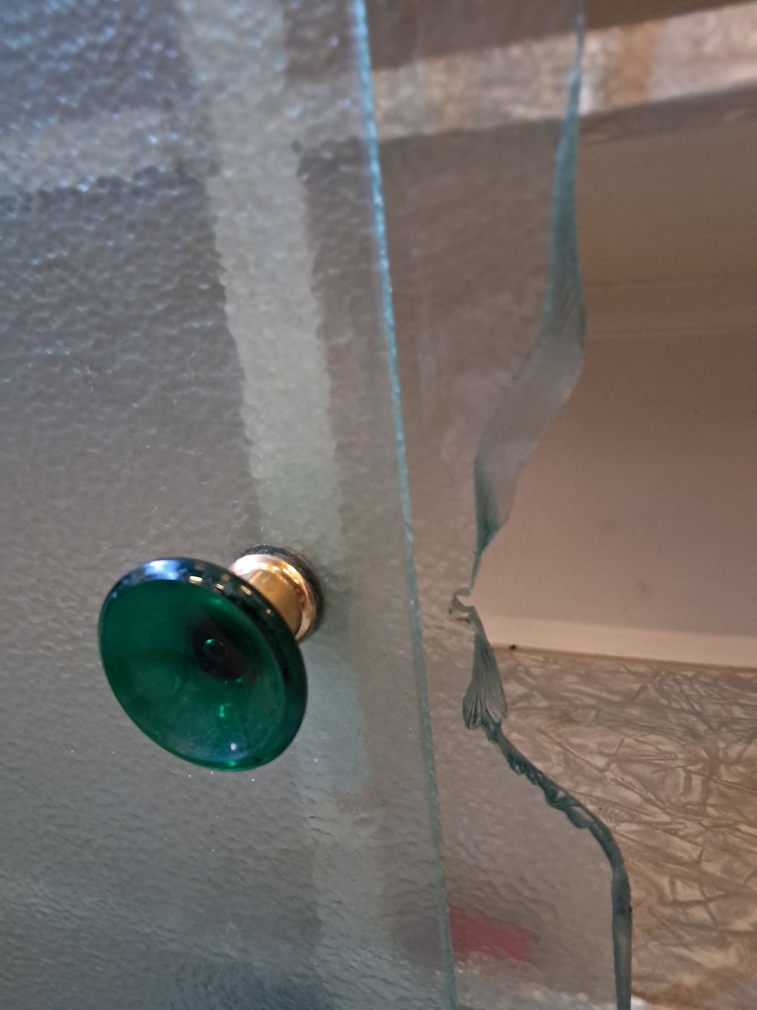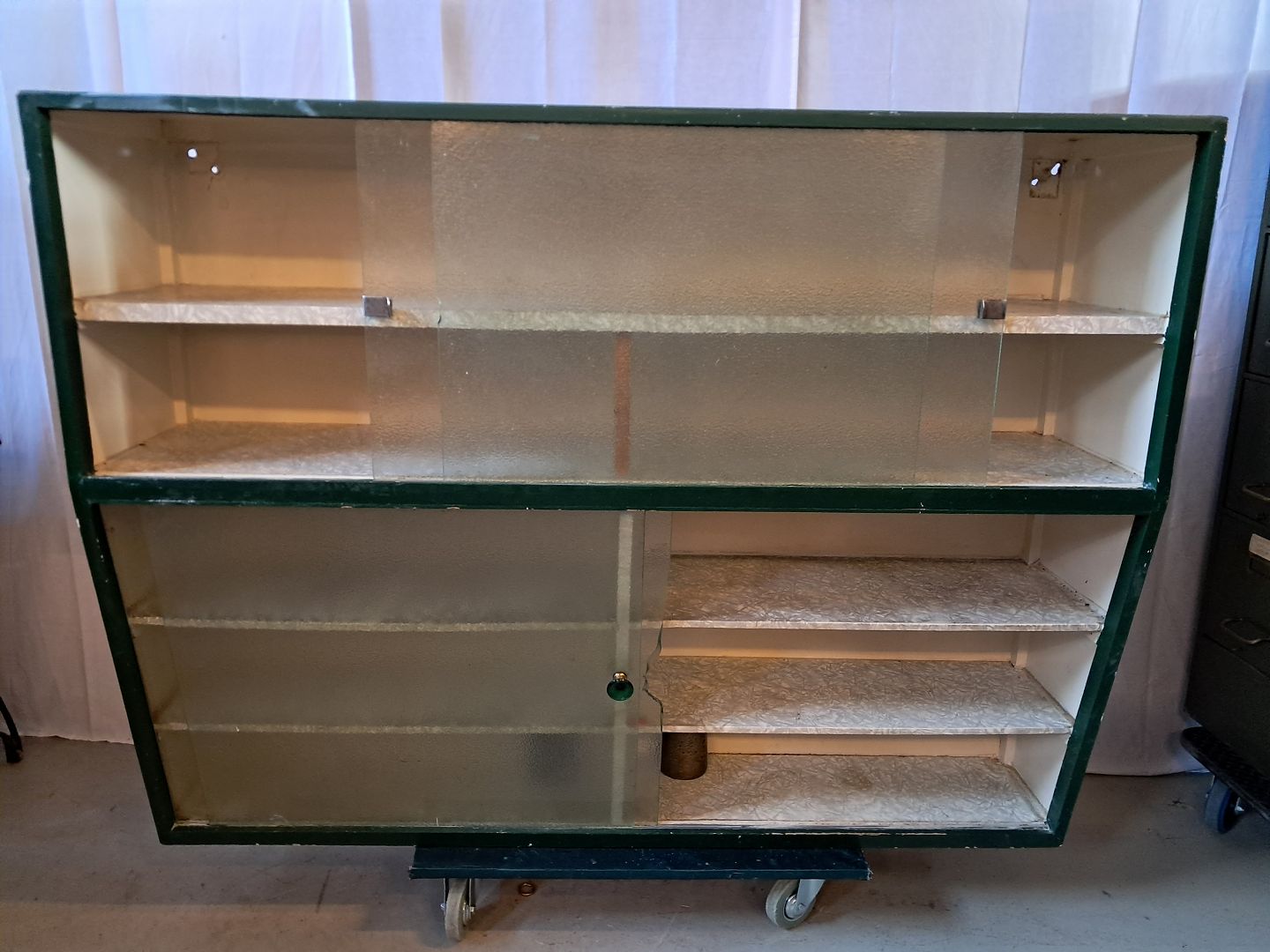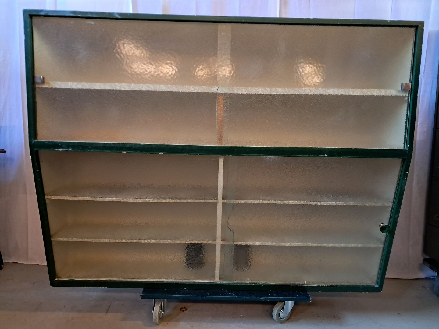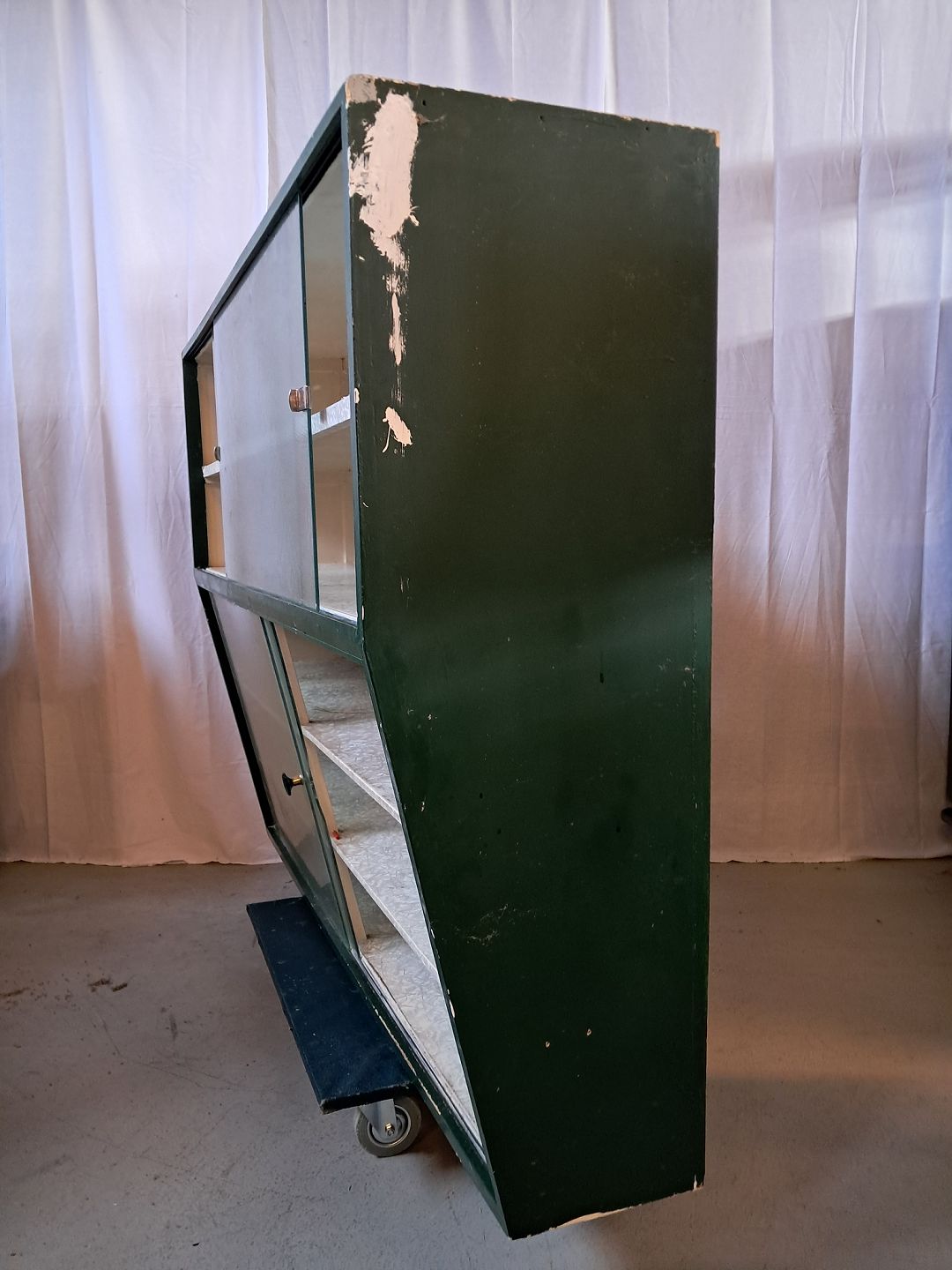 Malet køkkenskab med frostet glaslåger, fra 1950erne. Glaslågerne har defekter. Højde 118cm Bredde 153cm Dybde i toppen 40cm Dybde i bunden 25cm Emne nummer: 76673