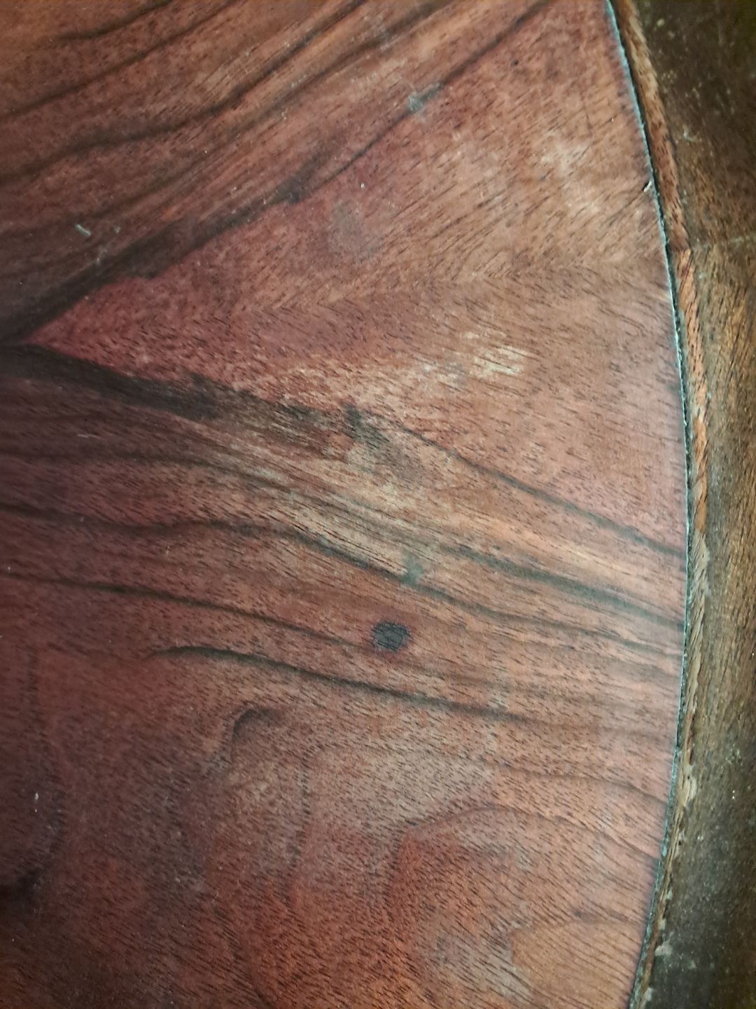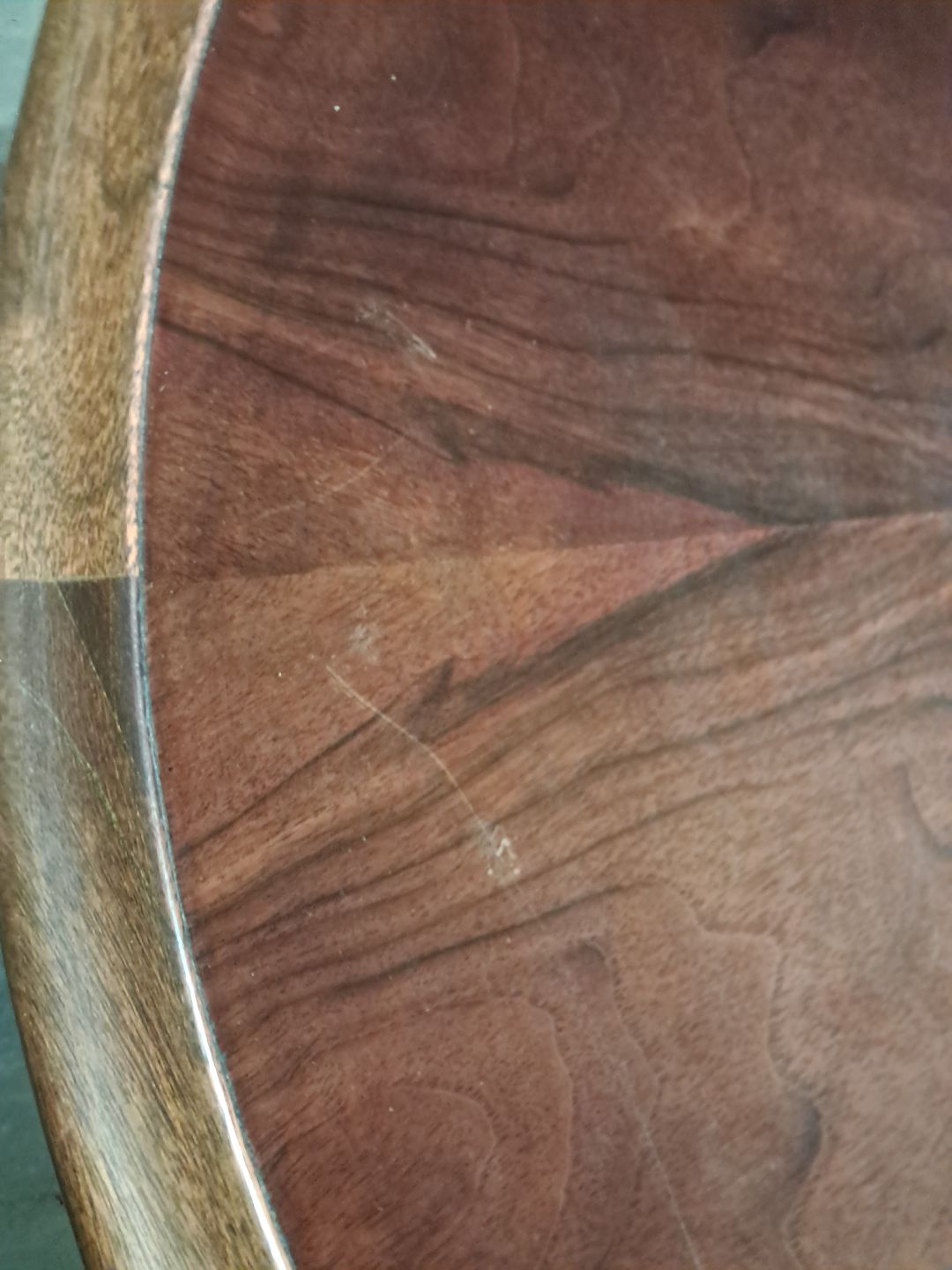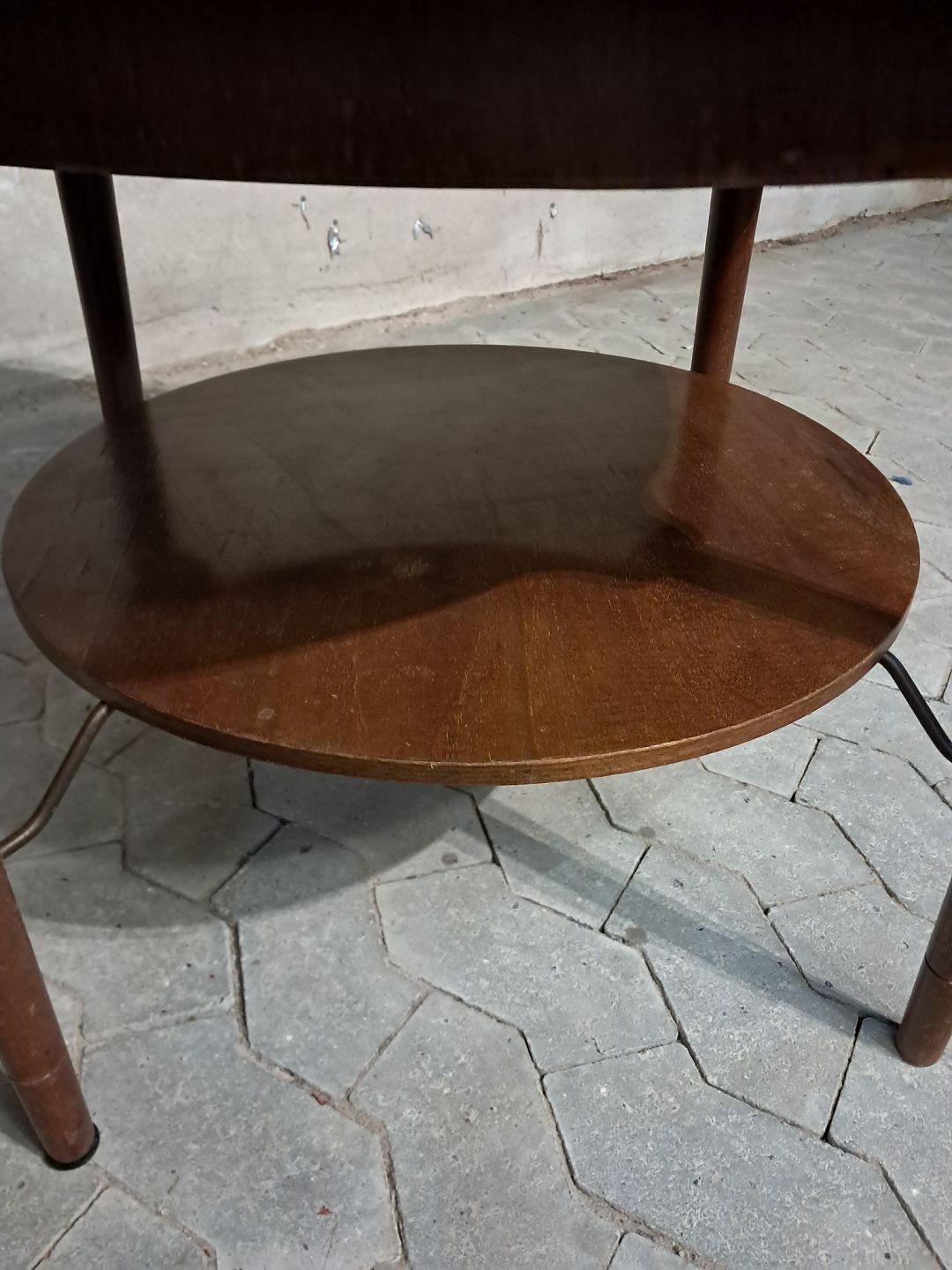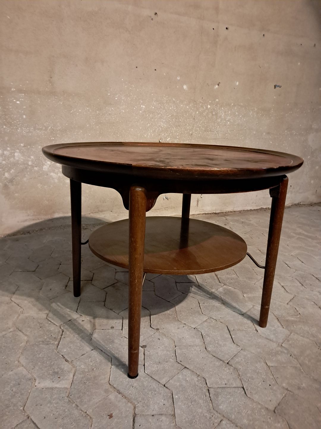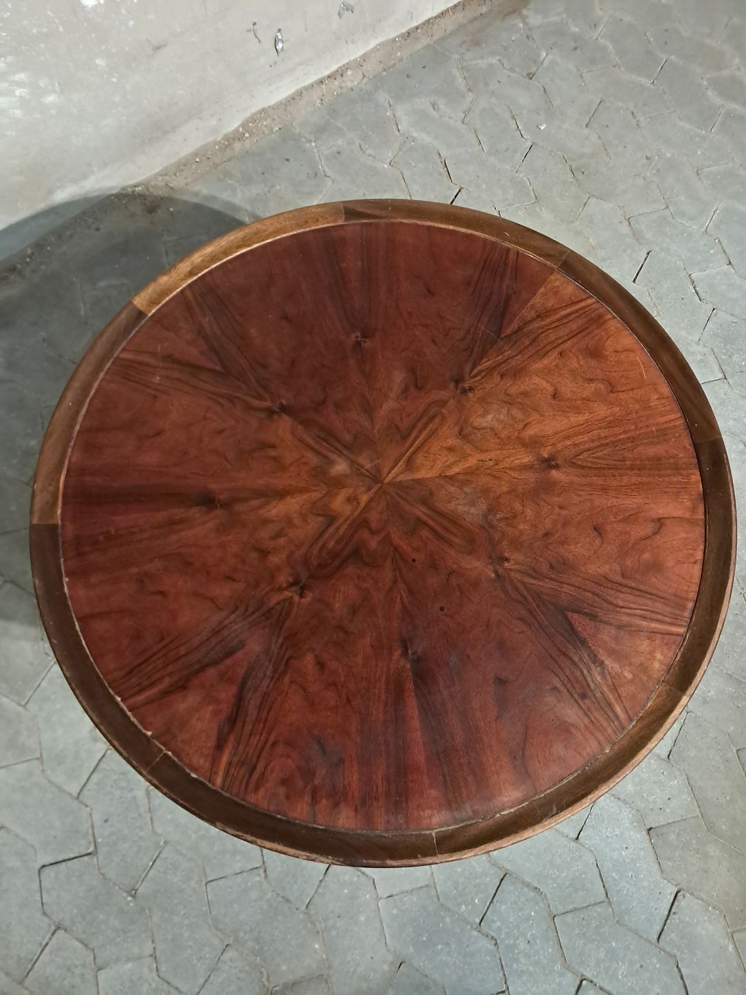 Rundt sofabord i fineret nødetræ, fra 1950erne. Det har brugsspor. Højde 60cm Diameter 82cm Emne nummer: 91666