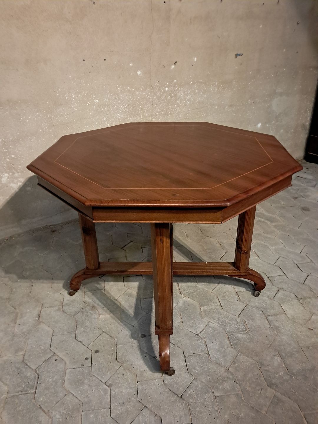 Salonbord med fineret mahogni bordplade og stolper af massivt fyrretræ. Det er fra 1910erne og har brugsspor. Højde 74cm Diameter 102cm Emne nummer: 91667
