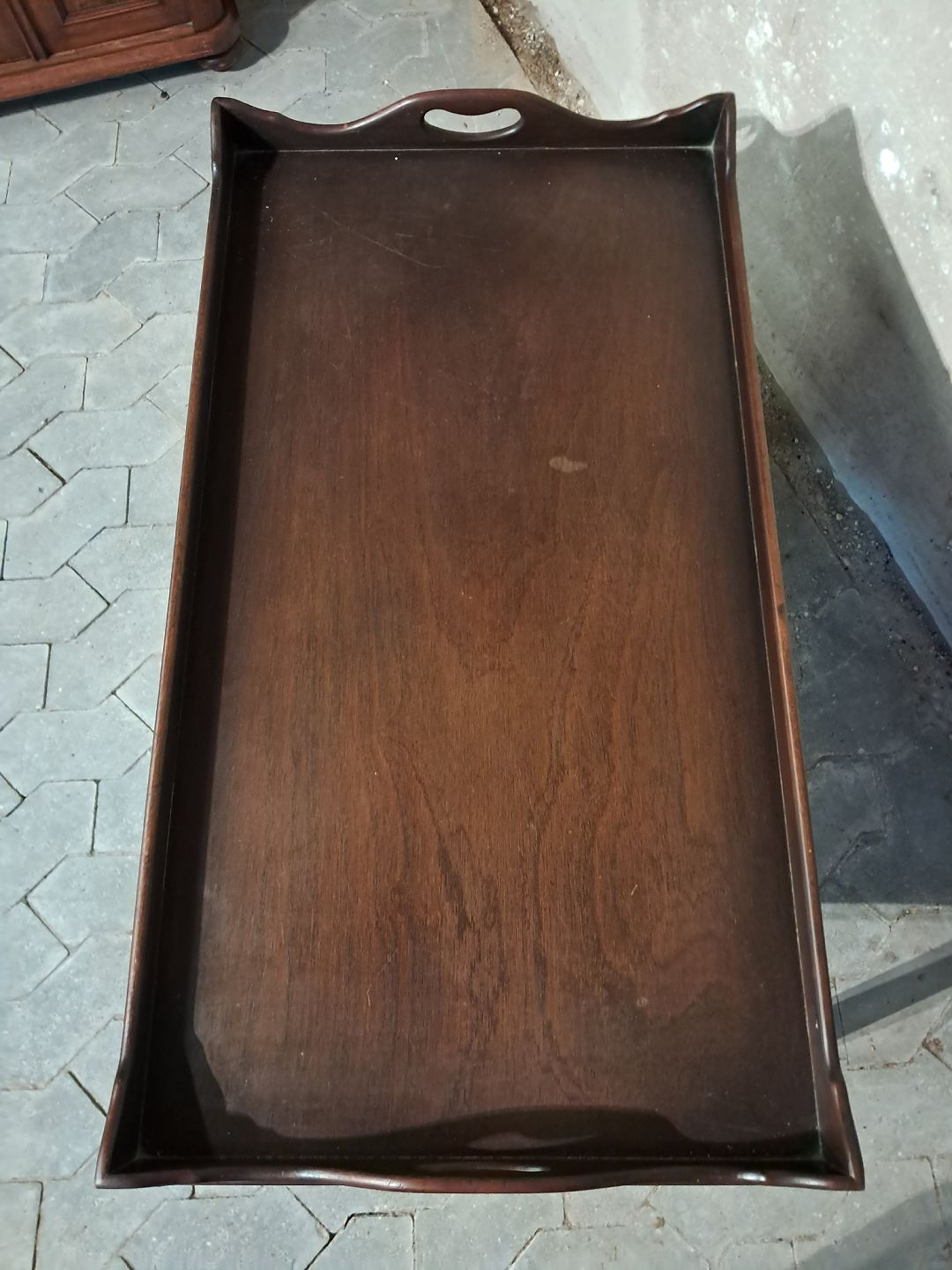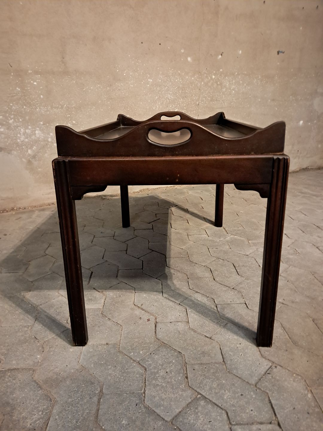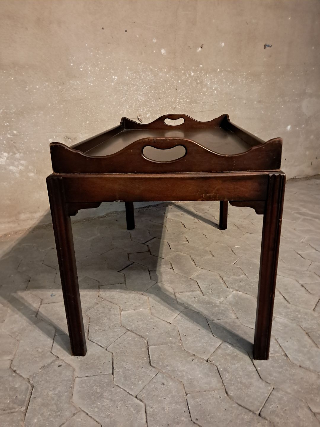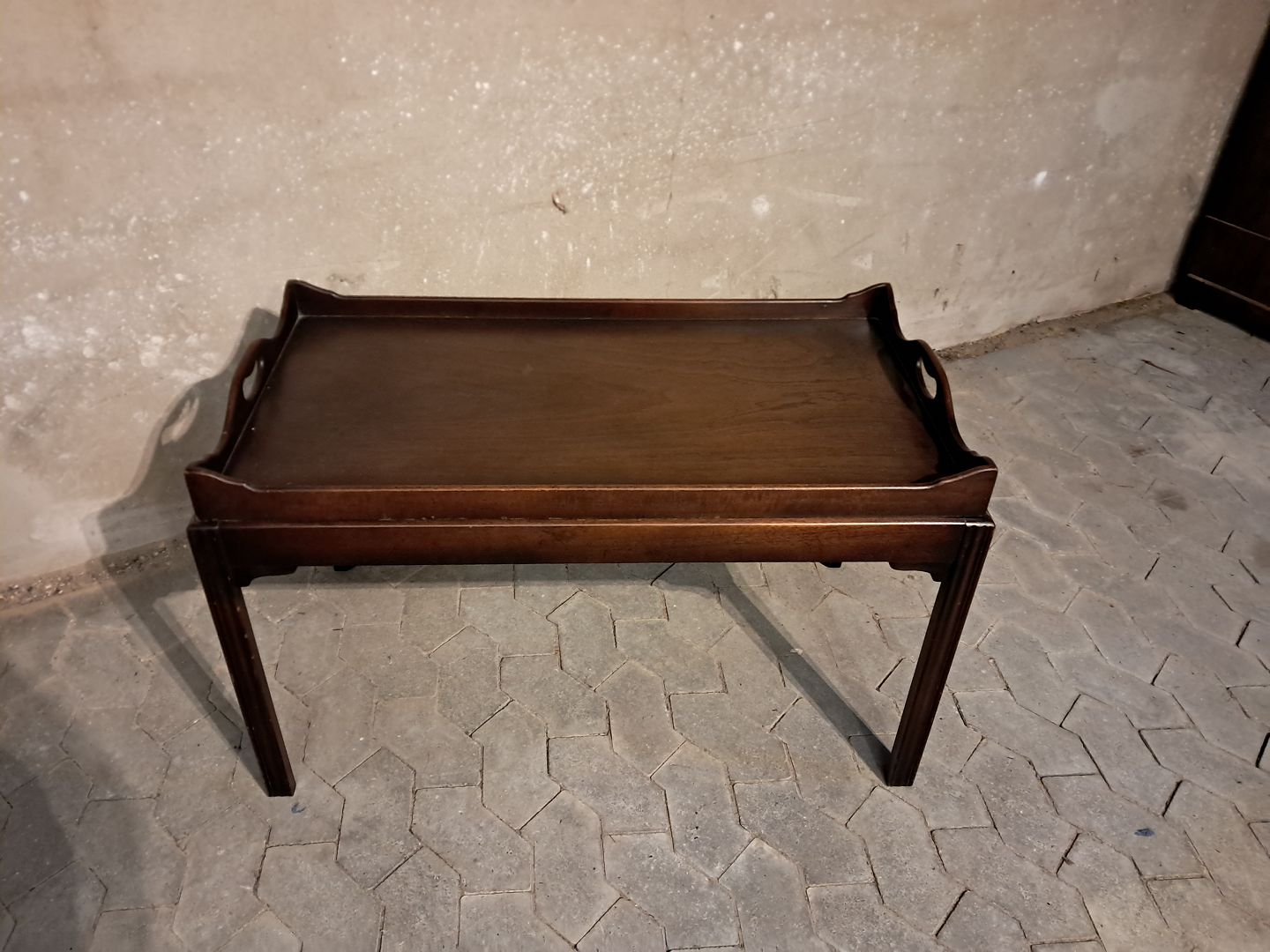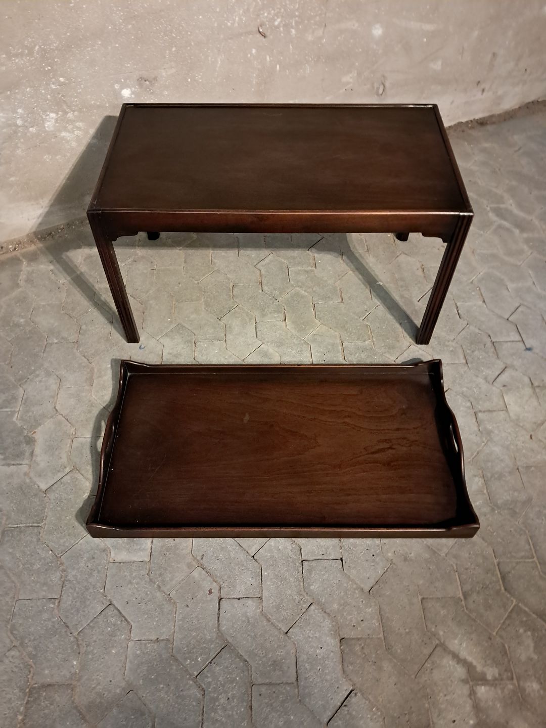 Bakkebord i fineret mahogni, fra 1980erne. Det har brugsspor. Højde 57cm Bredde 53cm Længde 97cm Emne nummer: 91671