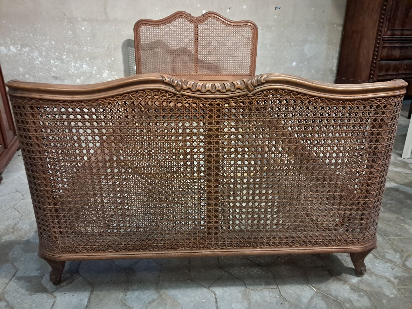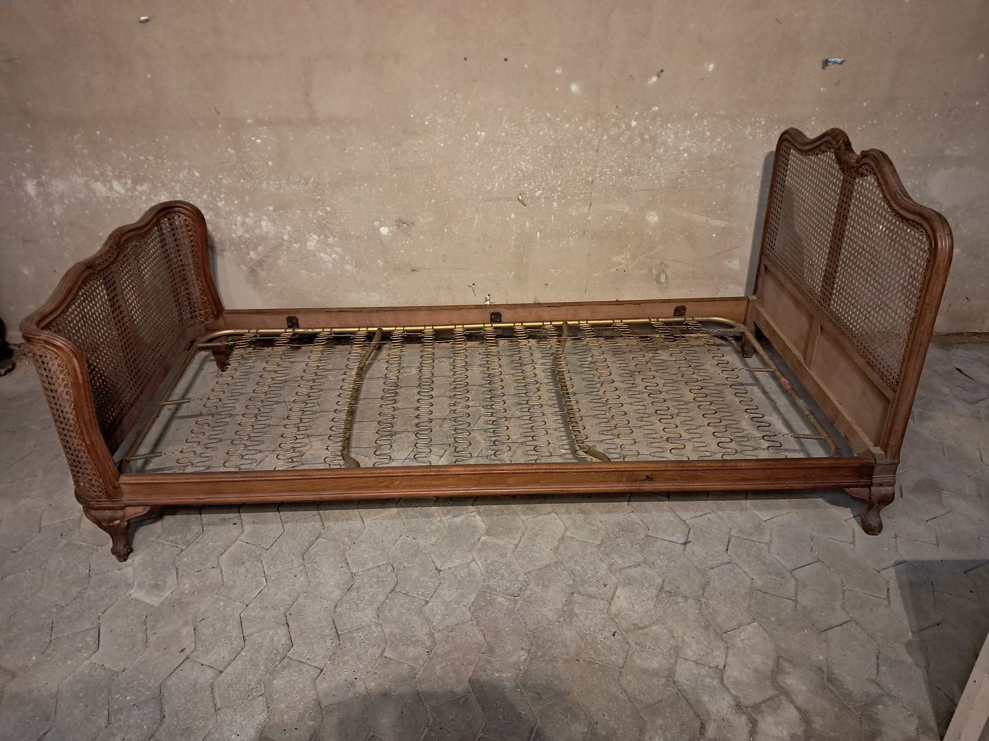 Seng i massivt bøgetræ med rørflet, fra 1950erne. Den har brugsspor og der medfølger ikke madras. Gavlhøjde 90cm og 64cm Bredde 96cm længde 198cm Madras mål : 190cm X 89cm Emne nummer: 91672