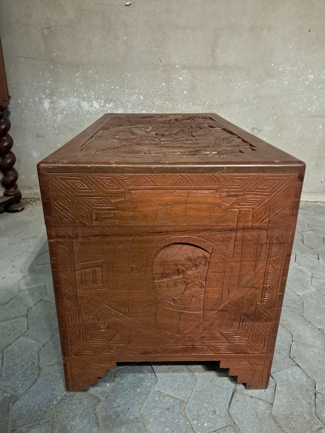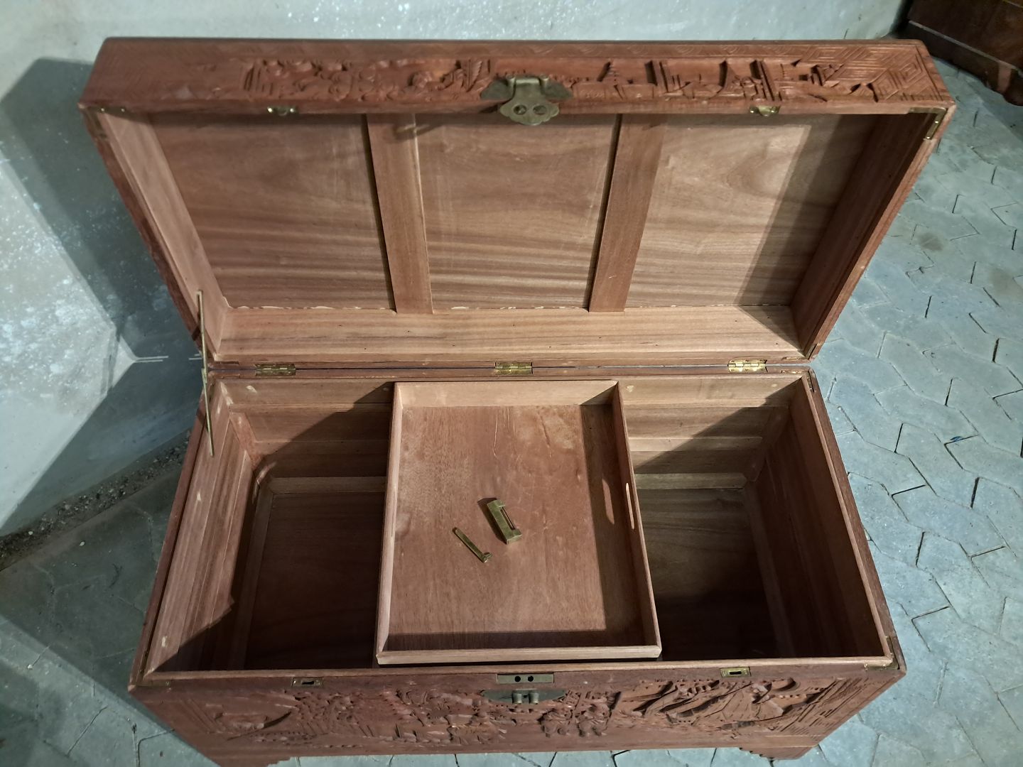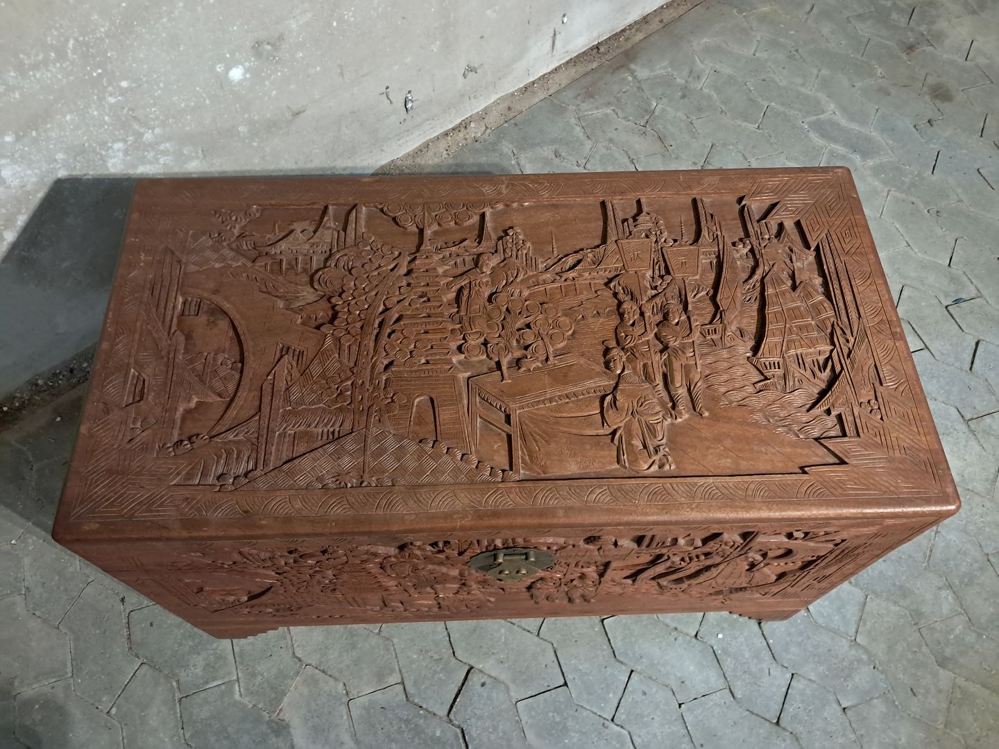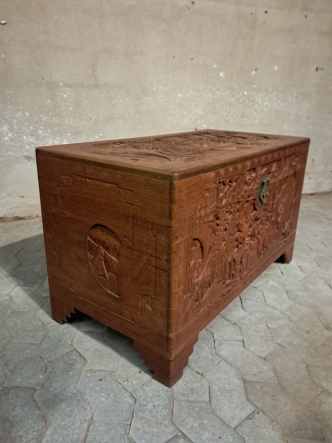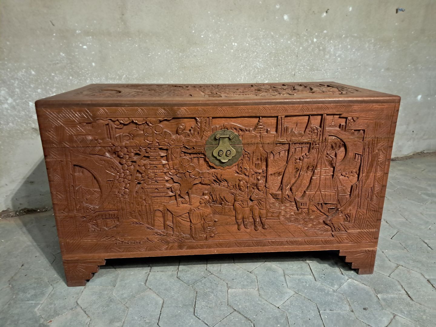 Kinesisk kiste i massivt kamfertræ, fra 1970erne. Den har brugsspor. Højde 61cm Bredde 104cm Dybde 53cm Emne nummer: 91687