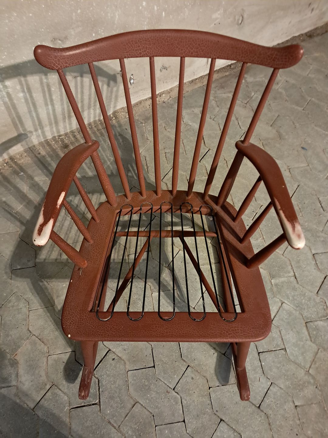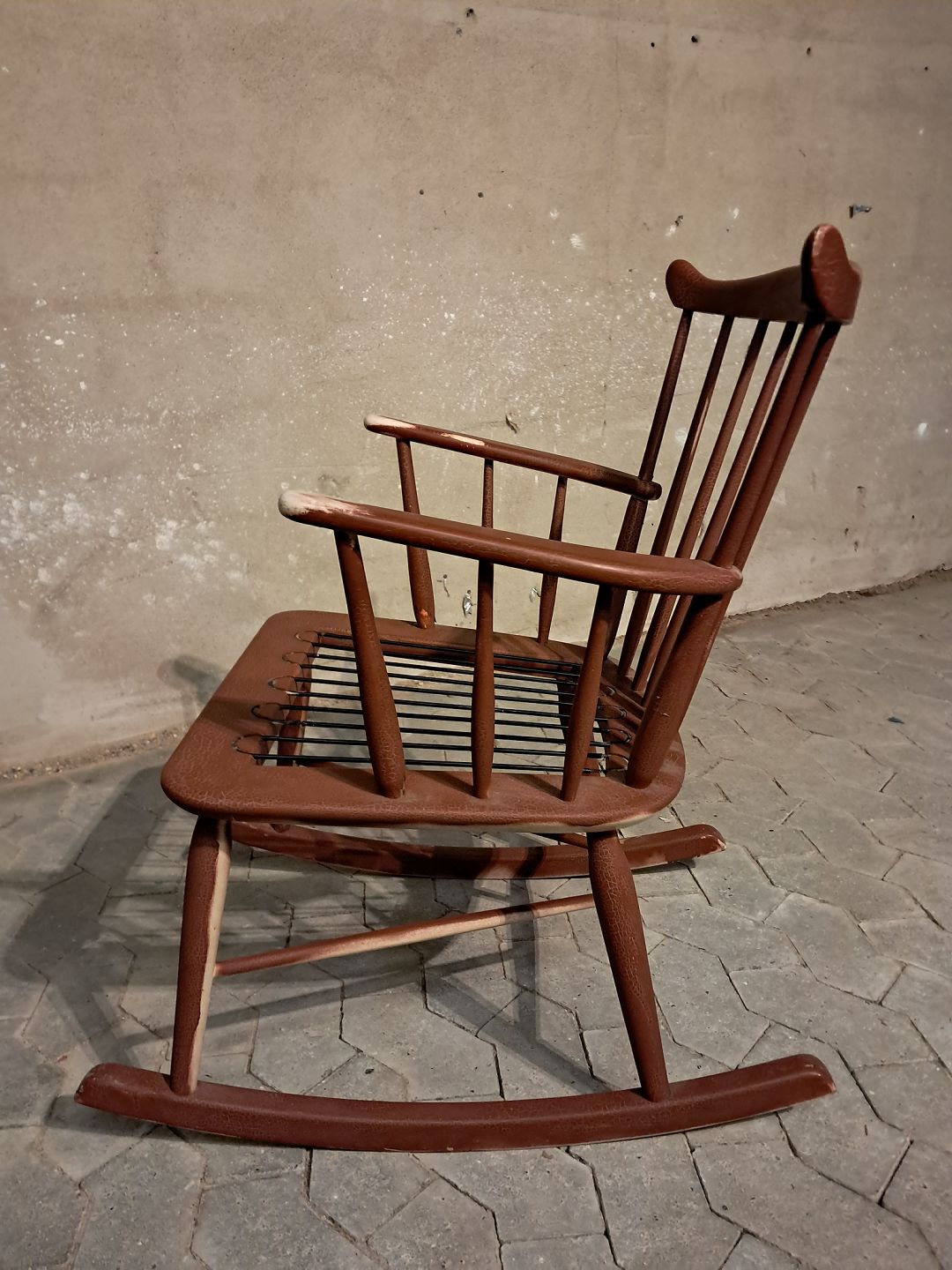 Malet gyngestol fra 1970erne. Der medfølger ikke hynde og den trænger til, at blive peppet op. Ryghøjde 81cm Sædehøjde 41cm Emne nummer: 91689
