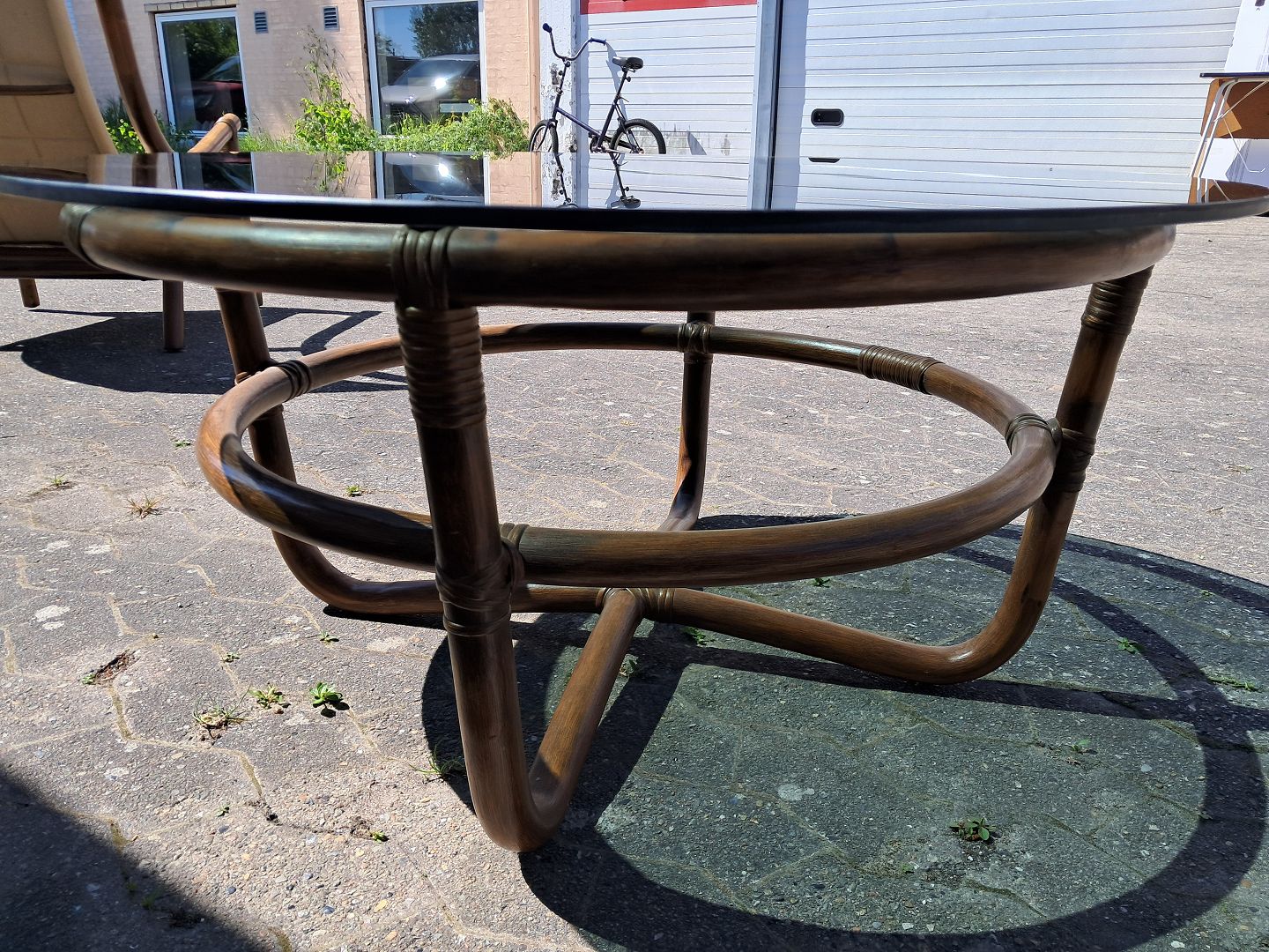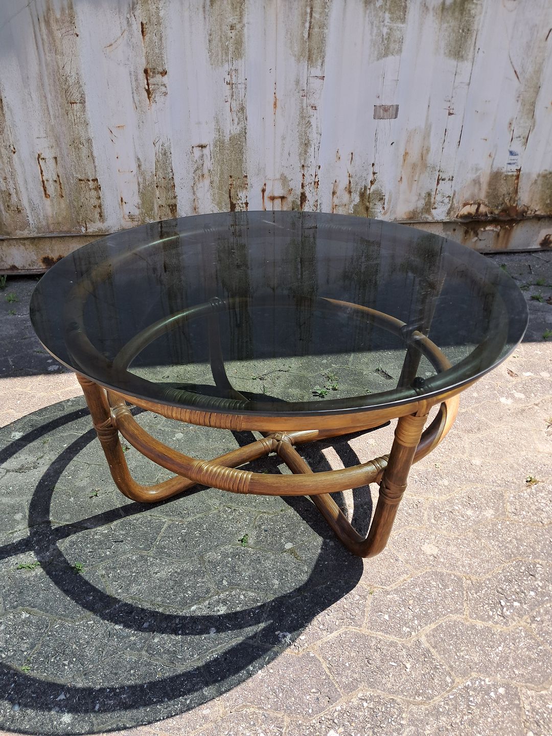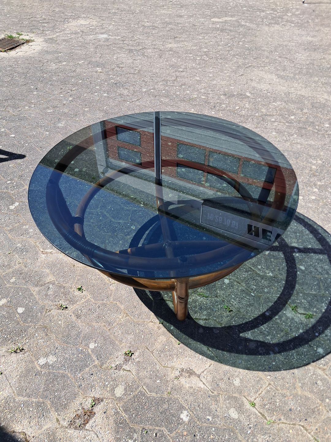 Sofabord i bambus med glasplade, fra 1990erne. Det har brugsspor. Højde 46cm Diameter 95cm Se emne nr. 76746 og 76747 Emne nummer: 76745