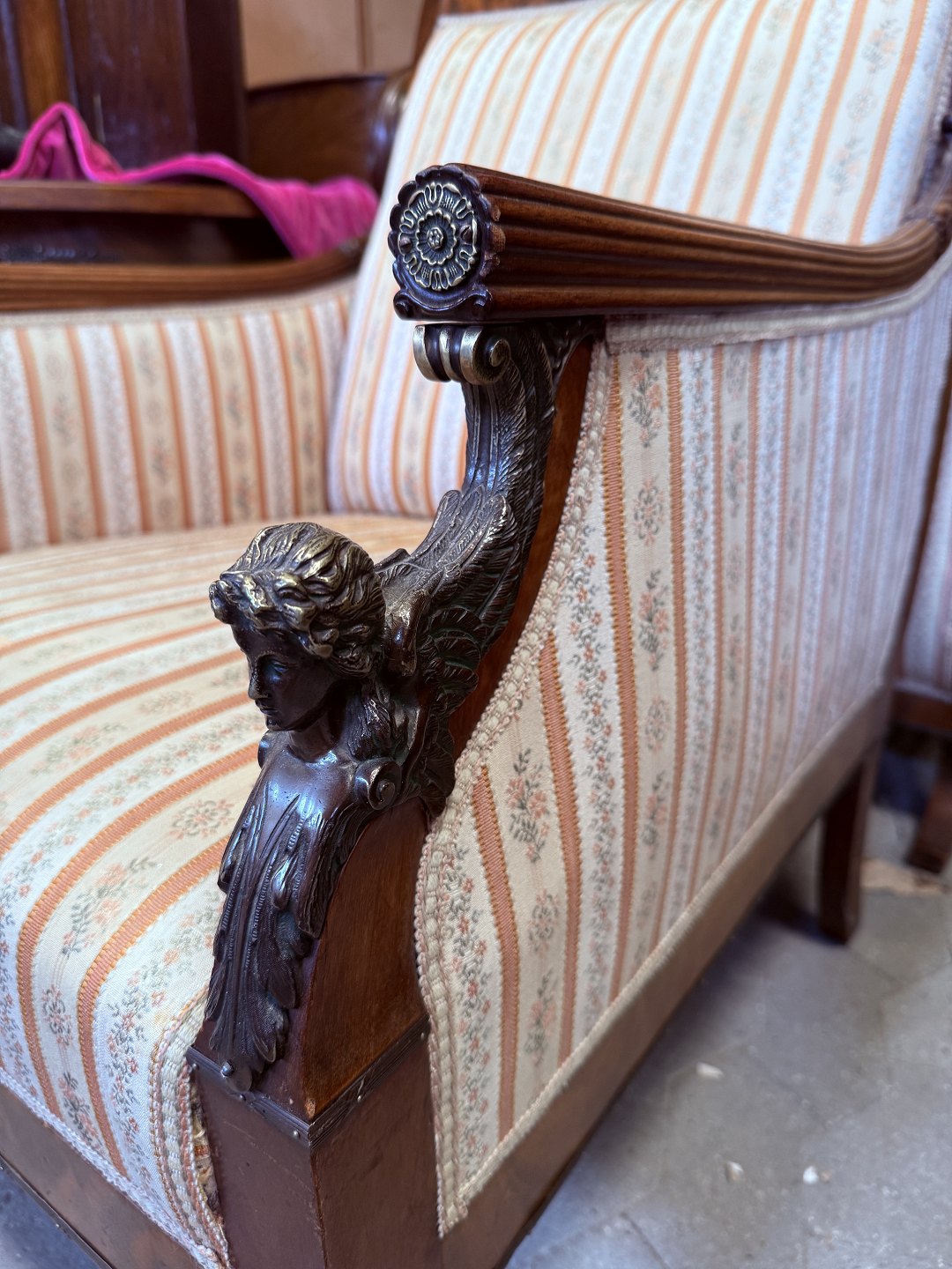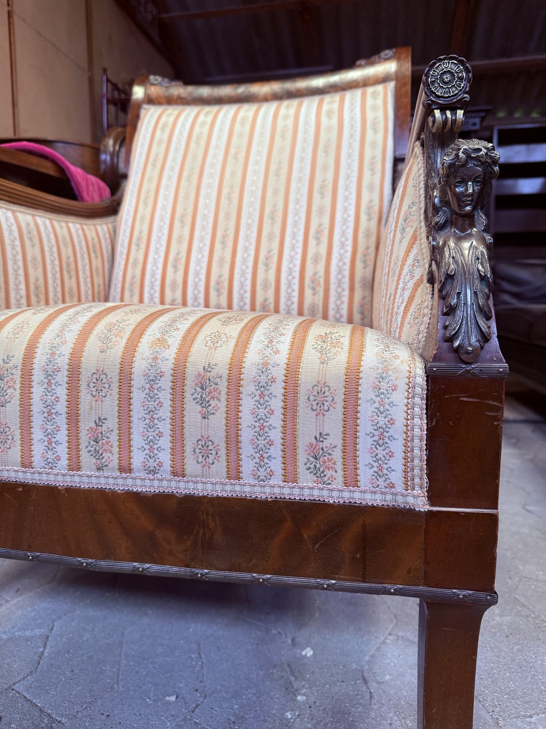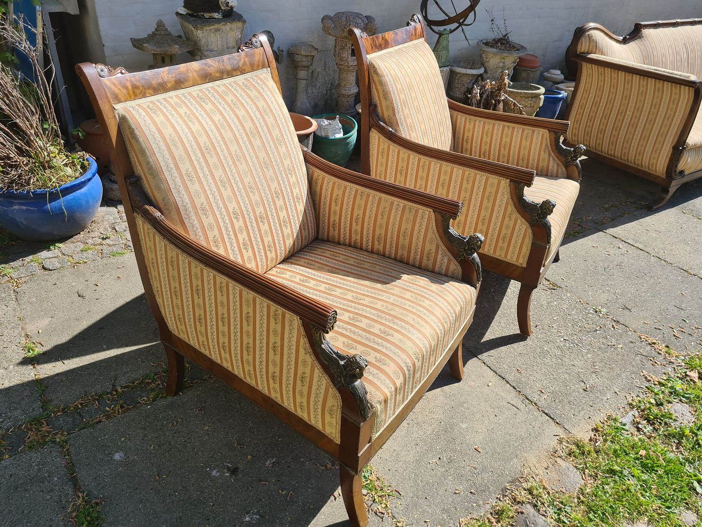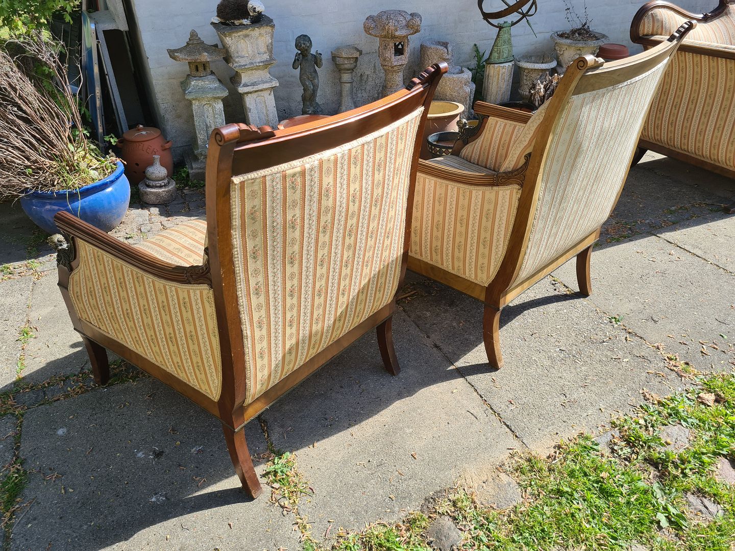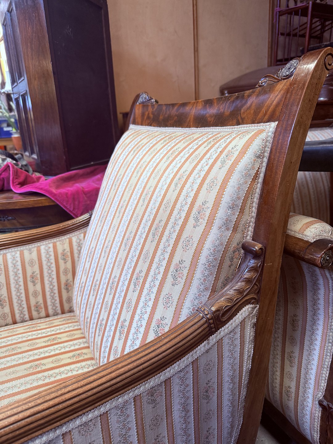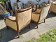 2 Lænestole fra 1930'erne. Overpolstret på stel af nød og birk. Fremstår pæne og velholdte uden nævneværdige brugsspor. Lænestolen er en del af sofa sættet med nr. 80860. Højde 95 cm. Bredde 65 cm. Dybde 80 cm. Sædehøjde 40 cm. Emne nummer: 80862