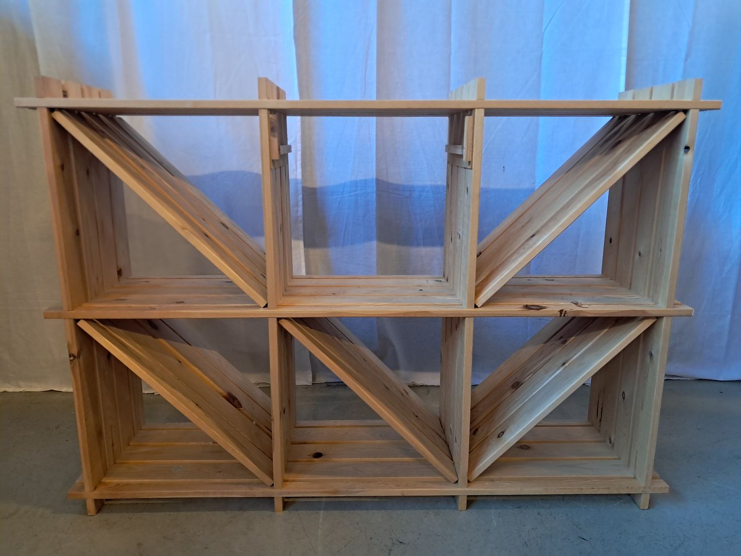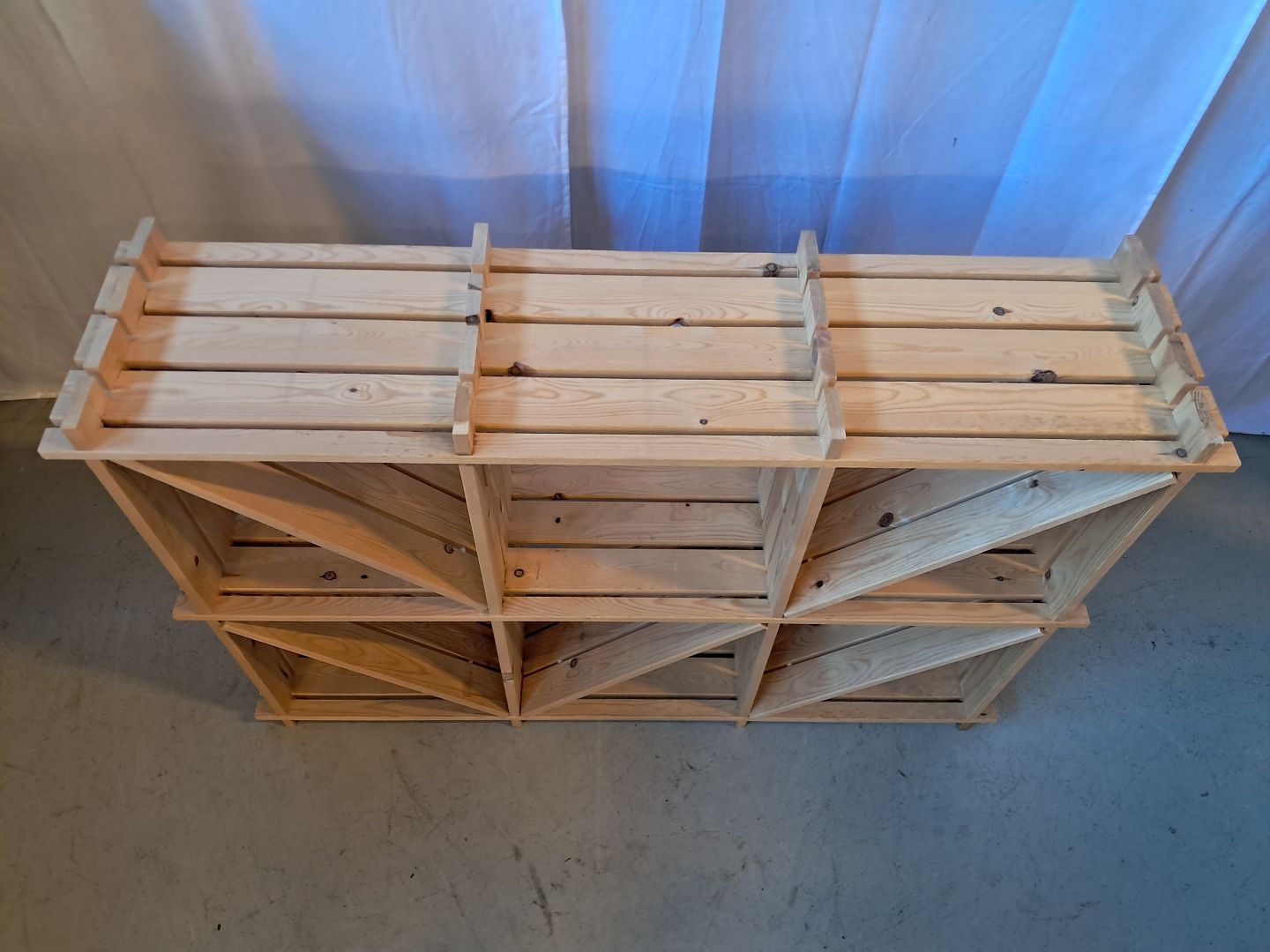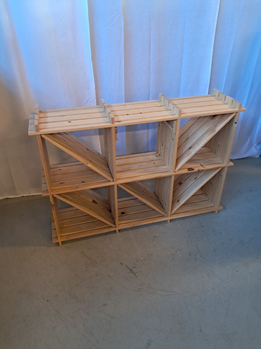 Reol i massivt fyrretræ, fra 2000erne. Den har brugsspor, mangler en skuffe oo denene skråhylde er defekt. Højde 82cm Bredde 119cm Dybde 29cm Emne nummer: 76782