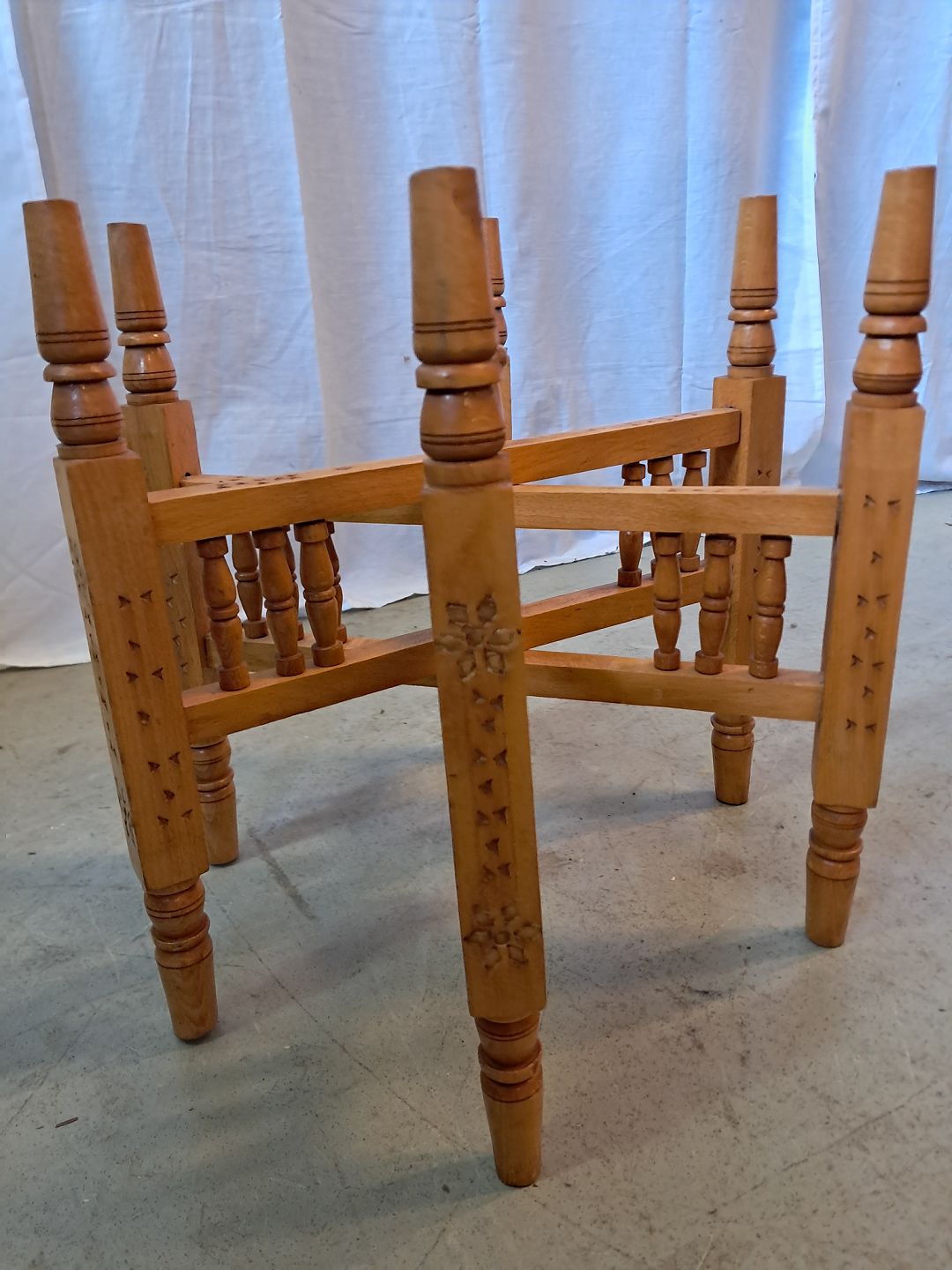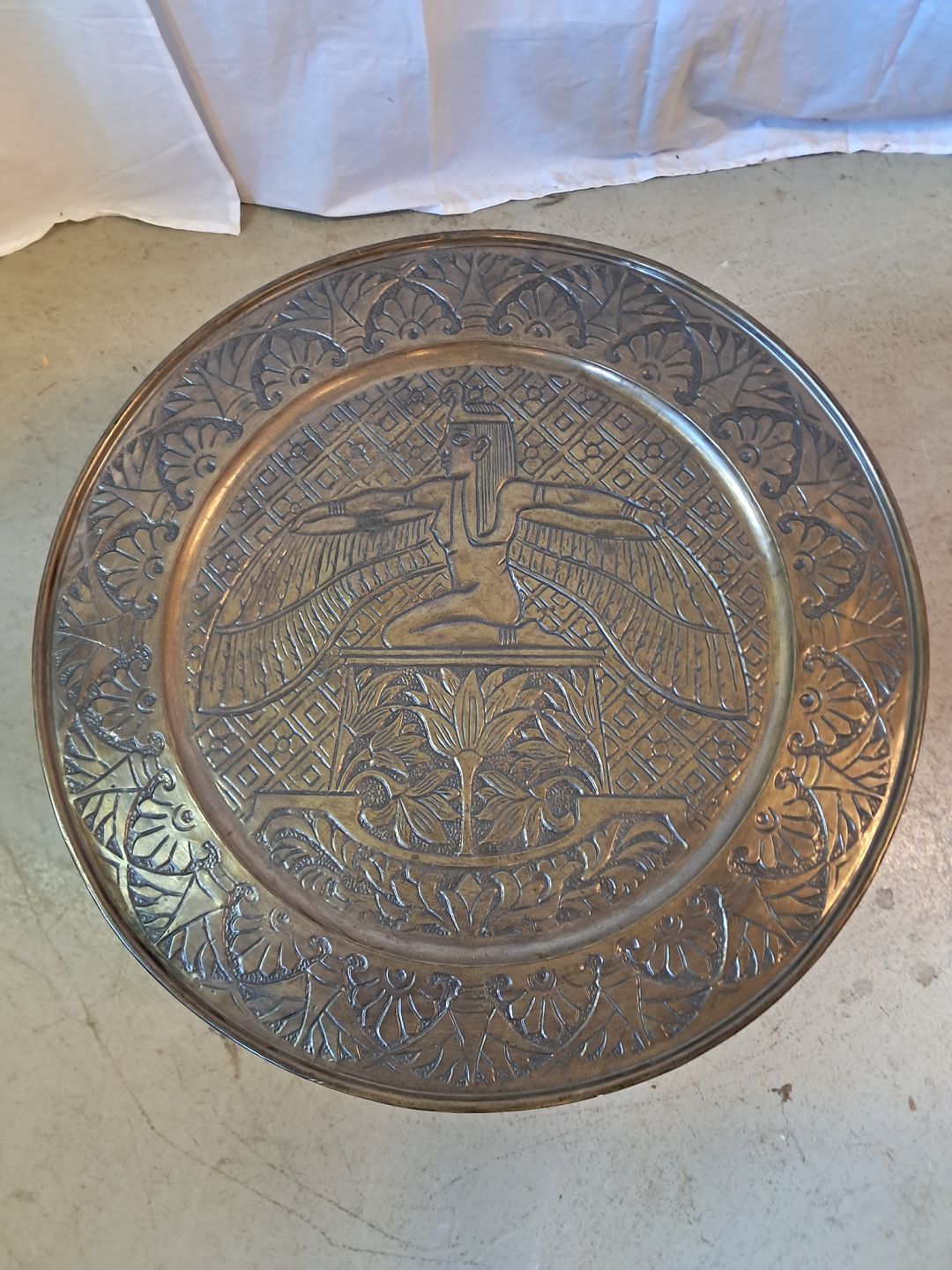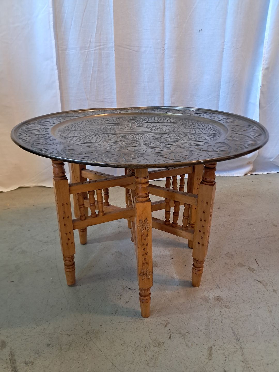 Egyptisk sidebord i massivt træ med metalplade, fra 1990erne. Det har brugsspor. Højde 40cm Diameter 57cm Emne nummer: 76807