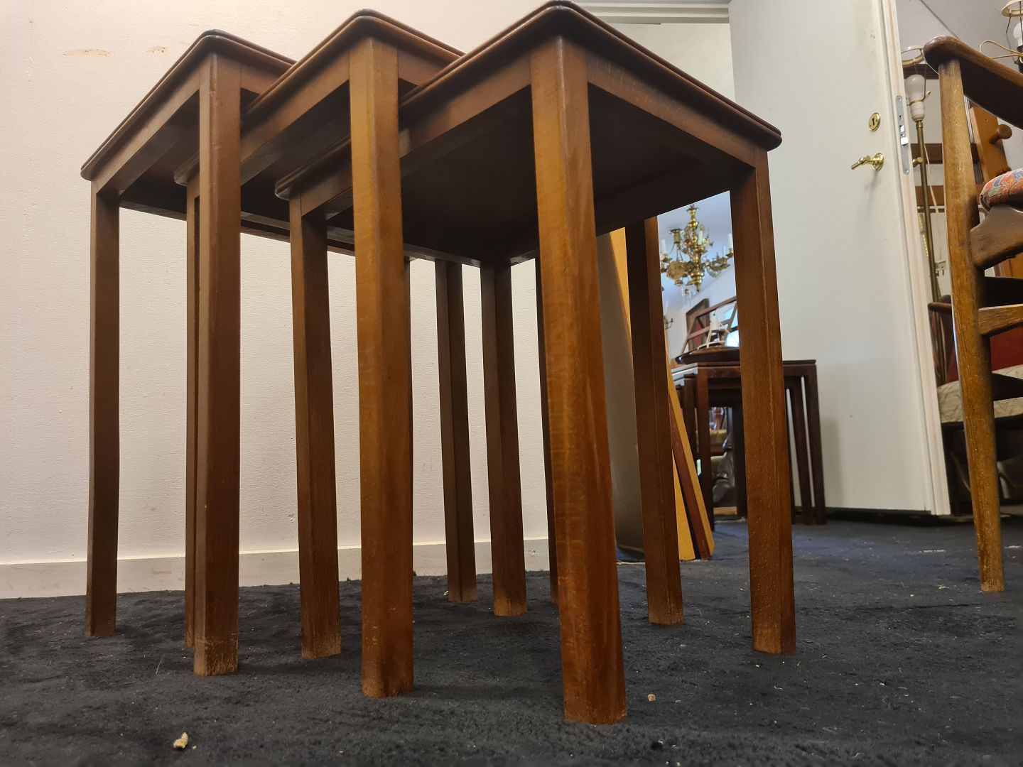 Dansk møbelproducent sæt indskudsborde i fineret/bejdset mahogni. Fremstillet ca. 1950'erne. Pæn brugt stand. Mål: H. 54 cm. B. 46 cm. D. 38 cm. Emne nummer: 80878