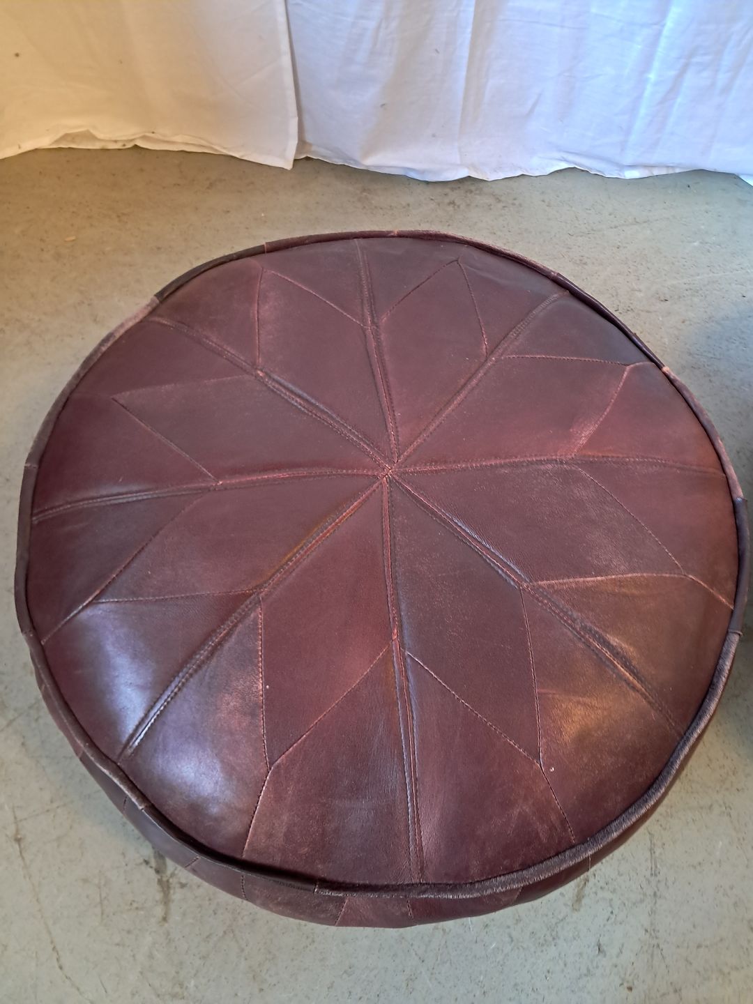2 Marokkopuder i læder fra 1990erne. De har defekter. Højde 27cm Diameter 68cm Højde 22cm Diameter 60cm Emne nummer: 76838