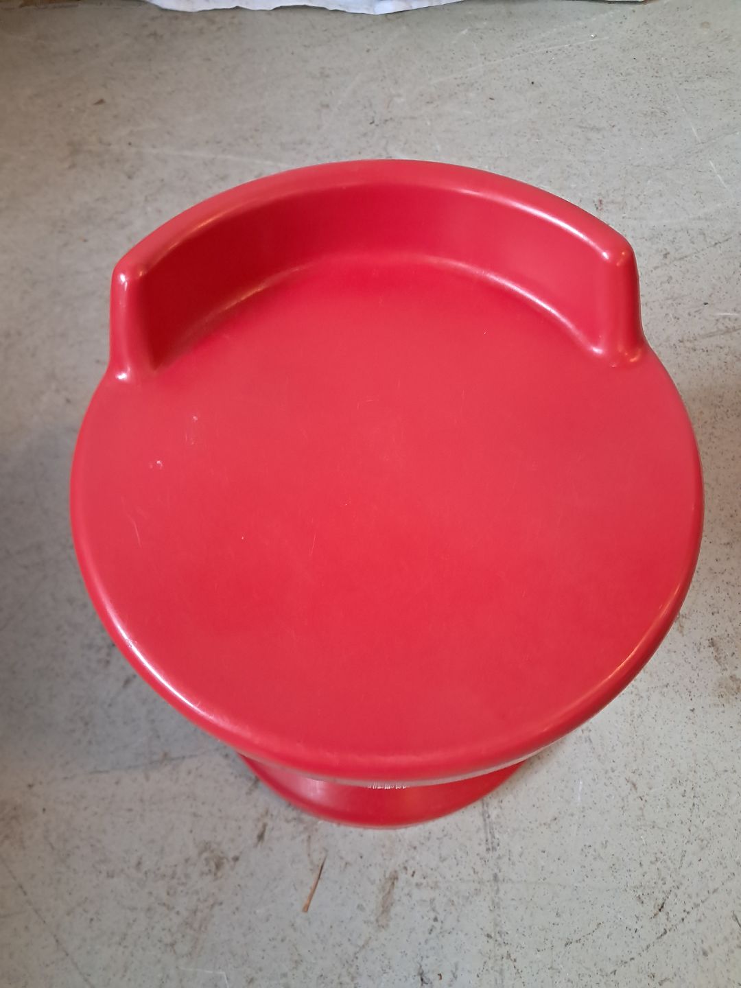 Plast skammel, made in Denmark, fra 1980erne. Den har brugsspor. Højde 26cm Diameter 24cm Emne nummer: 76844