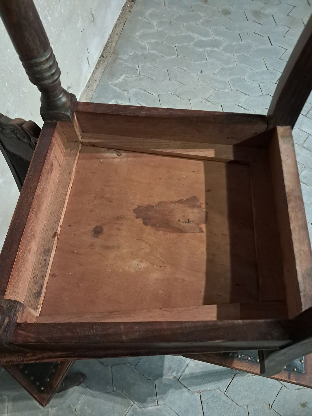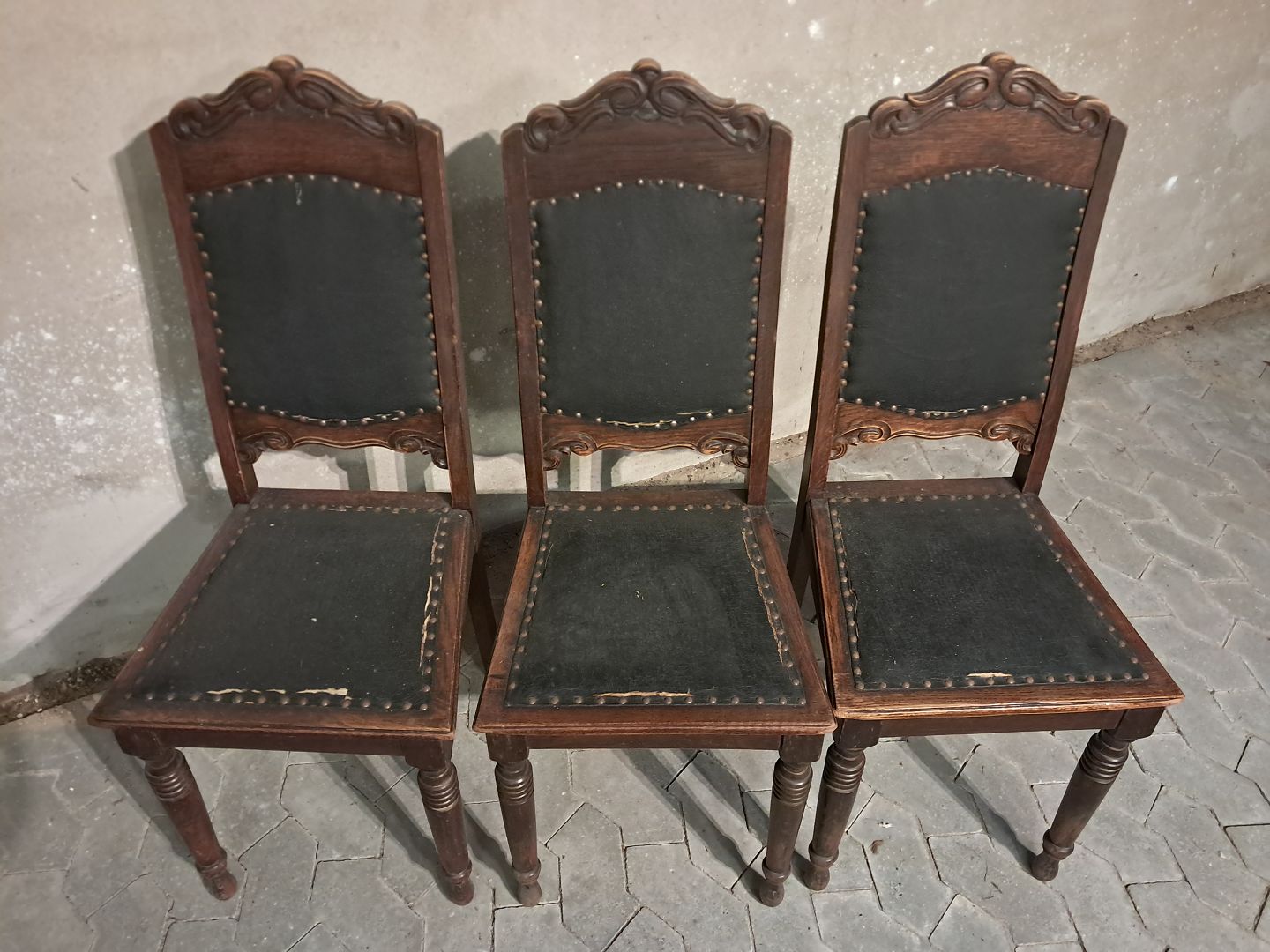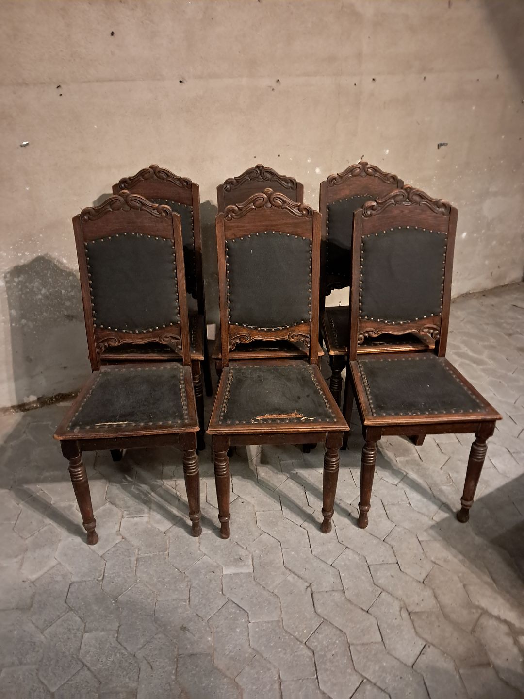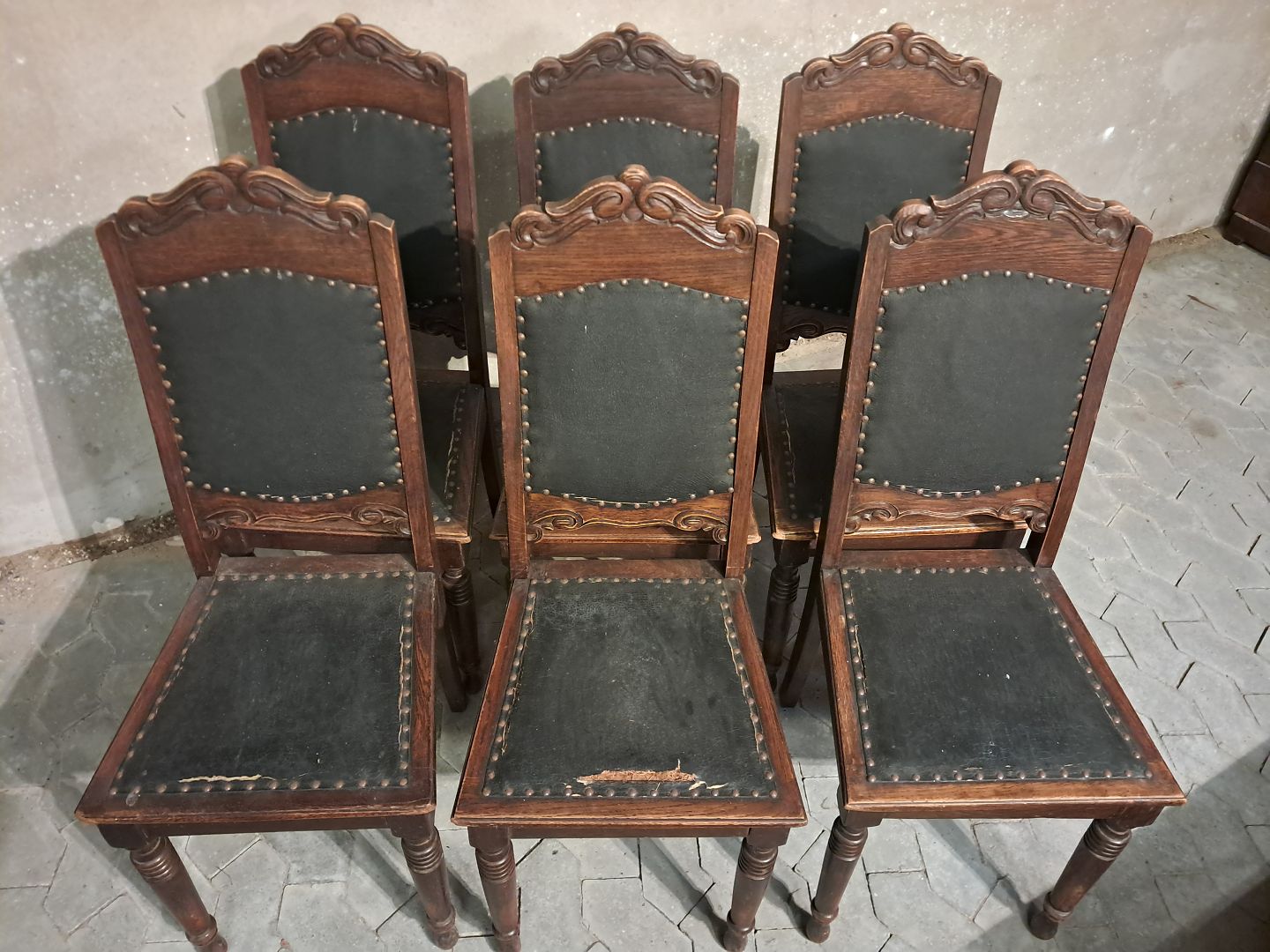 6 Stole i massivt egetræ, fra 1910erne. De har brugsspor og betrækket er defekt. Ryghøjde 106cm Sædehøjde 46cm Emne nummer: 91715