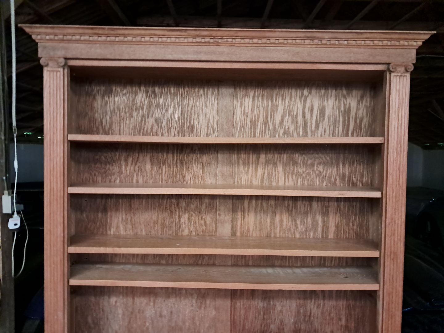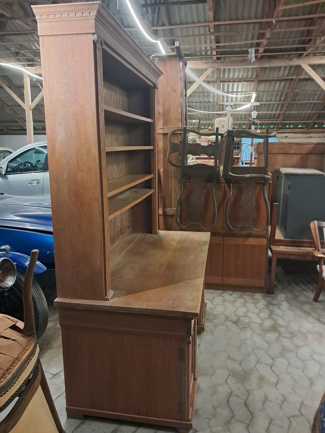 Skrivebord i fineret og massivt egetræ, fra 1920erne. Det har brugsspor. Skrivebord : Højde 77cm Bredde 154cm Dybde 77cm Højde fra gulv til underkant 60cm Reol : Højde 141cm Bredde 147cm Dybde 32cm, Total højde 218cm Emne nummer: 91729