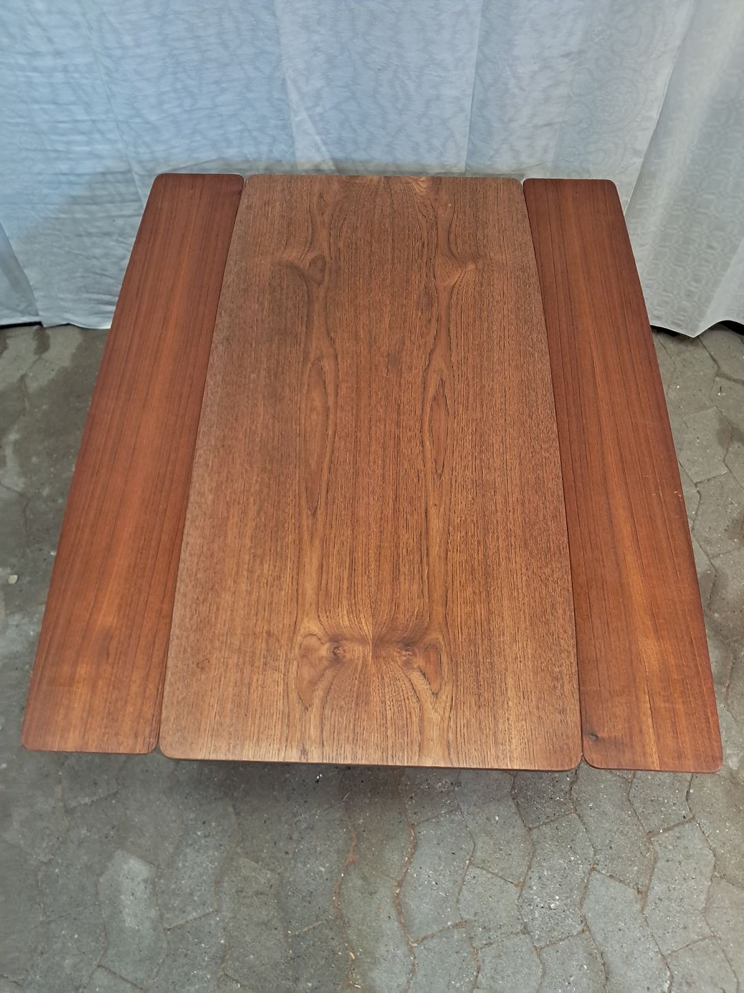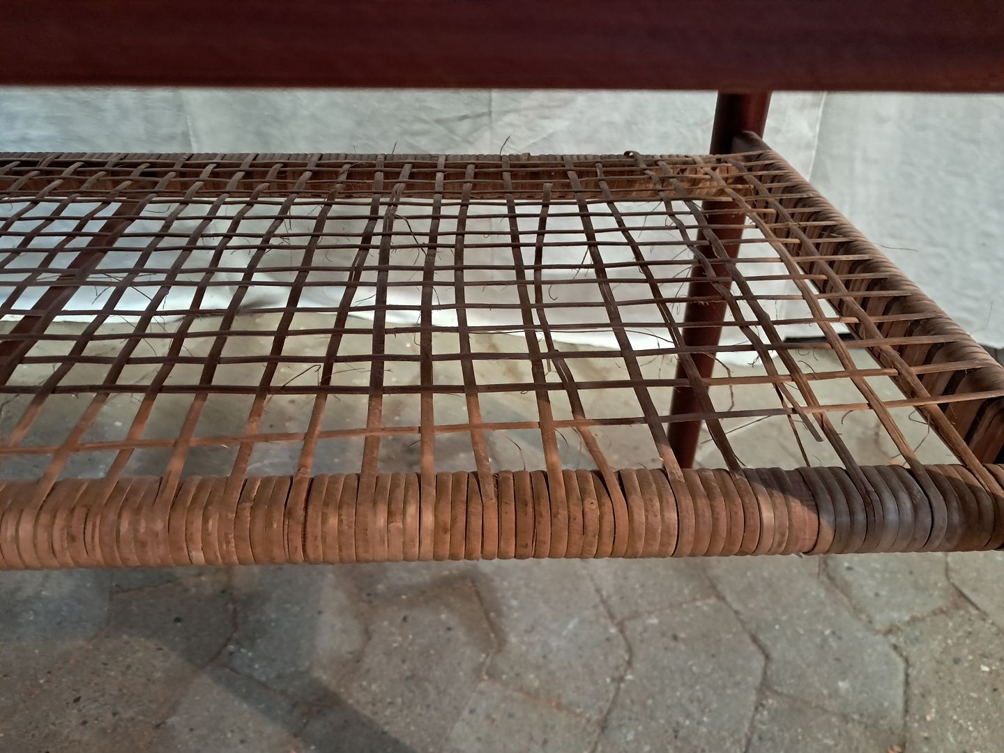Sofabord i fineret teaktræ med hollandsk udtræk, fra 1960erne. Det har brugsspor og fletten på hylden er defekt. (se foto) Højde 60cm Længde 106cm Bredde 54cm Bredde med udtræk 89cm Emne nummer: 91761