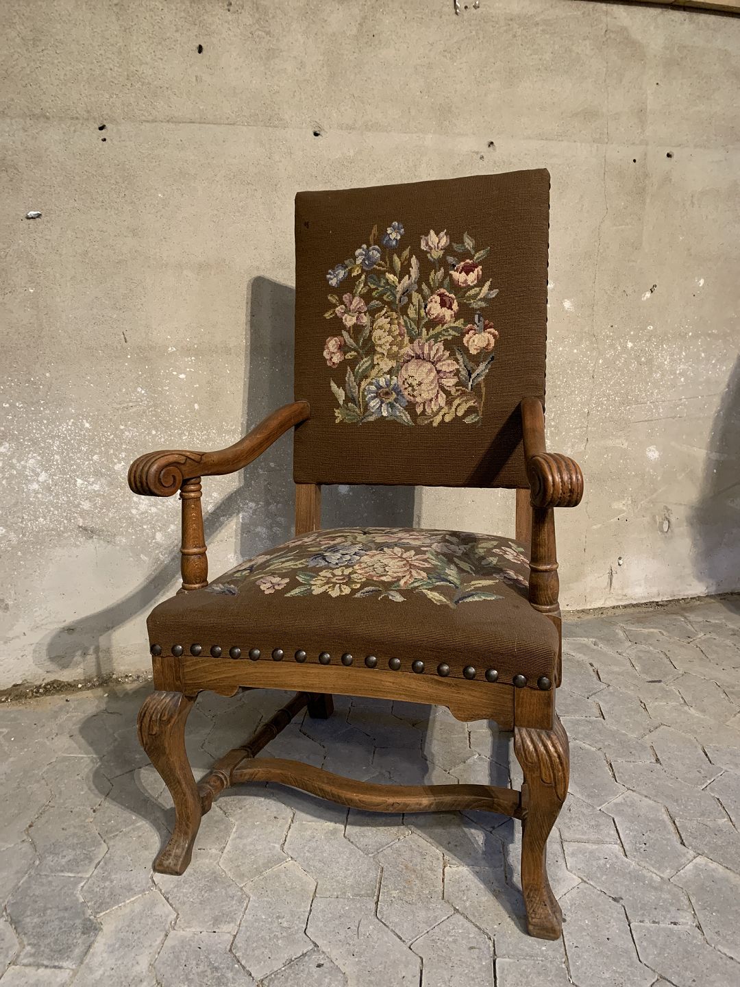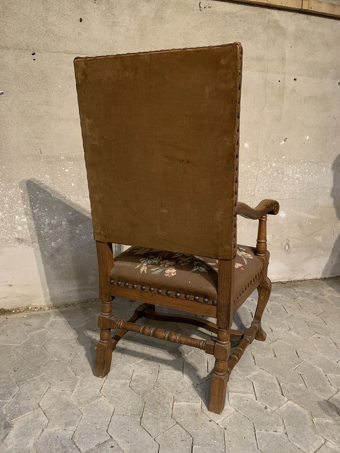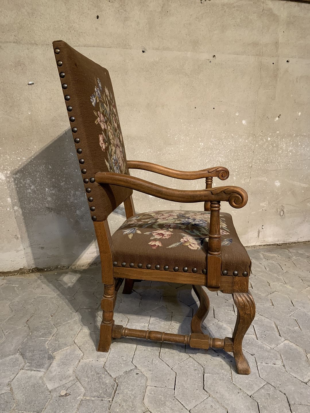 Armstol i massivt egetræ med broderet betræk, fra 1930erne. Den har brugsspor. Ryghøjde 115cm Sædehøjde 46cm Emne nummer: 91784