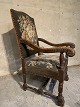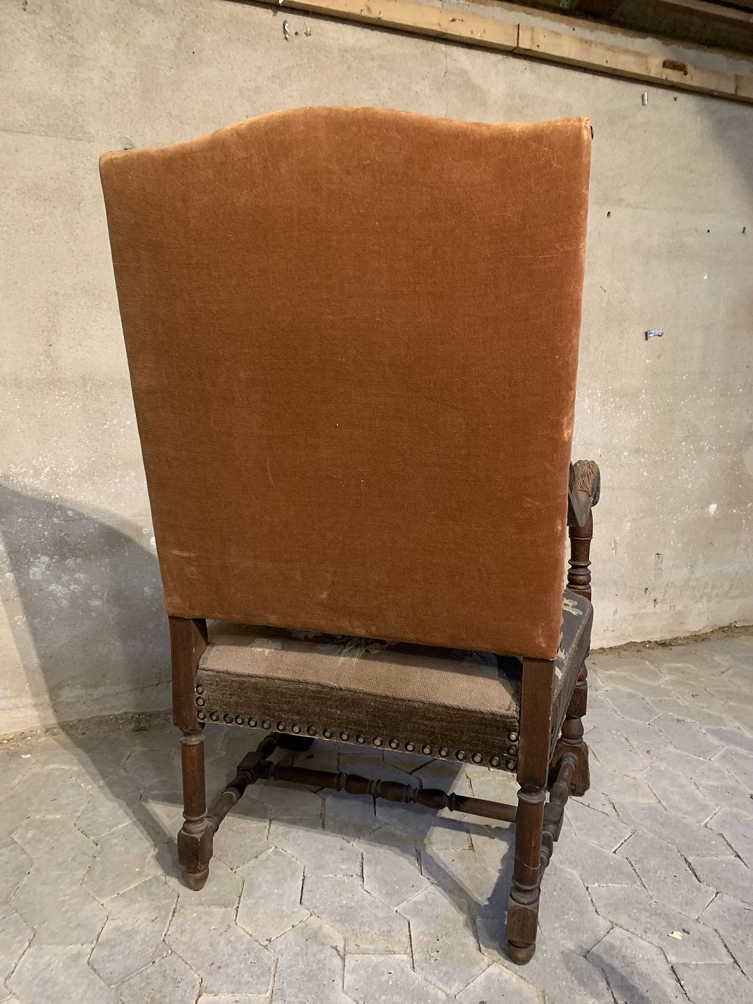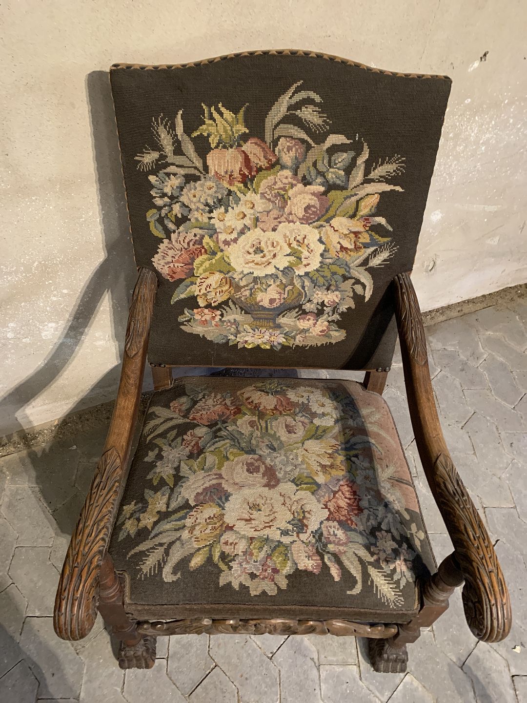 Armstol i massivt egetræ med broderet betræk, fra 1930erne. Den har brugsspor. Ryghøjde 113cm Sædehøjde 45cm Emne nummer: 91787
