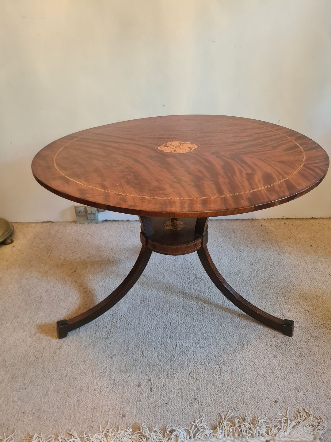 Rundt sofabord fra 1920'erne i mahogni og med entarsia. Pladen er lettere bøjet, og kan tages af understellet. Ellers fremstår bordet uden større brugsspor. Højde 64 cm. Diameter 93 cm. Emne nummer: 80890