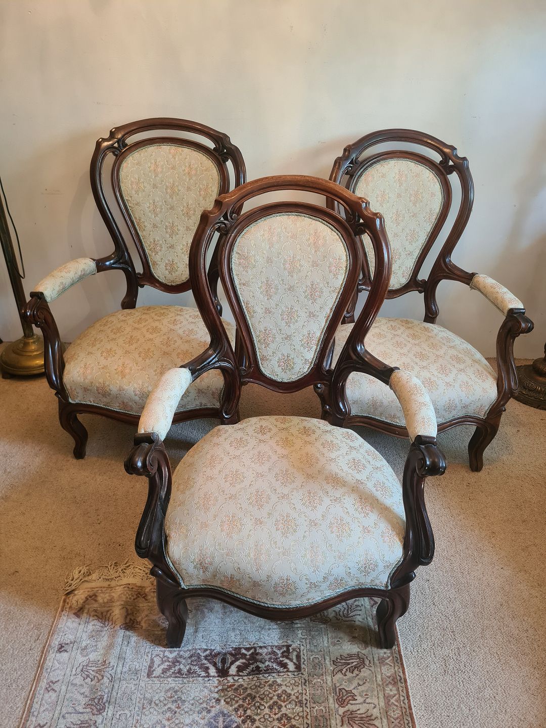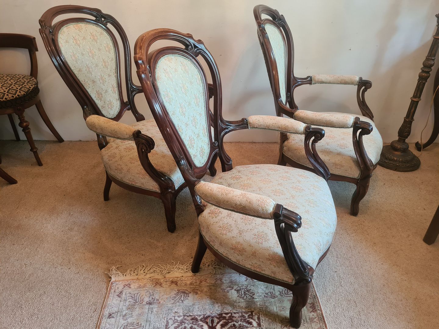 3 Rokokostole fra 1920'erne i mahogni og med nyere polstring. Fremstår pæne og solide uden nævneværdige brugsspor. Højde 98 cm. Bredde 68 cm. Dybde 75 cm. Sædehøjde 41 cm. Emne nummer: 80891