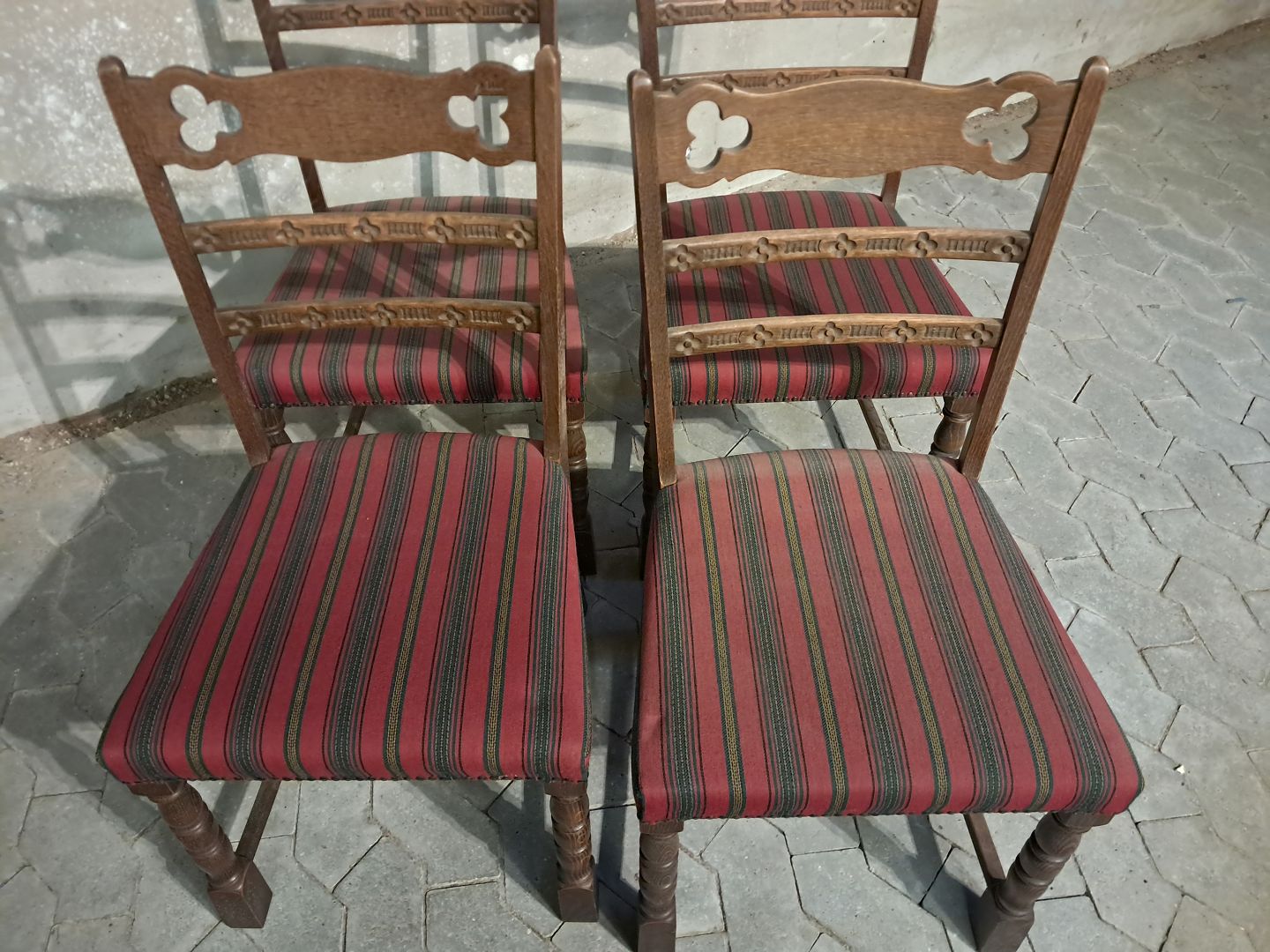4 Stole i massivt egetræ, fra 1980erne. Betrækket er godt brugt. Ryghøjde 88cm Sædehøjde 45cm Emne nummer: 91806