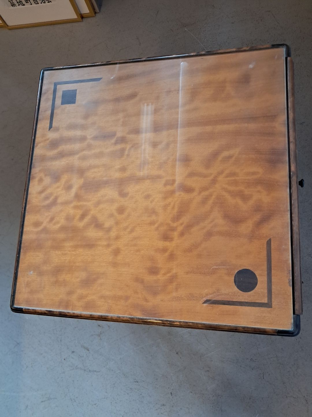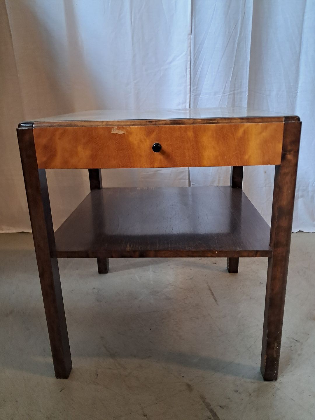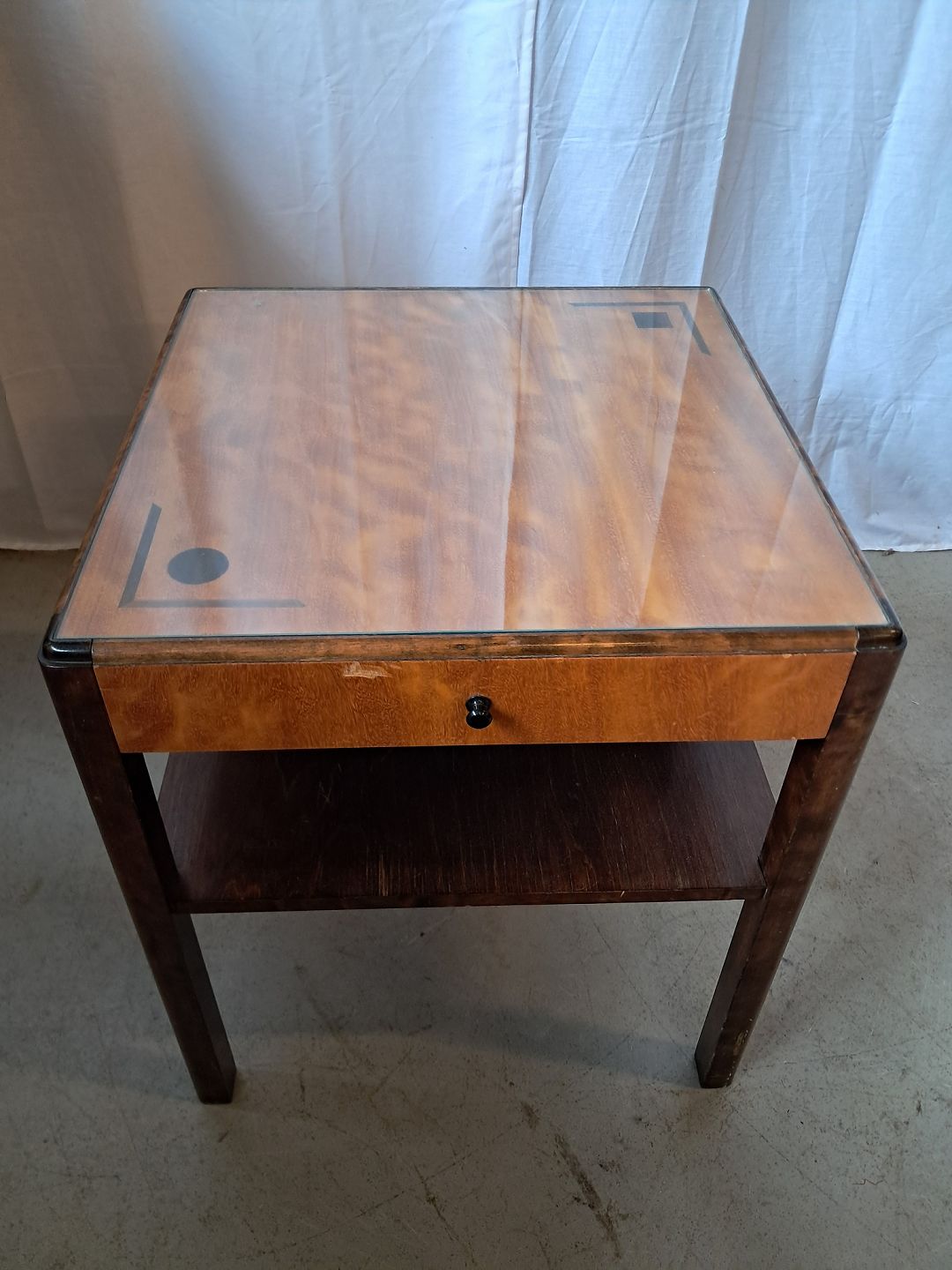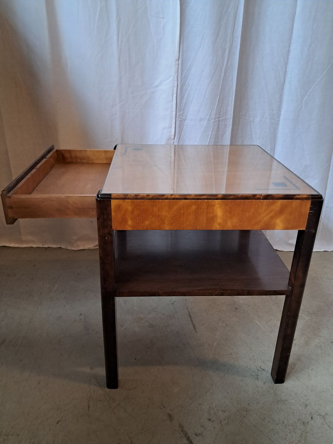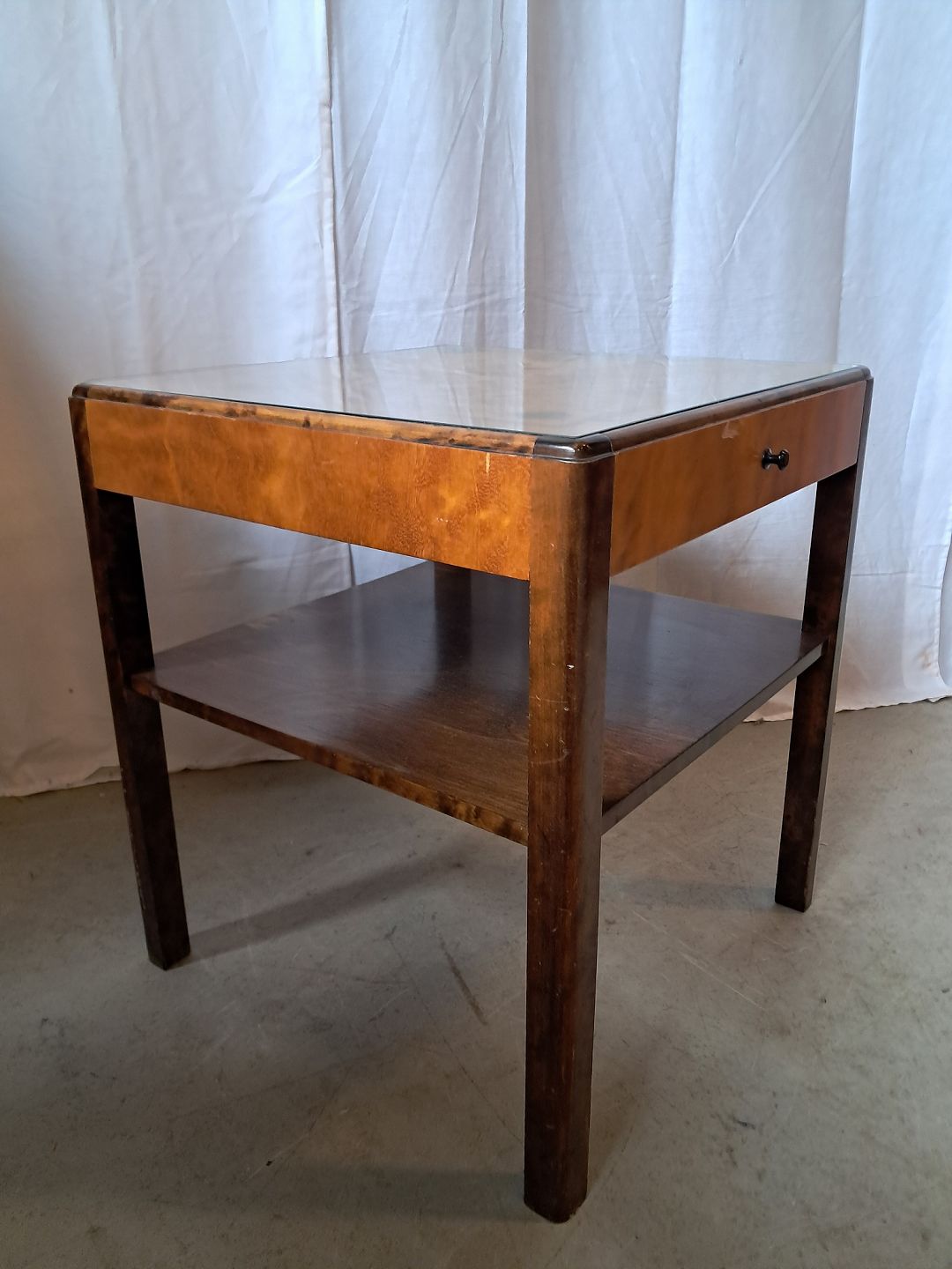 Lampebord i fineret birketræ med glasplade, fra 1930erne. Det har små brugsspor. Højde 56cm Bredde 48cm Dybde 48cm Emne nummer: 76872