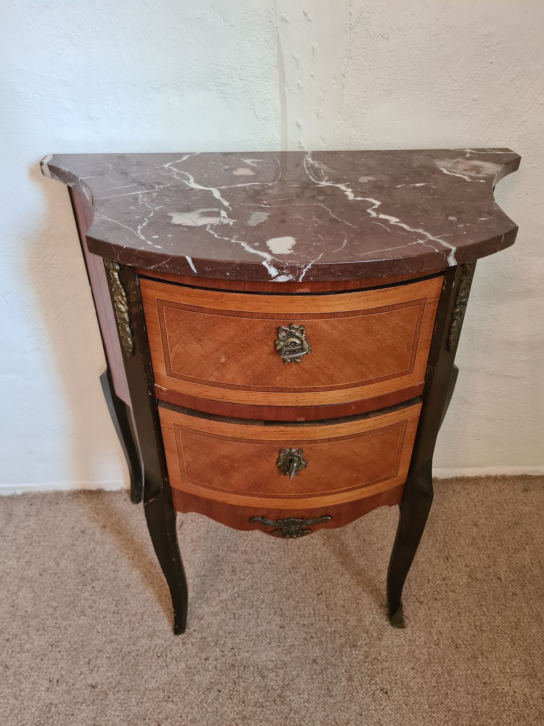 Kommode fra 1950'erne i finéret mahogni med marmor plade. Fremstår pæn og velholdt uden de store brugsspor. Dog mangler messingsko på venstre forben. (Billede) Højde 73 cm. Bredde 68 cm. Dybde 38 cm. Emne nummer: 80898